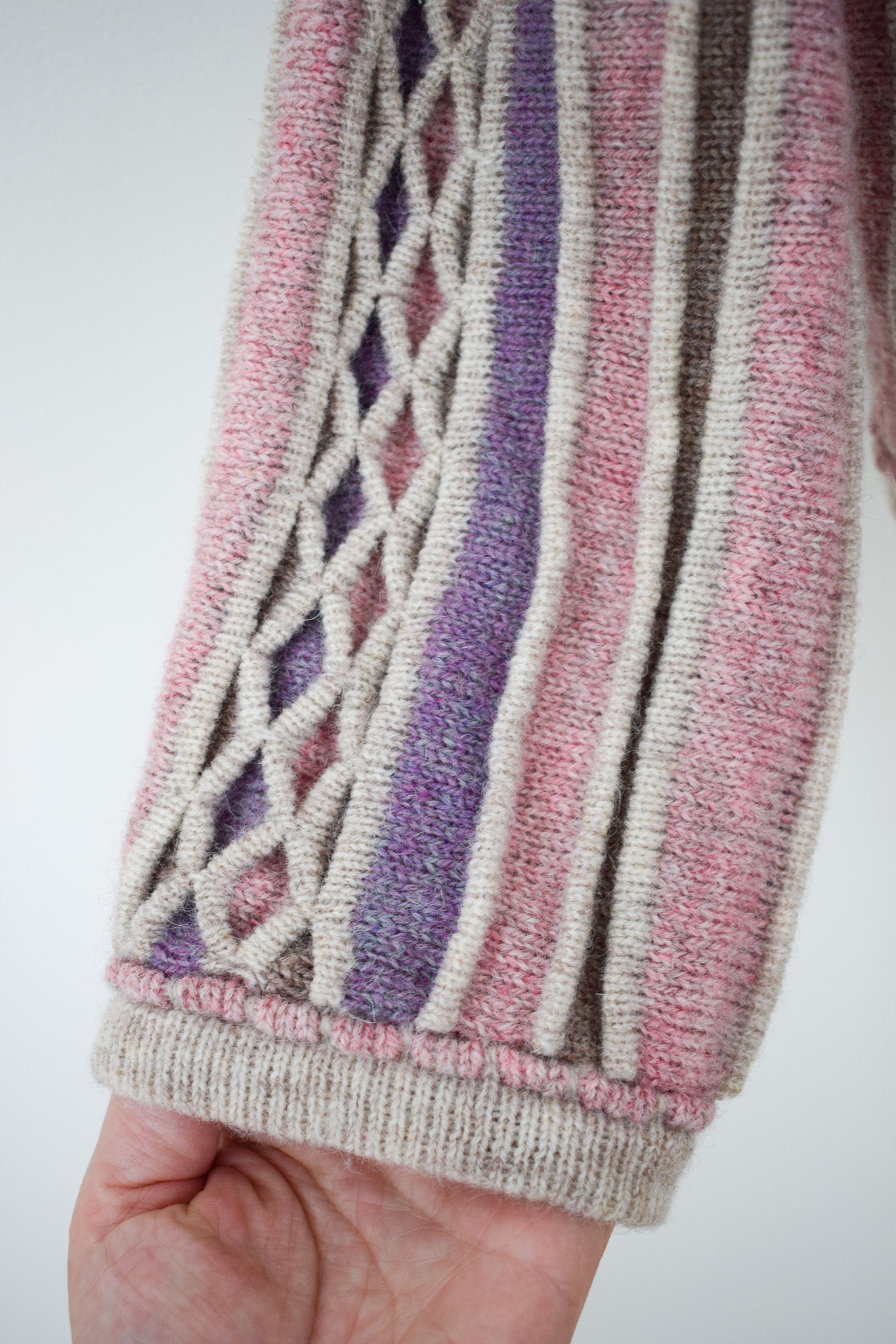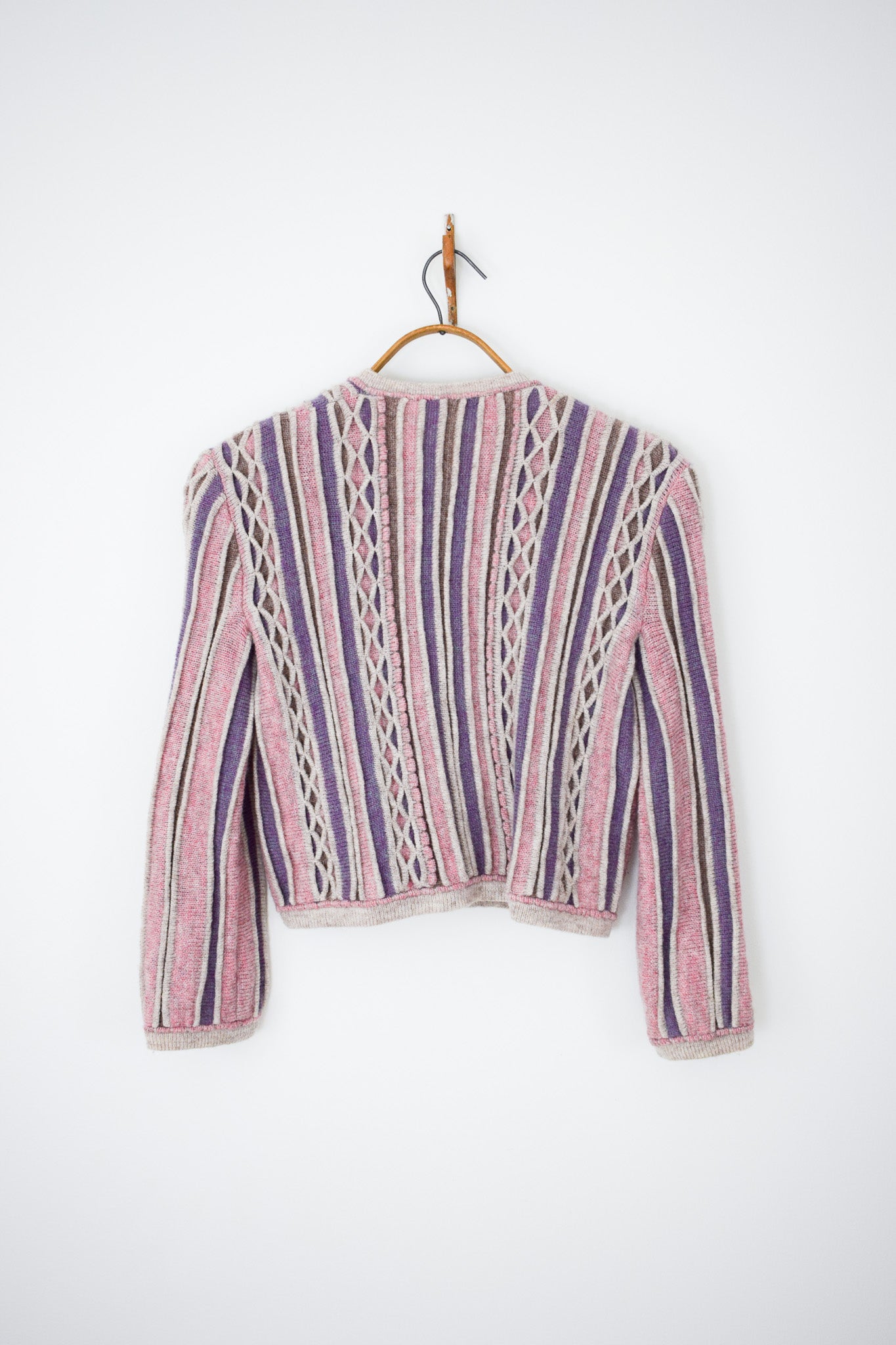 folk style in shades of soft pink, purple, and ecru. highly detailed/dimensional knit design. slightly cropped boxy fit. clear snaps close the front.