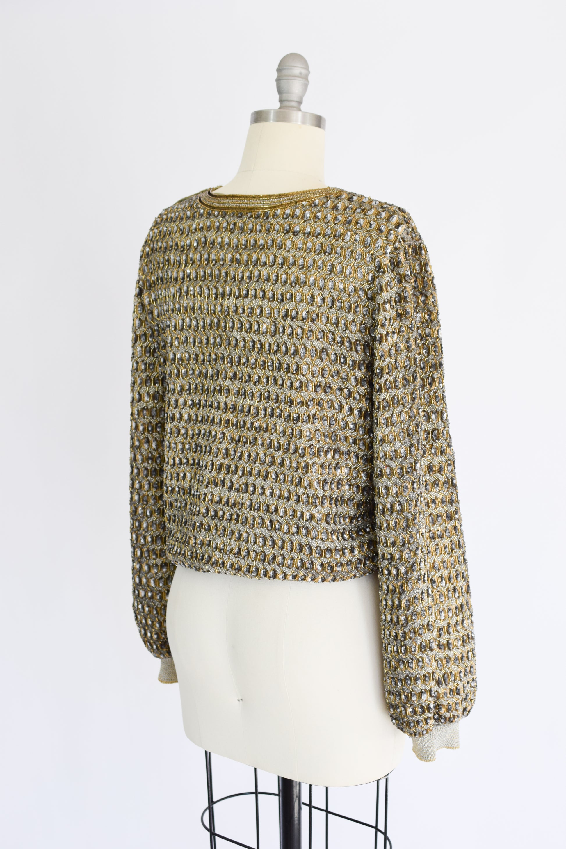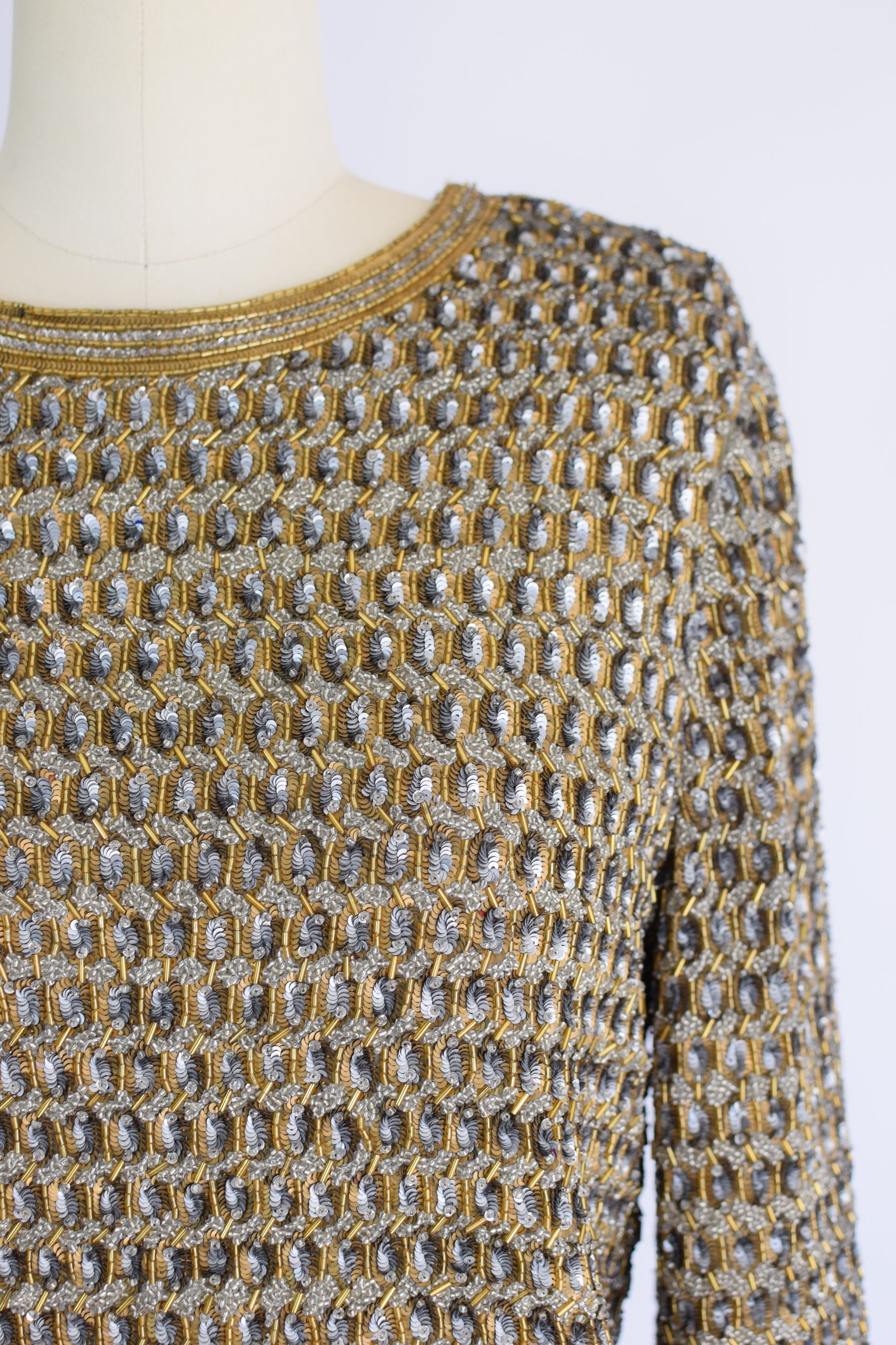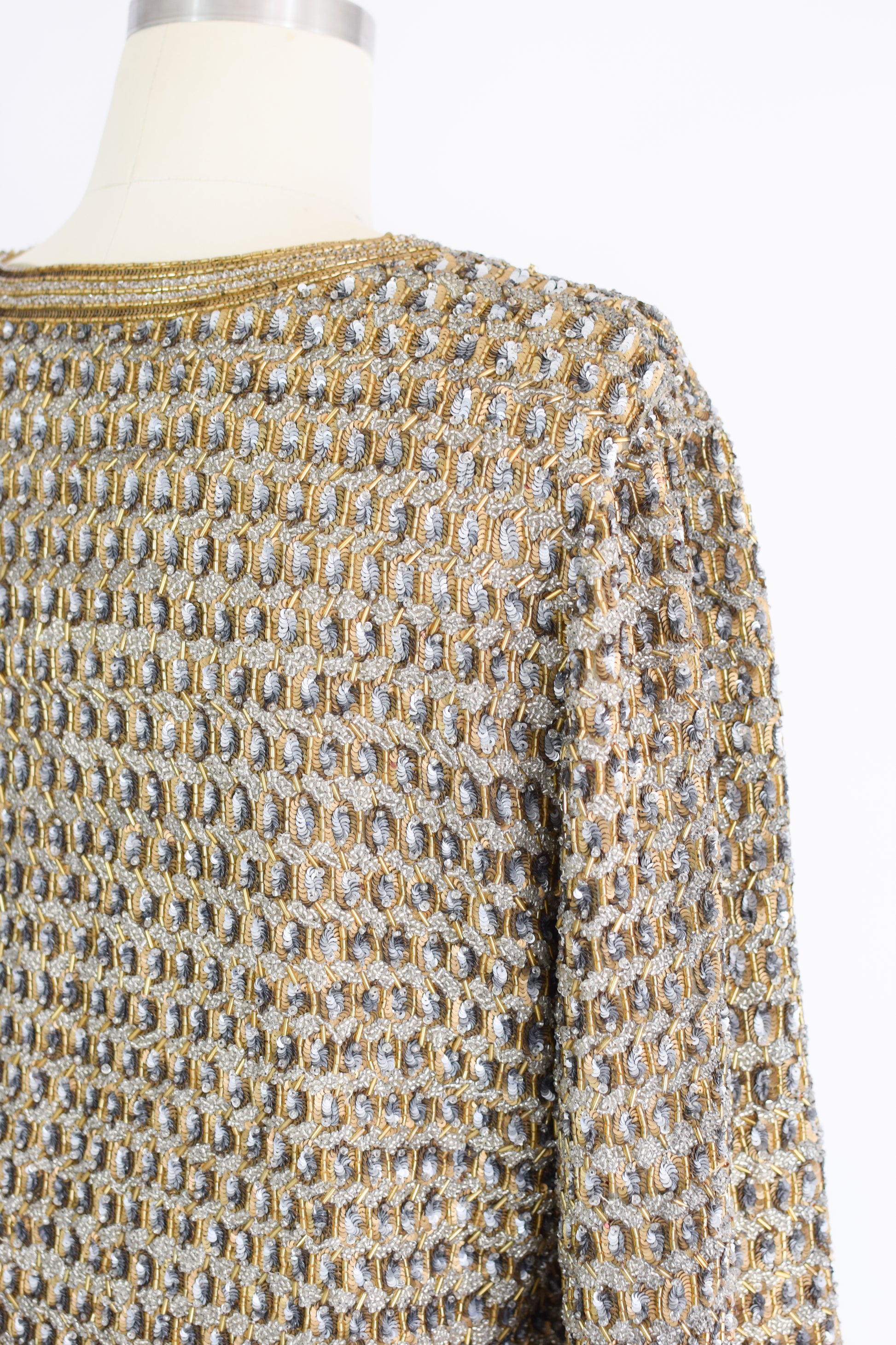 nearly 4 pounds of dense gold, silver and clear sequins, seed and bugle beads. metal knit cuffs and hem. snaps and hooks along left shoulder seam. fully lined in tissue silk