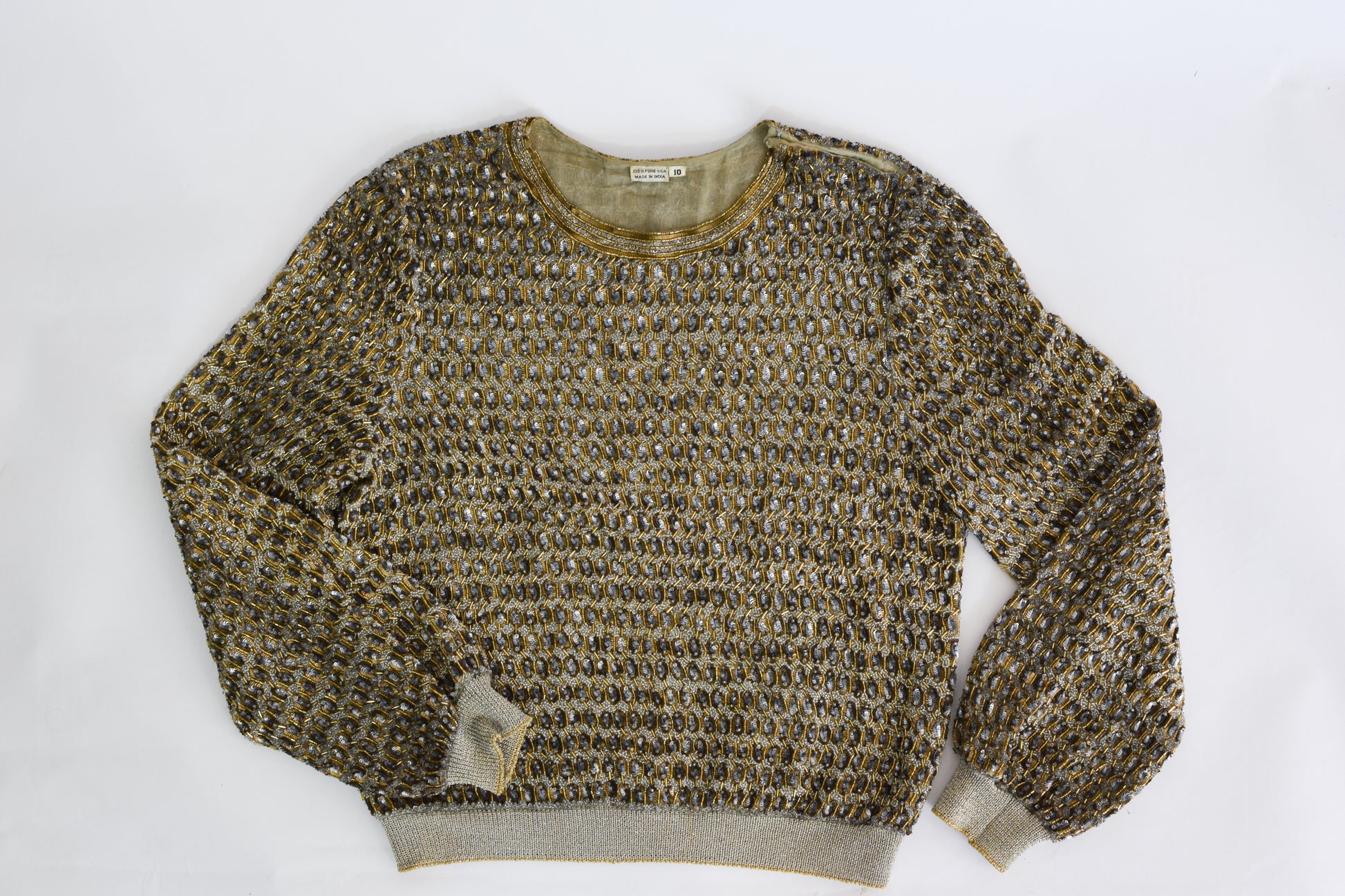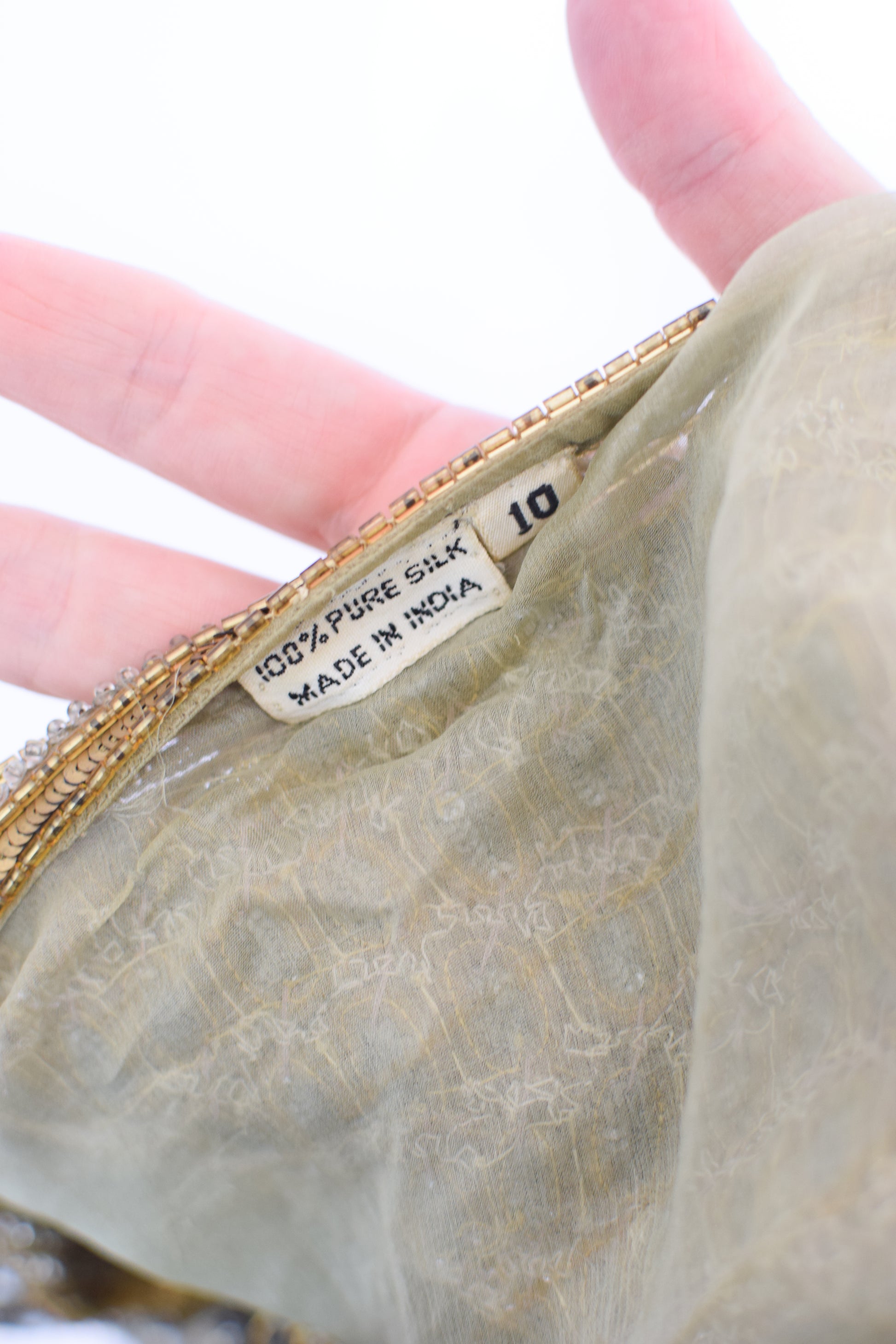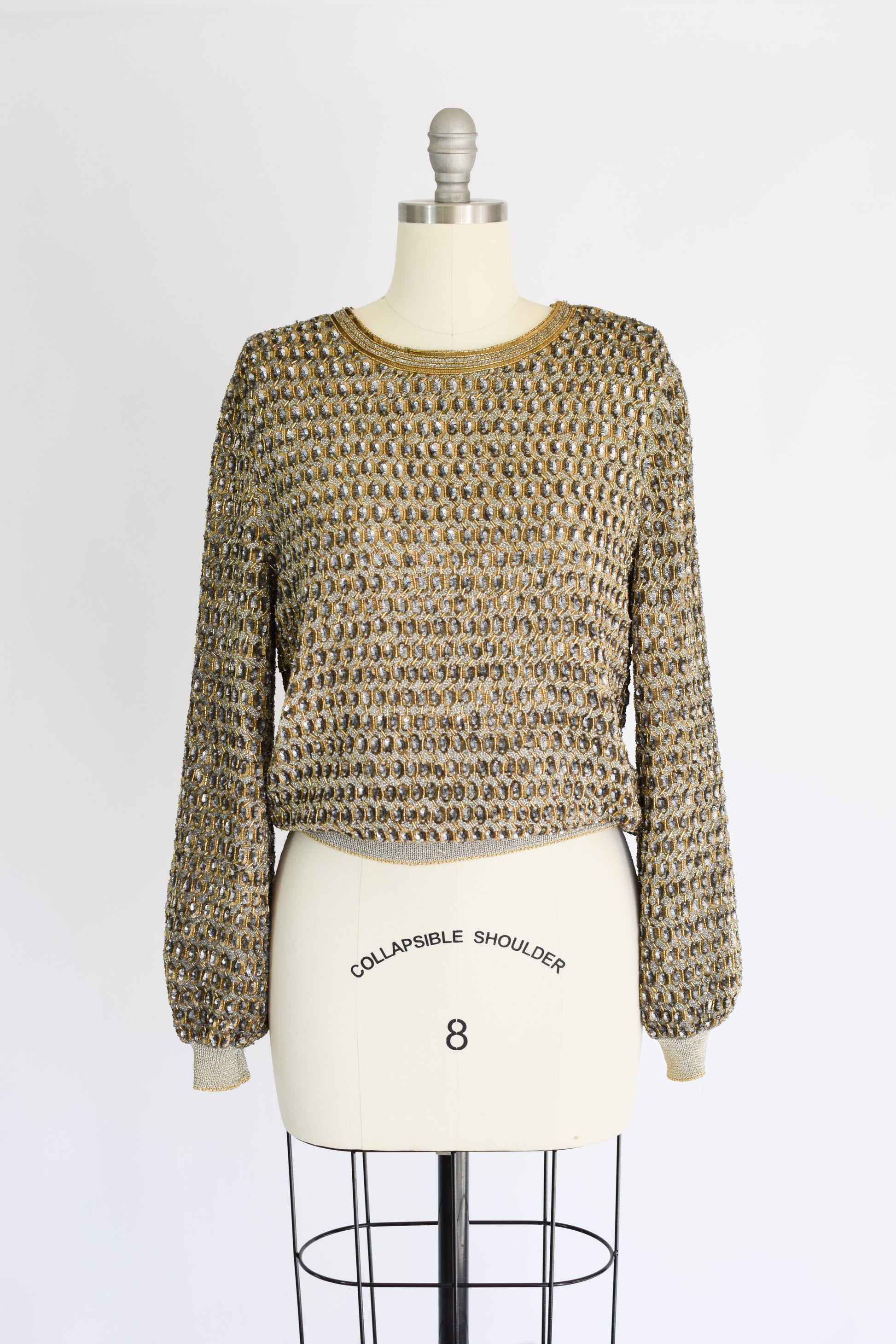 nearly 4 pounds of dense gold, silver and clear sequins, seed and bugle beads. metal knit cuffs and hem. snaps and hooks along left shoulder seam. fully lined in tissue silk