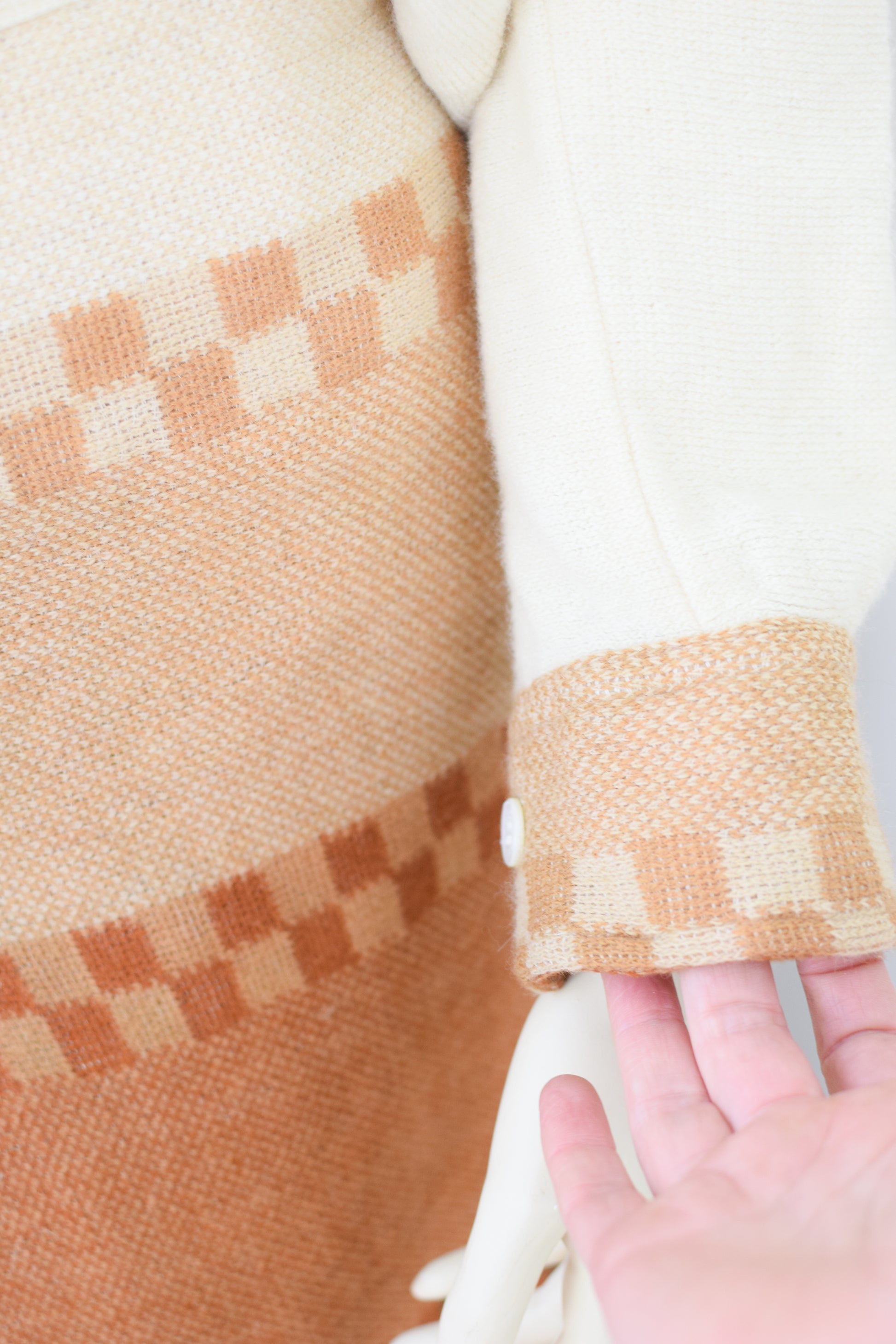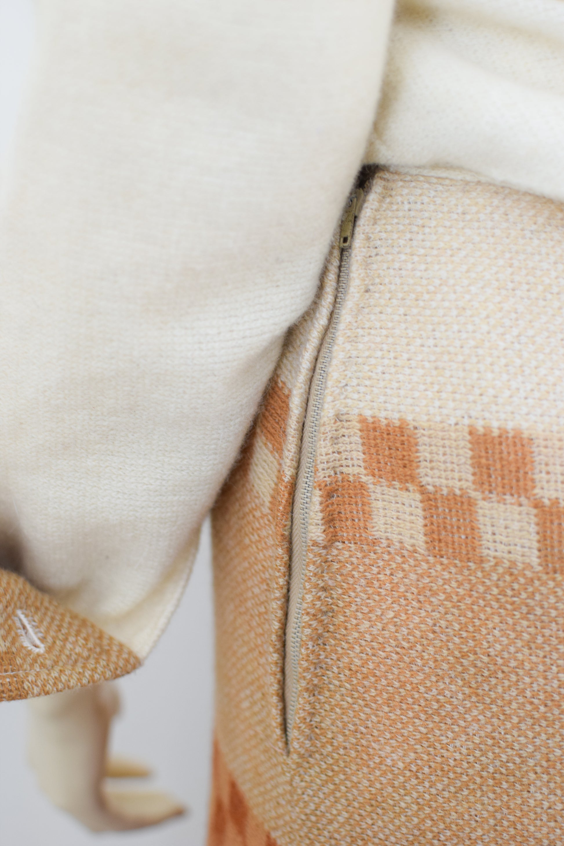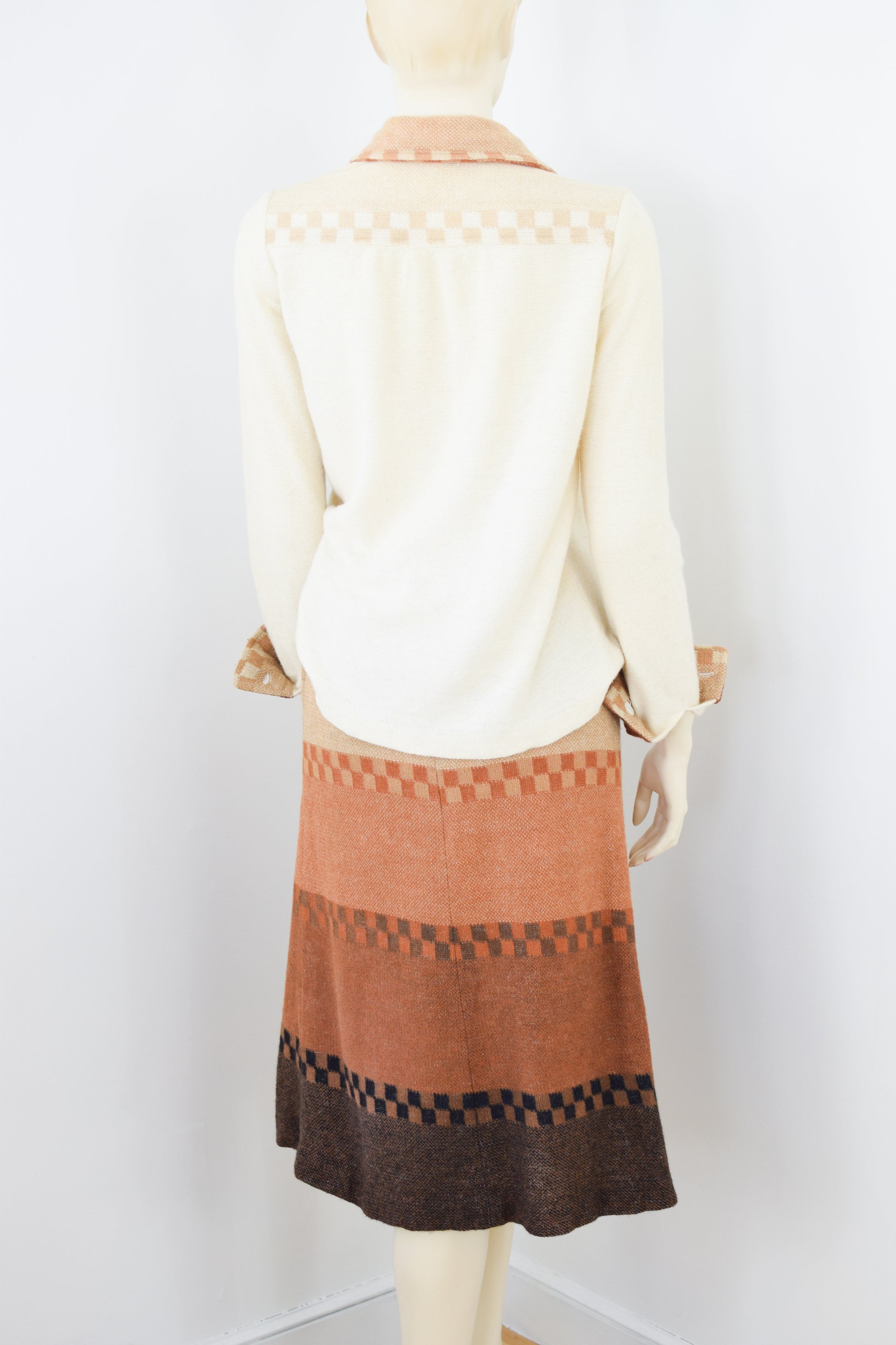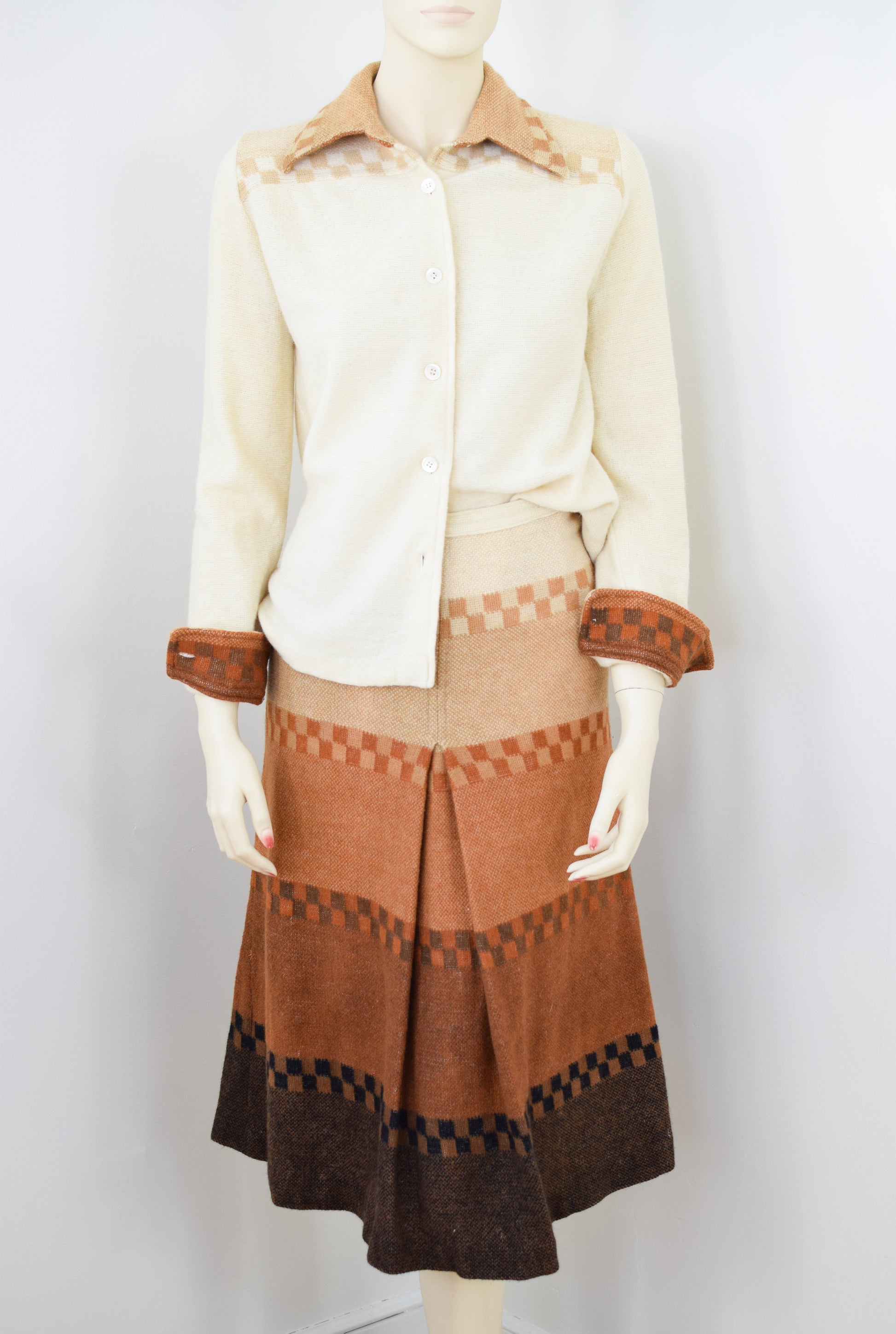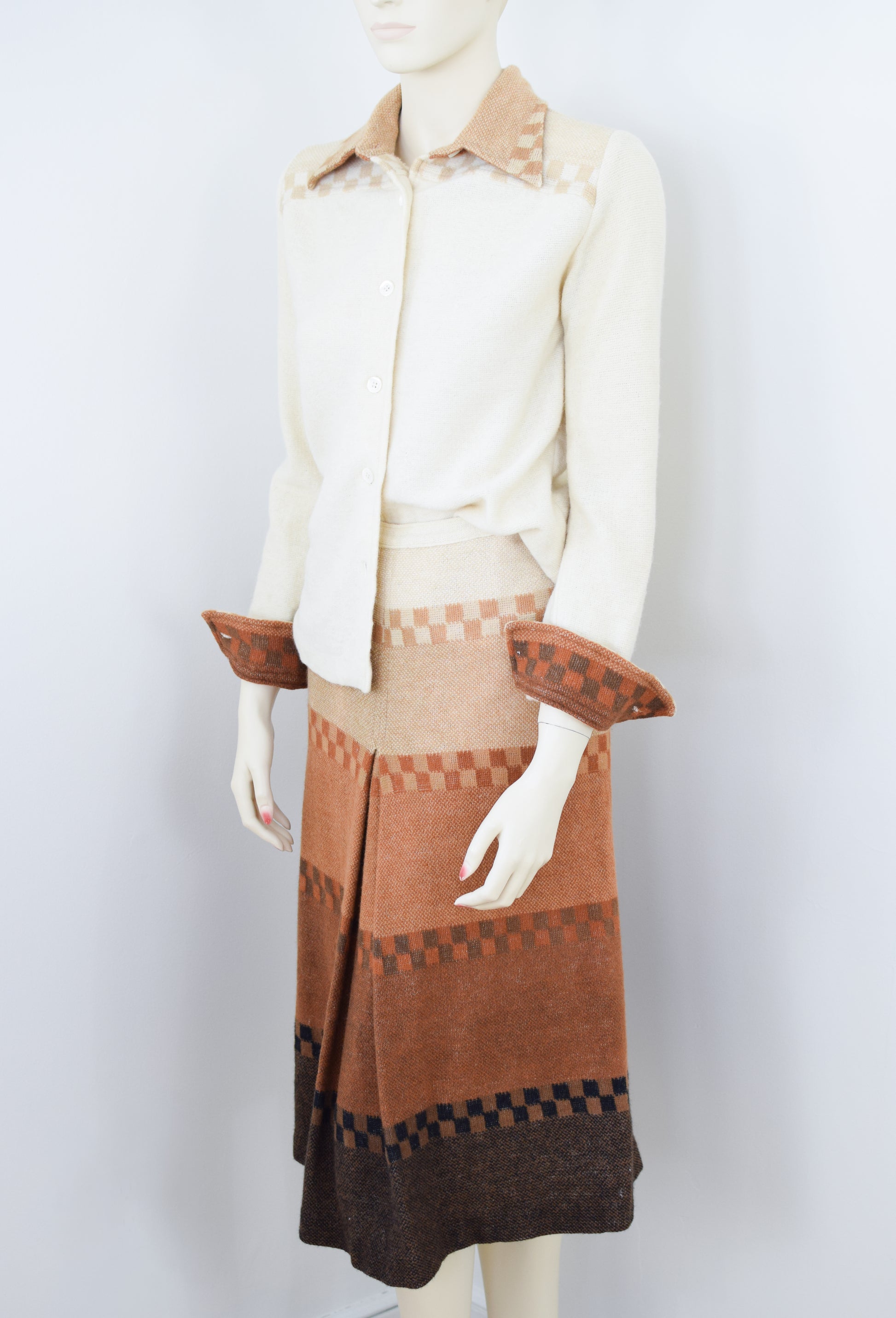 chic fine wool/angora blend knit set. the button-front top with wide collar and cuffs, the modified A-line skirt with front pleat and metal side zipper. both with fabulous color blocked and checked color scheme. skirt fully lined.