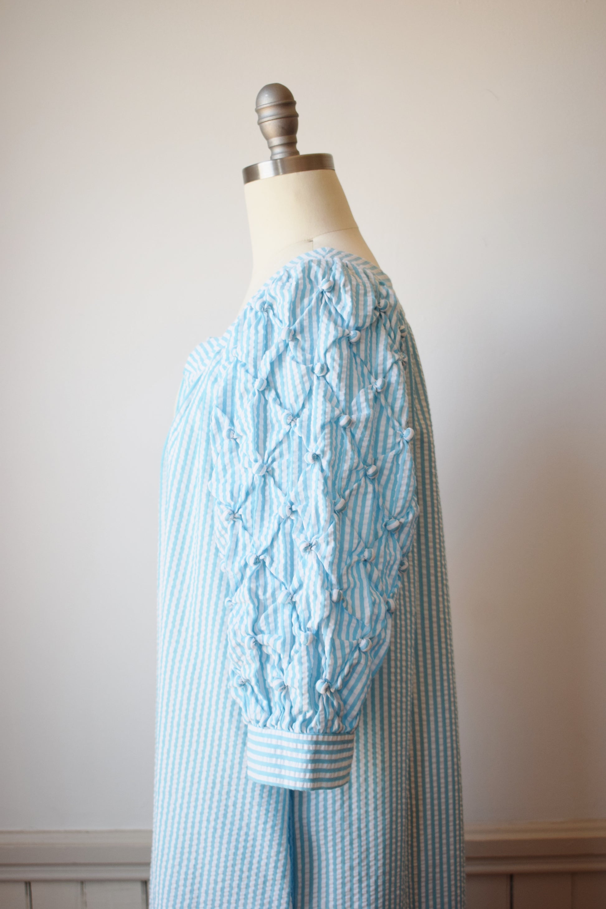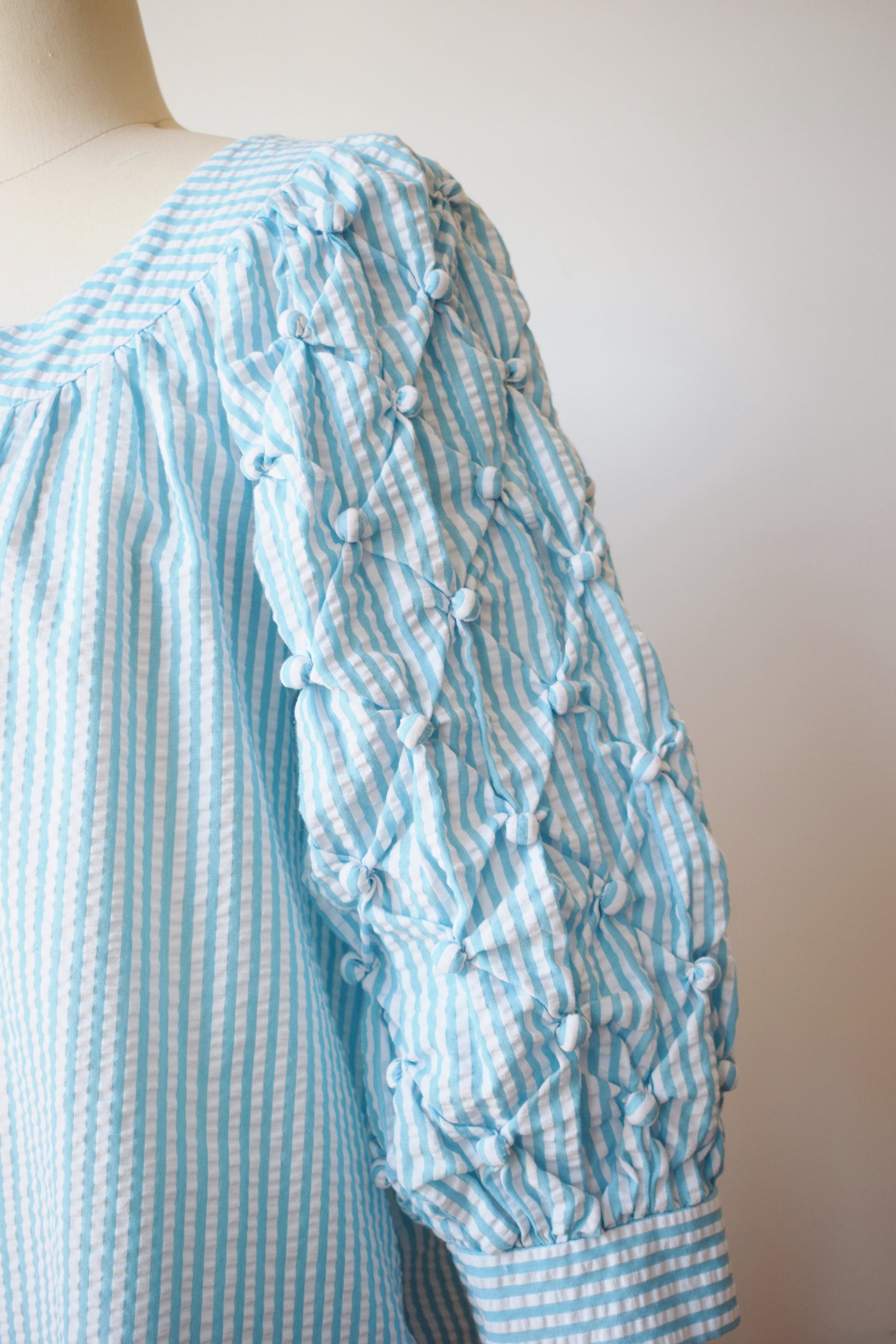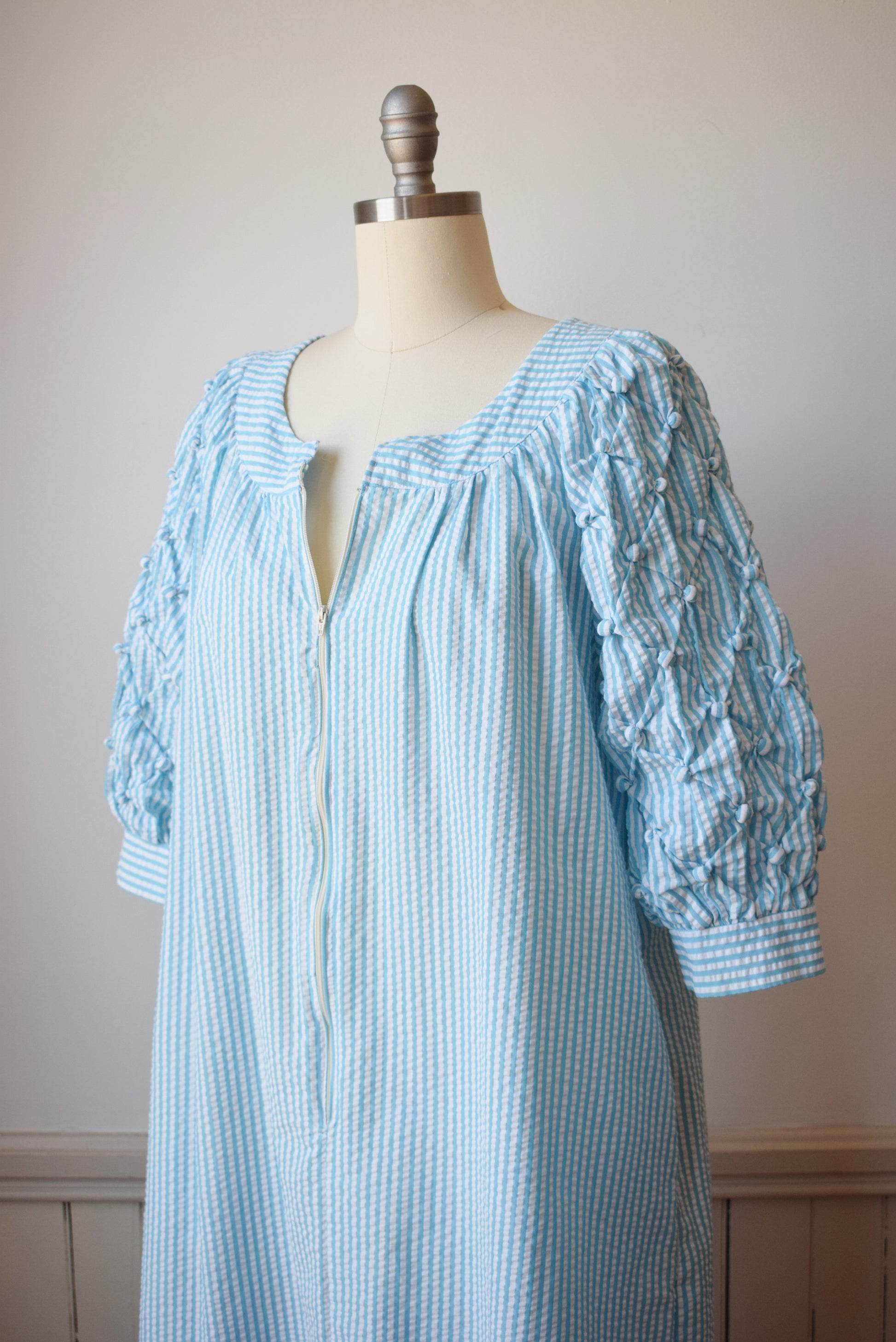 turquoise blue and white seersucker in a breezy tent cut with zipper down the front and fabulous gathered puff sleeves. side seam pockets. pulls over head.