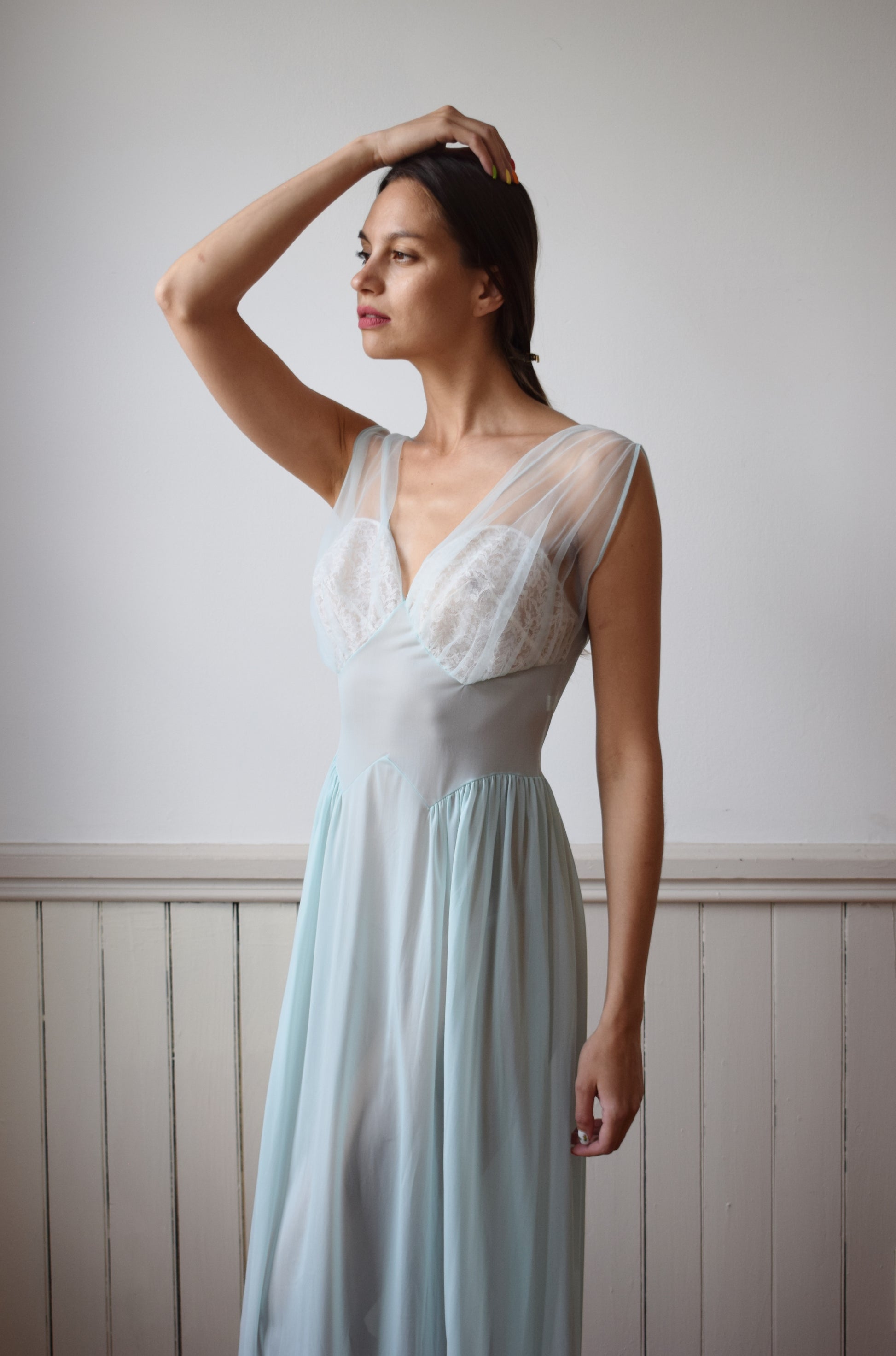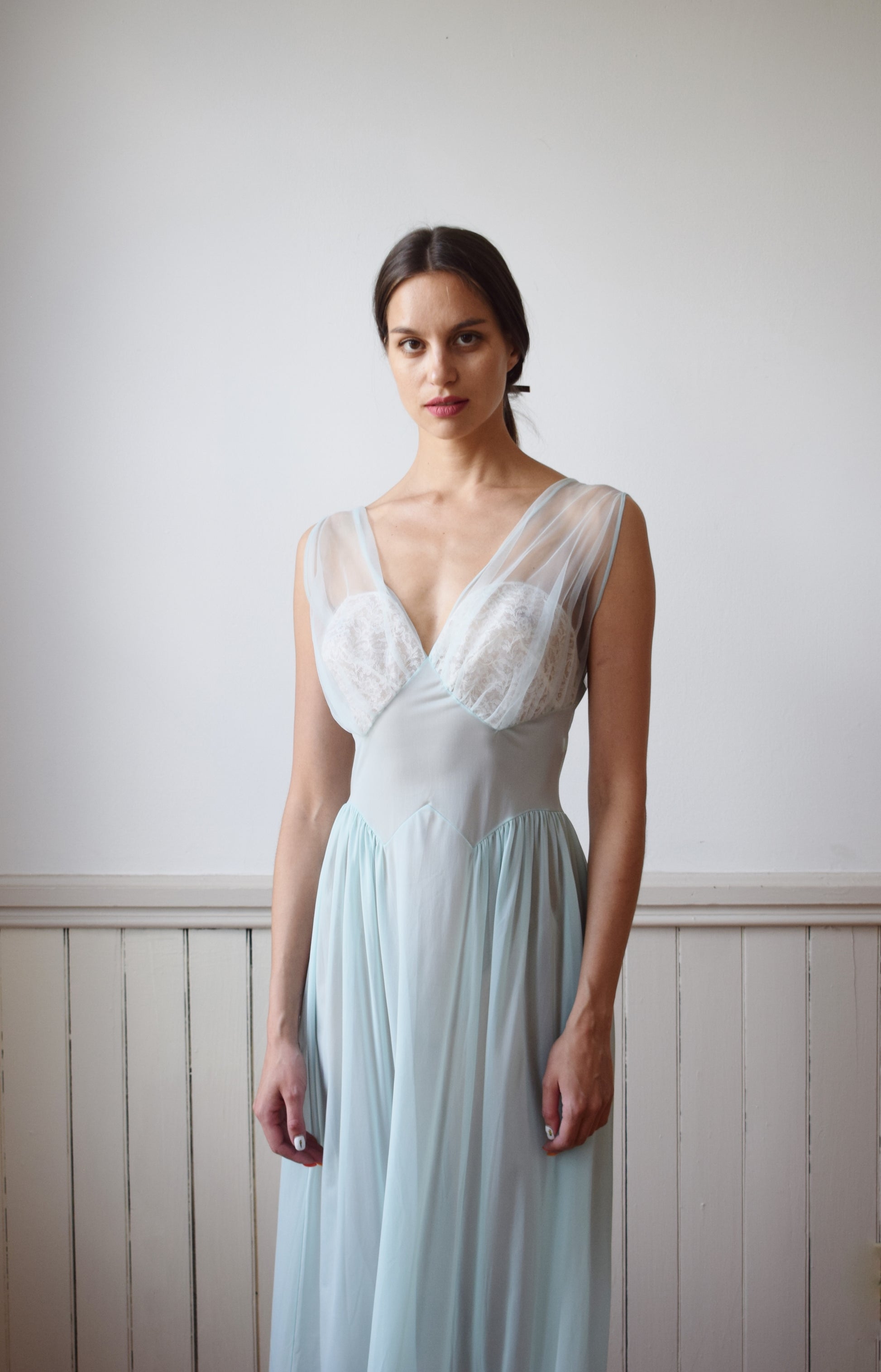pastel blue nylon tricot with sheer overlay and lace bodice. gathering at waist gives skirt drape + fullness. pulls over head.
