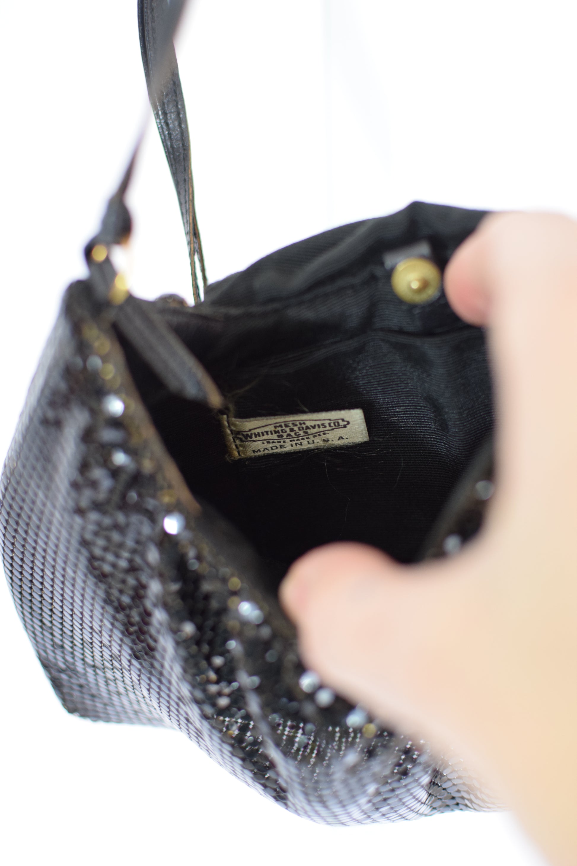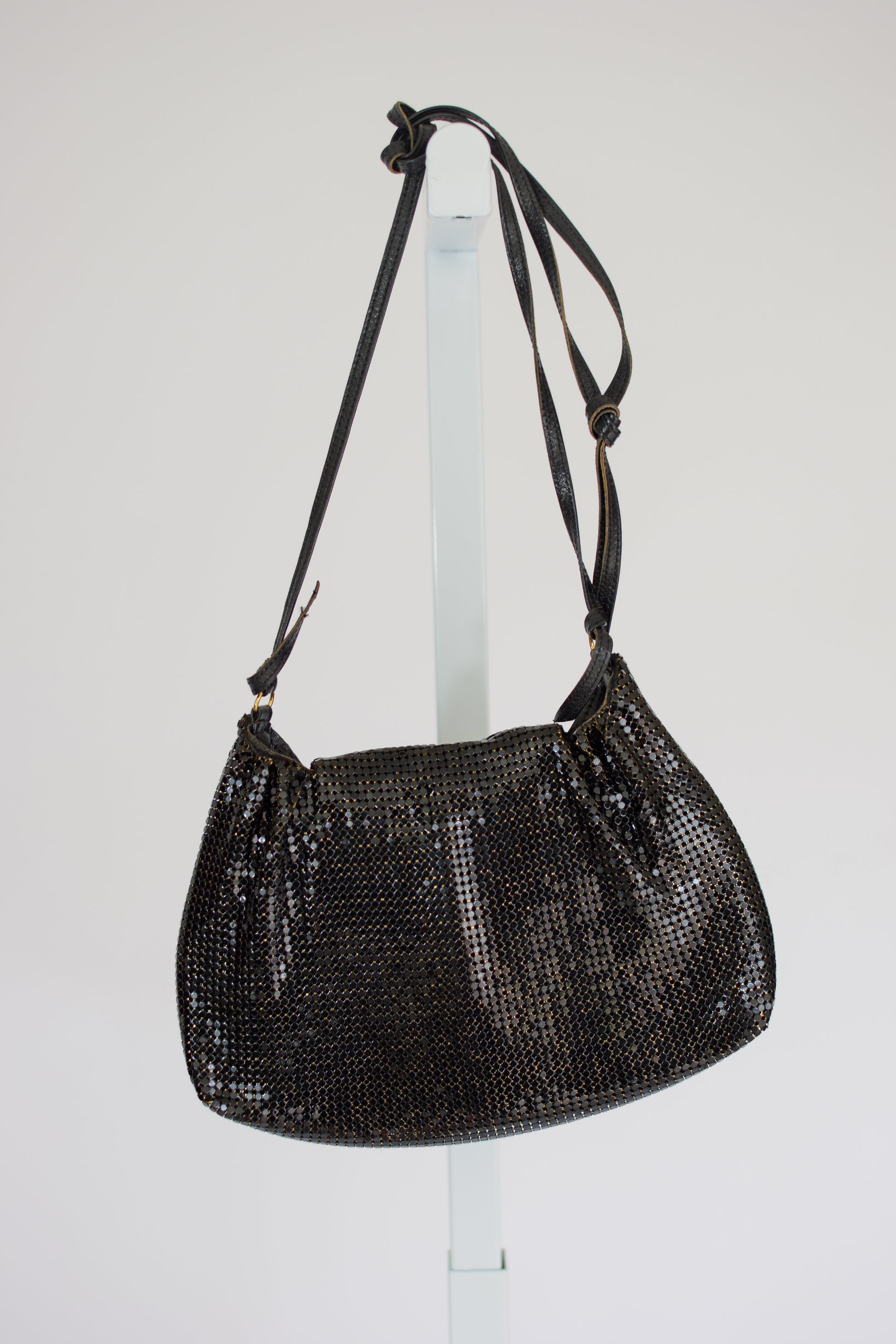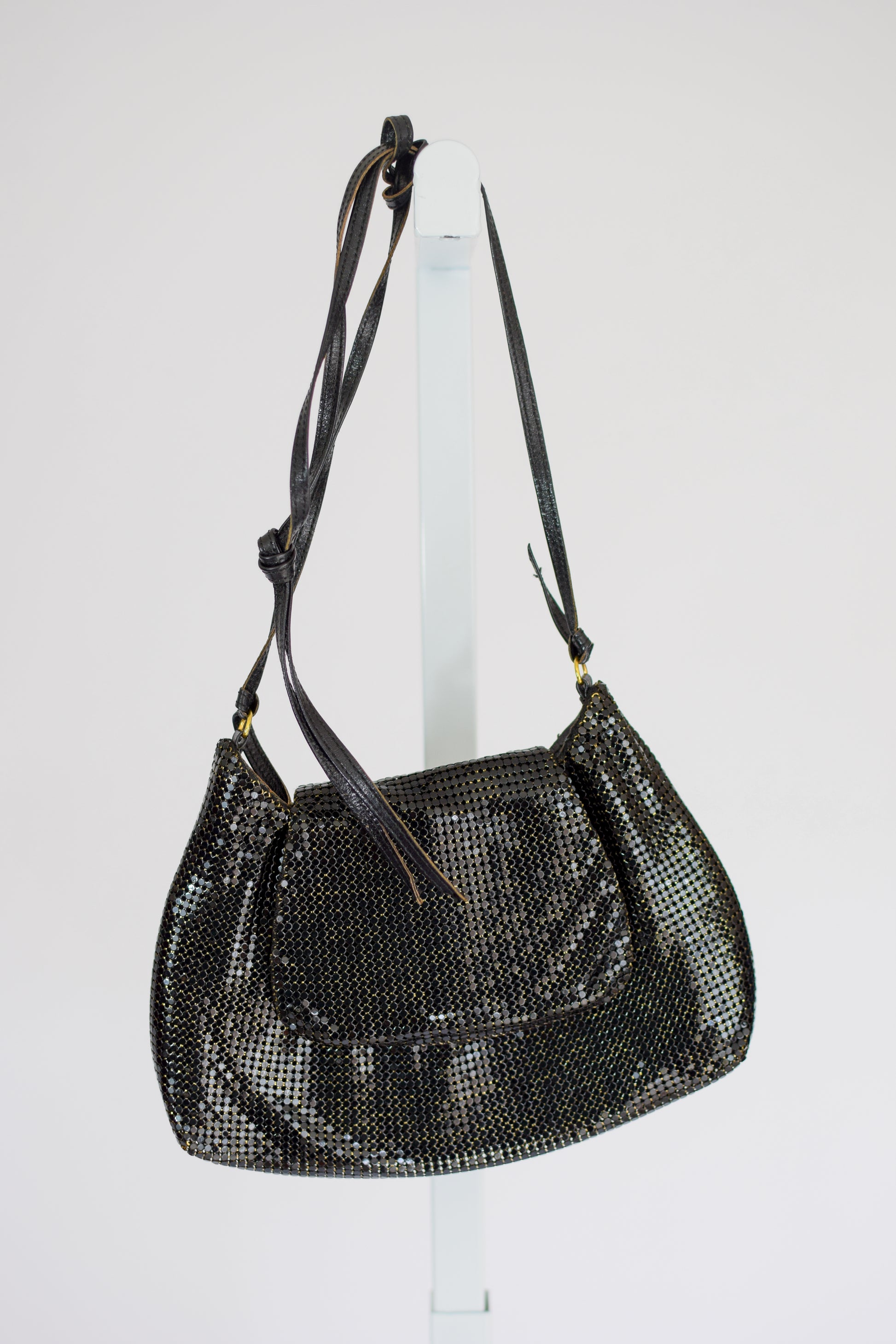 fine black metal mesh with black grosgrain fabric interior. top flap, thin leather shoulder strap.