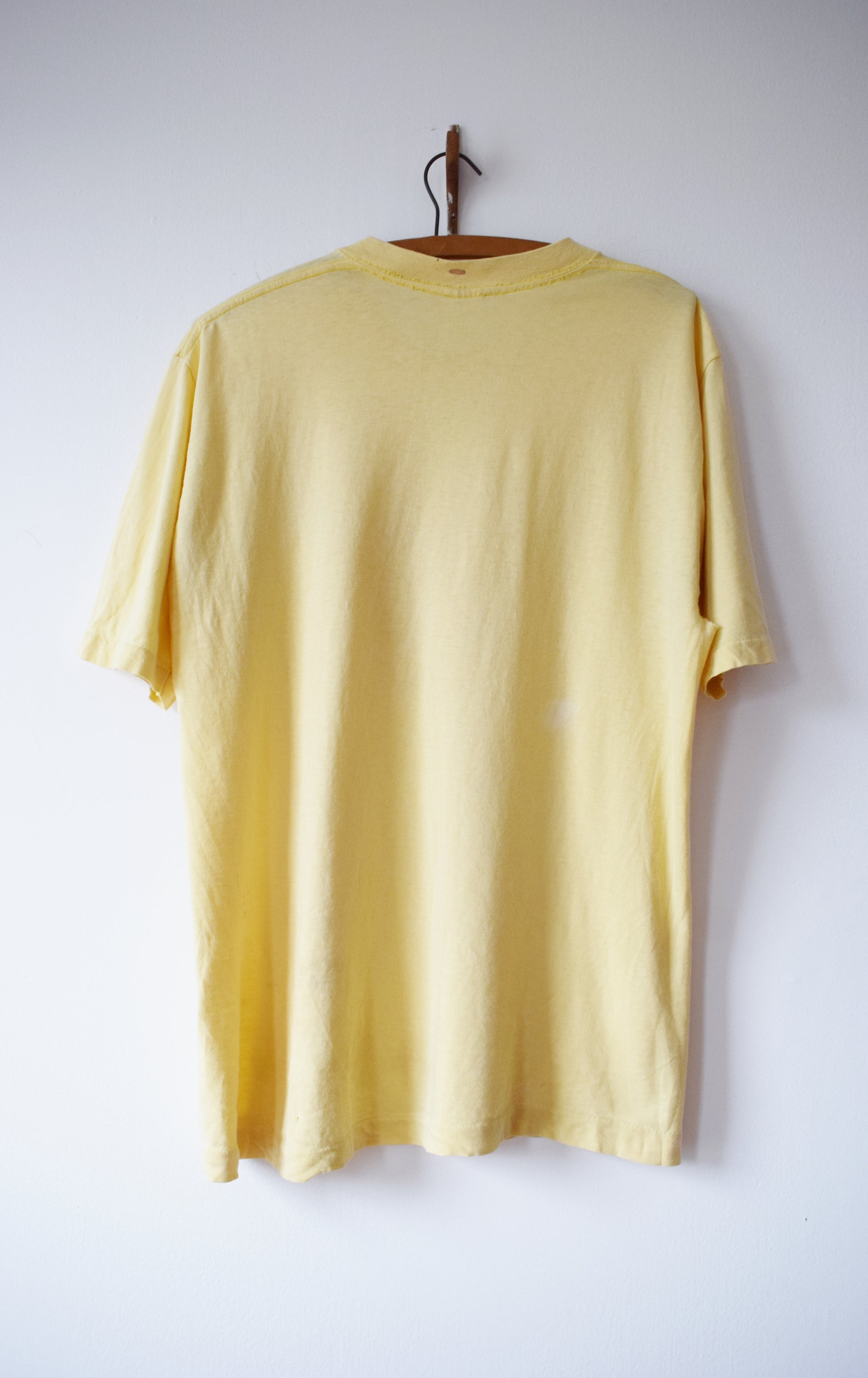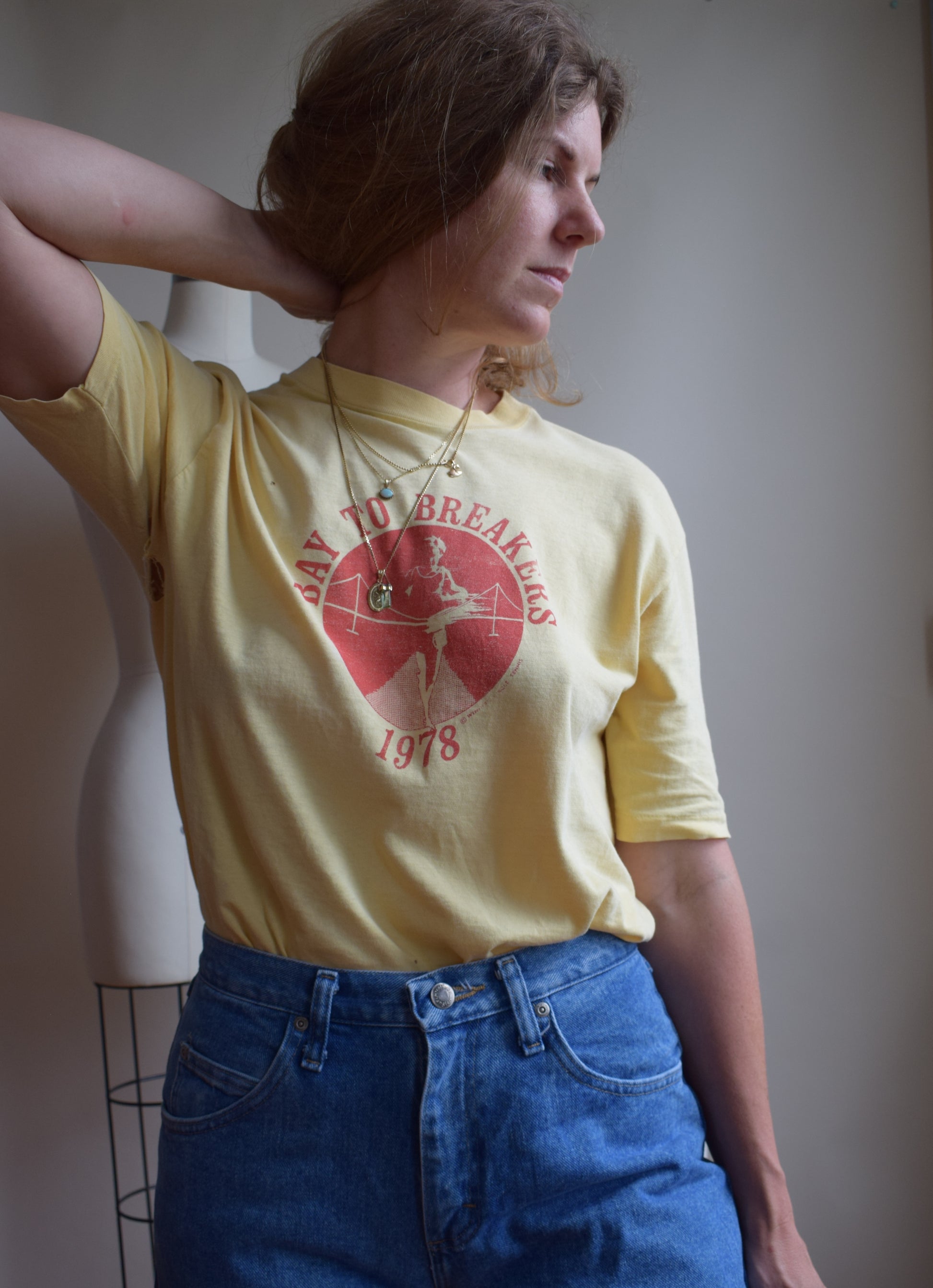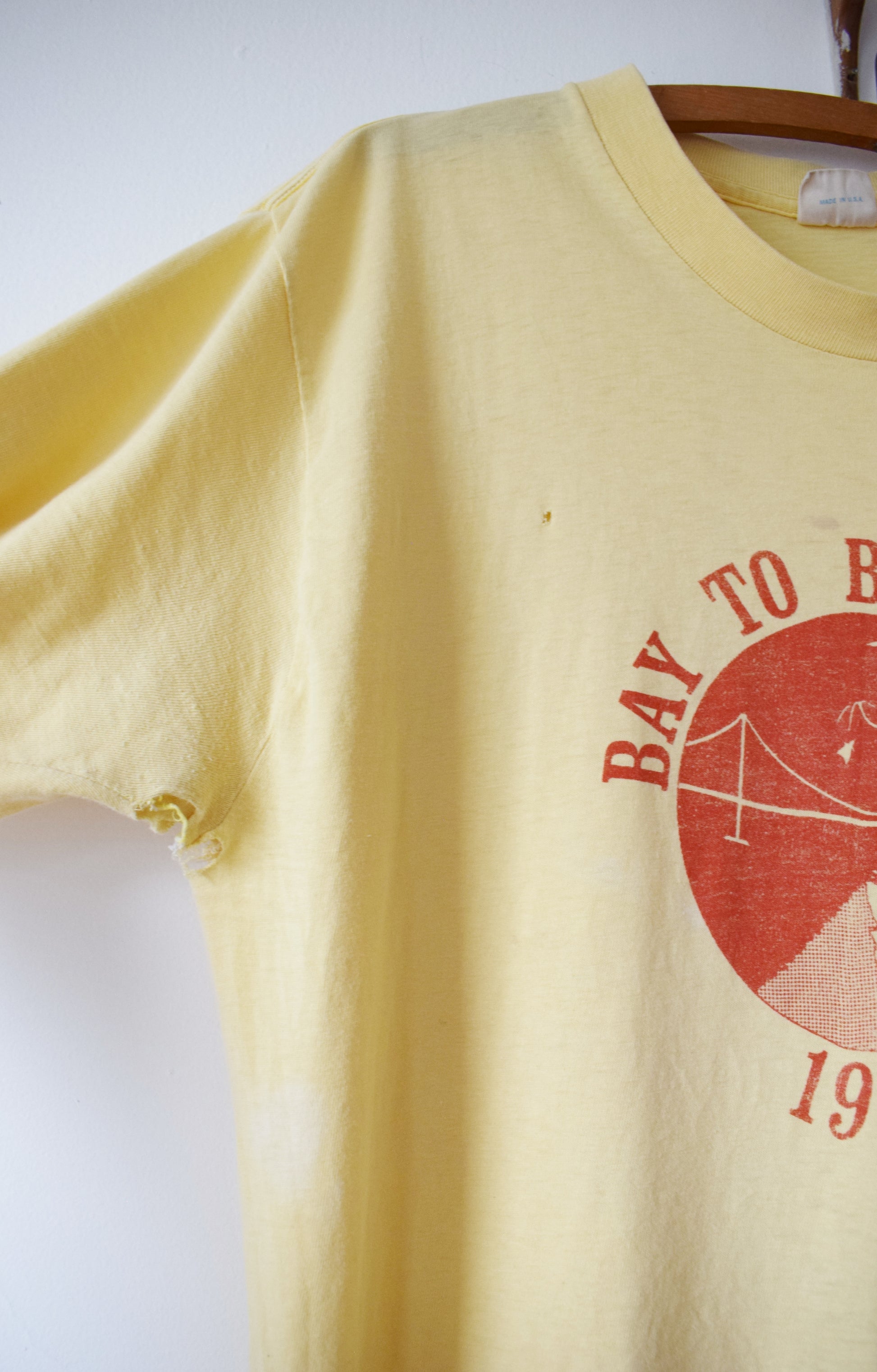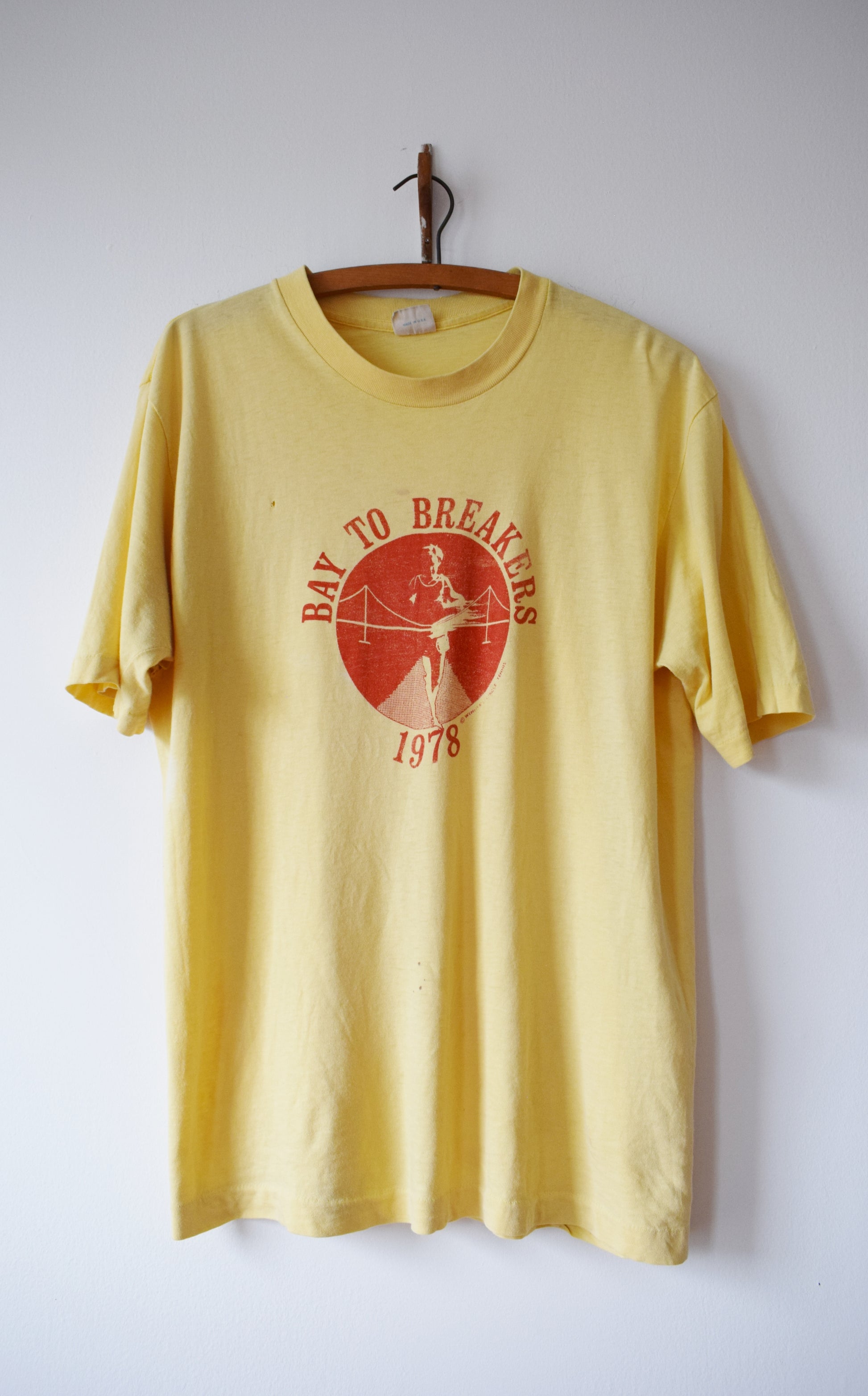 perfectly broken-in soft and thin butter yellow cotton T with Bay to Breakers, 1978 center design in orange.