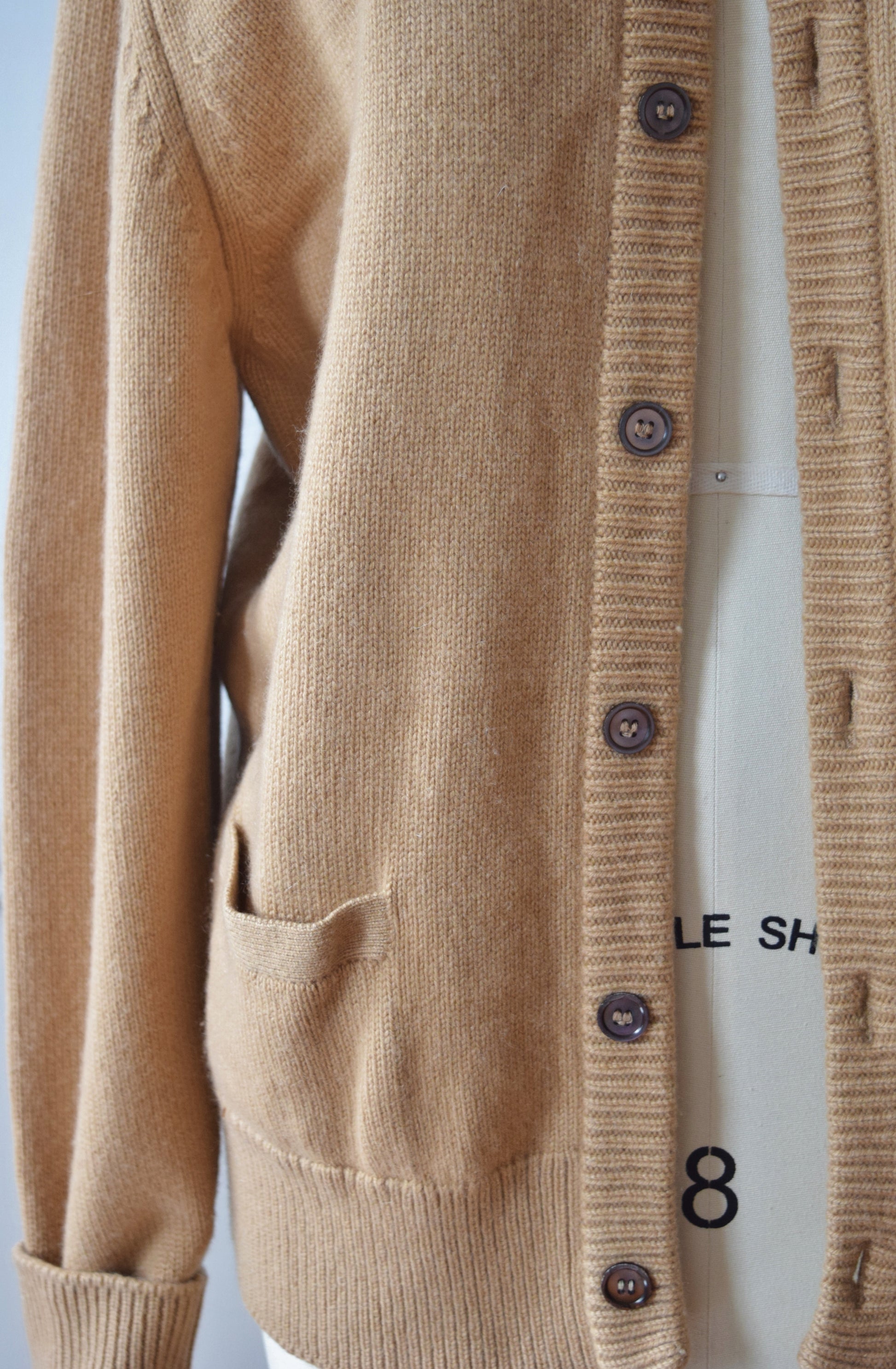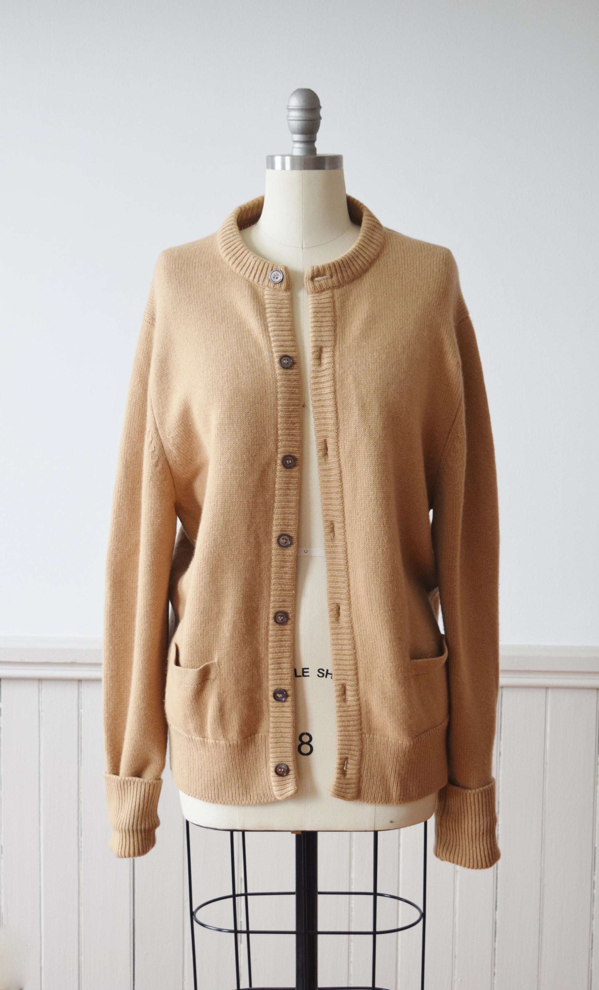 a slouchy classic in softest tan cashmere knit. hip pockets, extra long sleeves for cuffing.