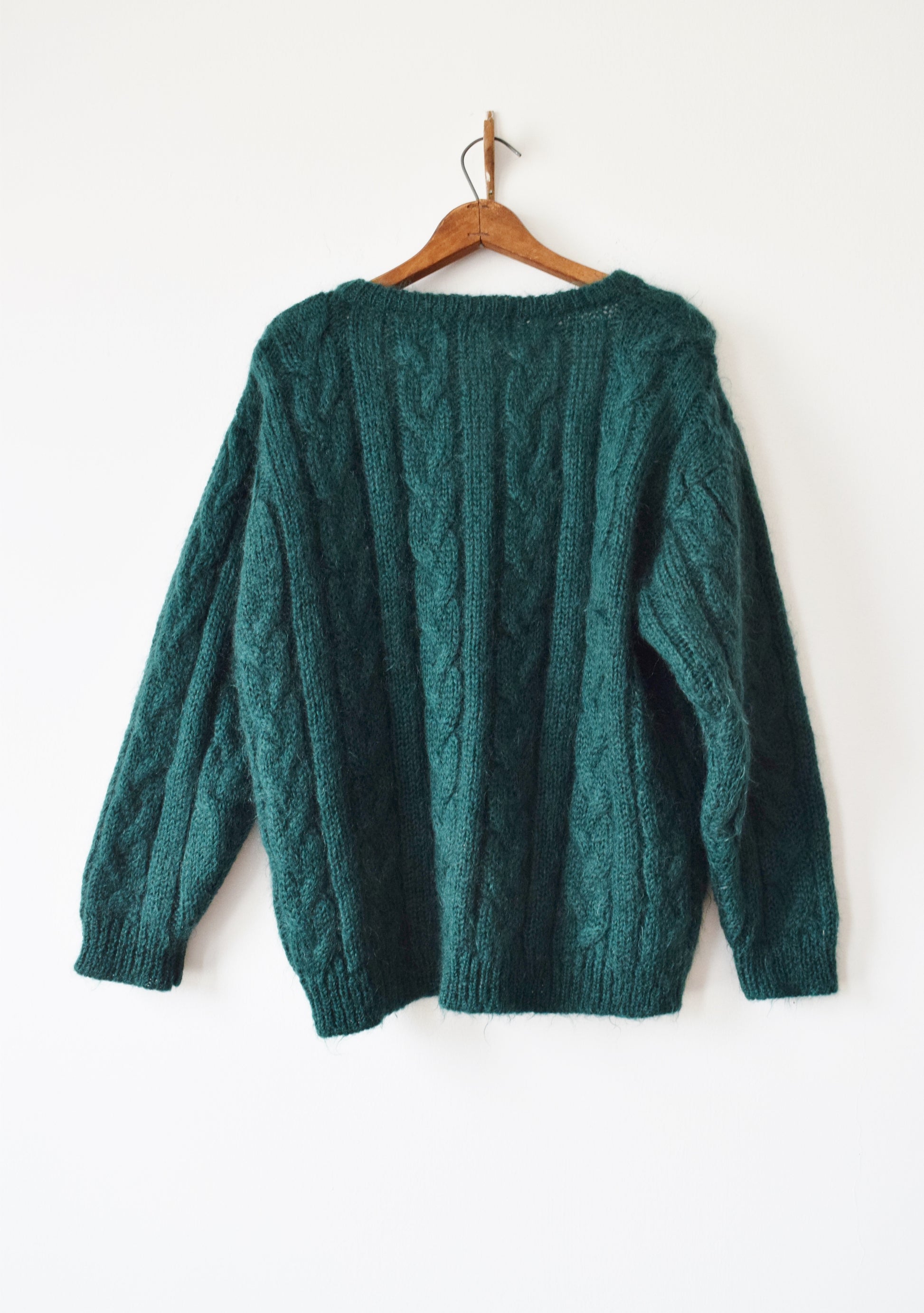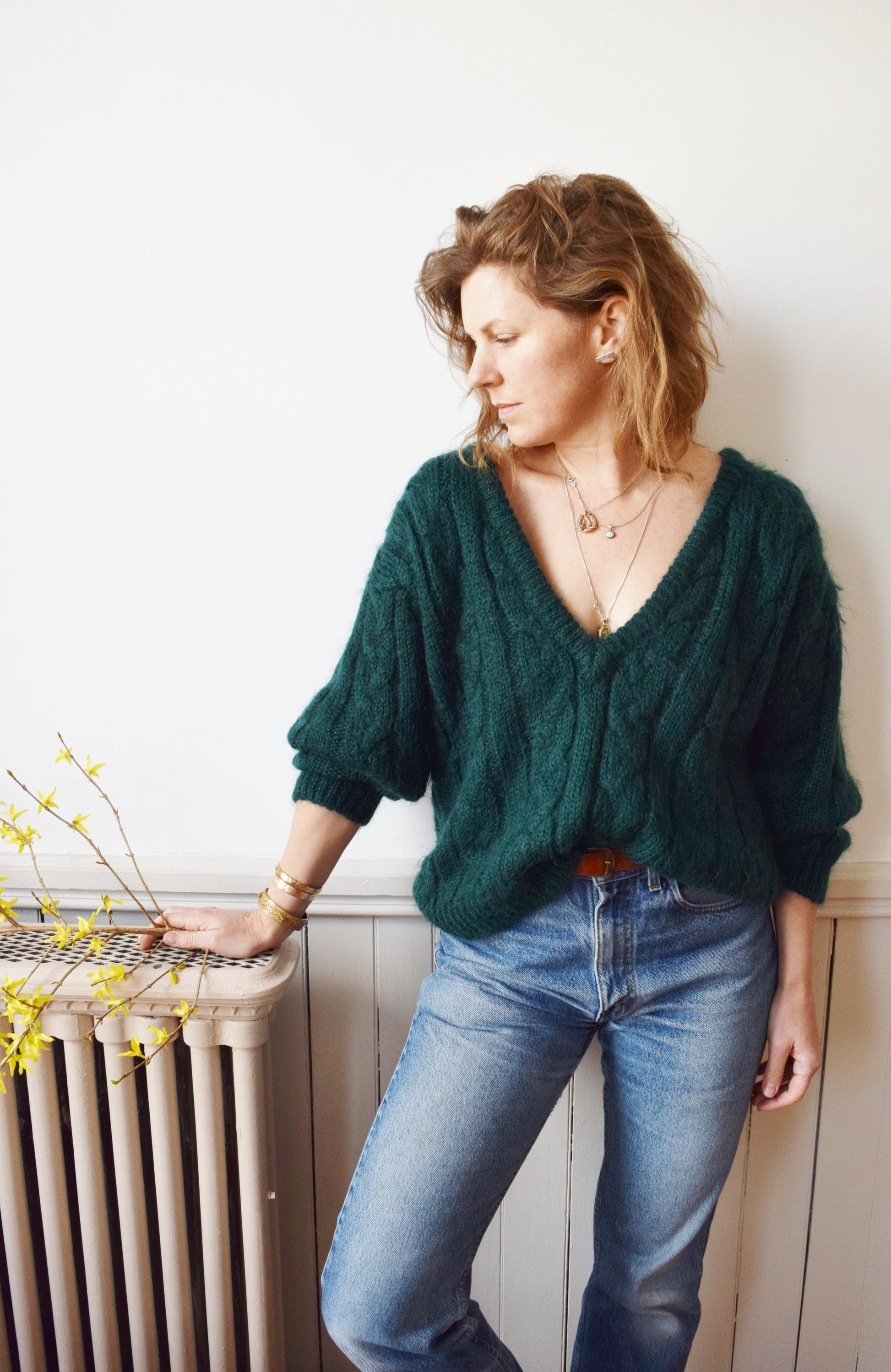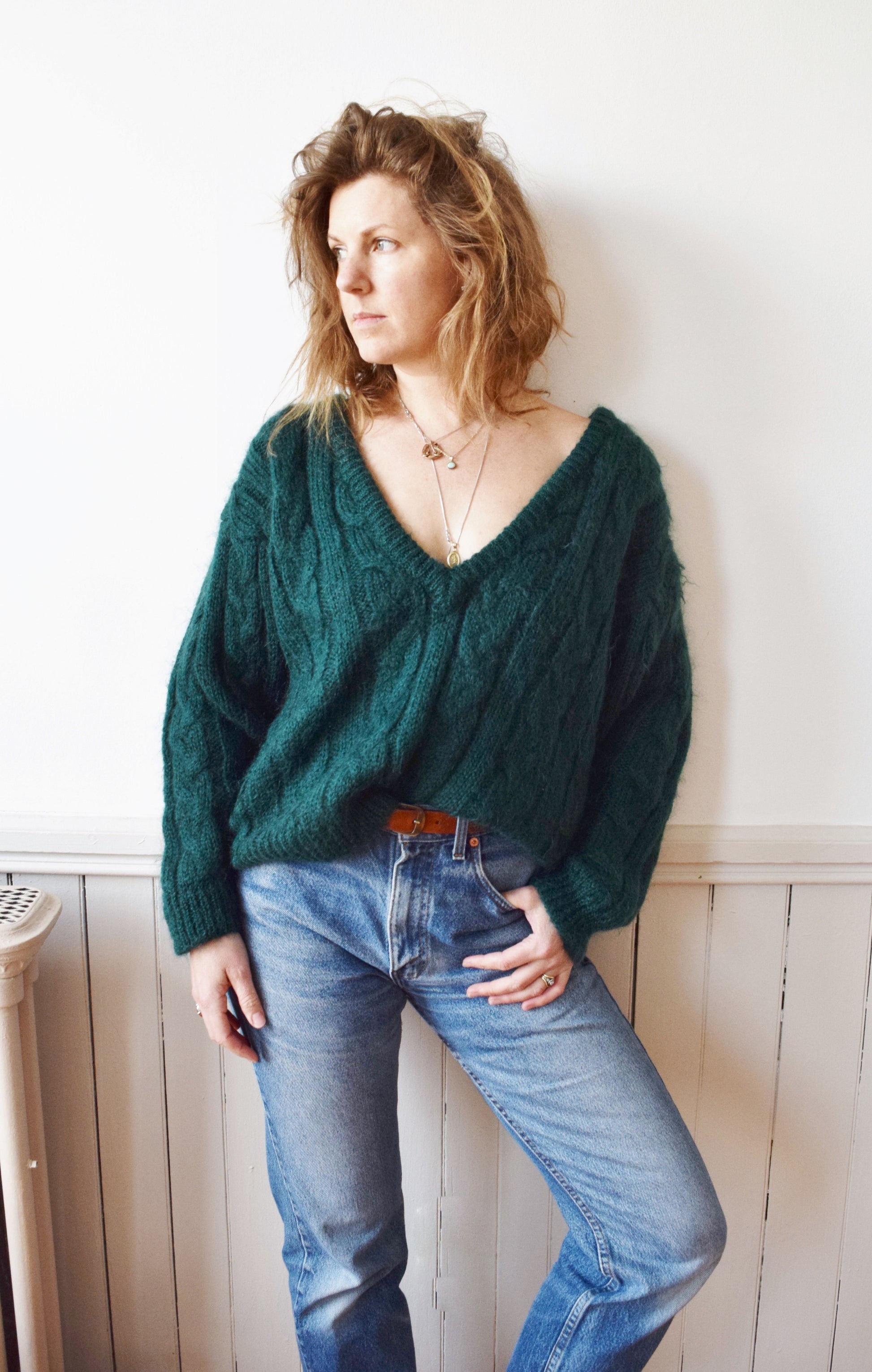 that perfect sweater cut: slouchy, chunky, but not bulky. in a cable knit emerald green mohair blend. slightly cropped, deep V.
