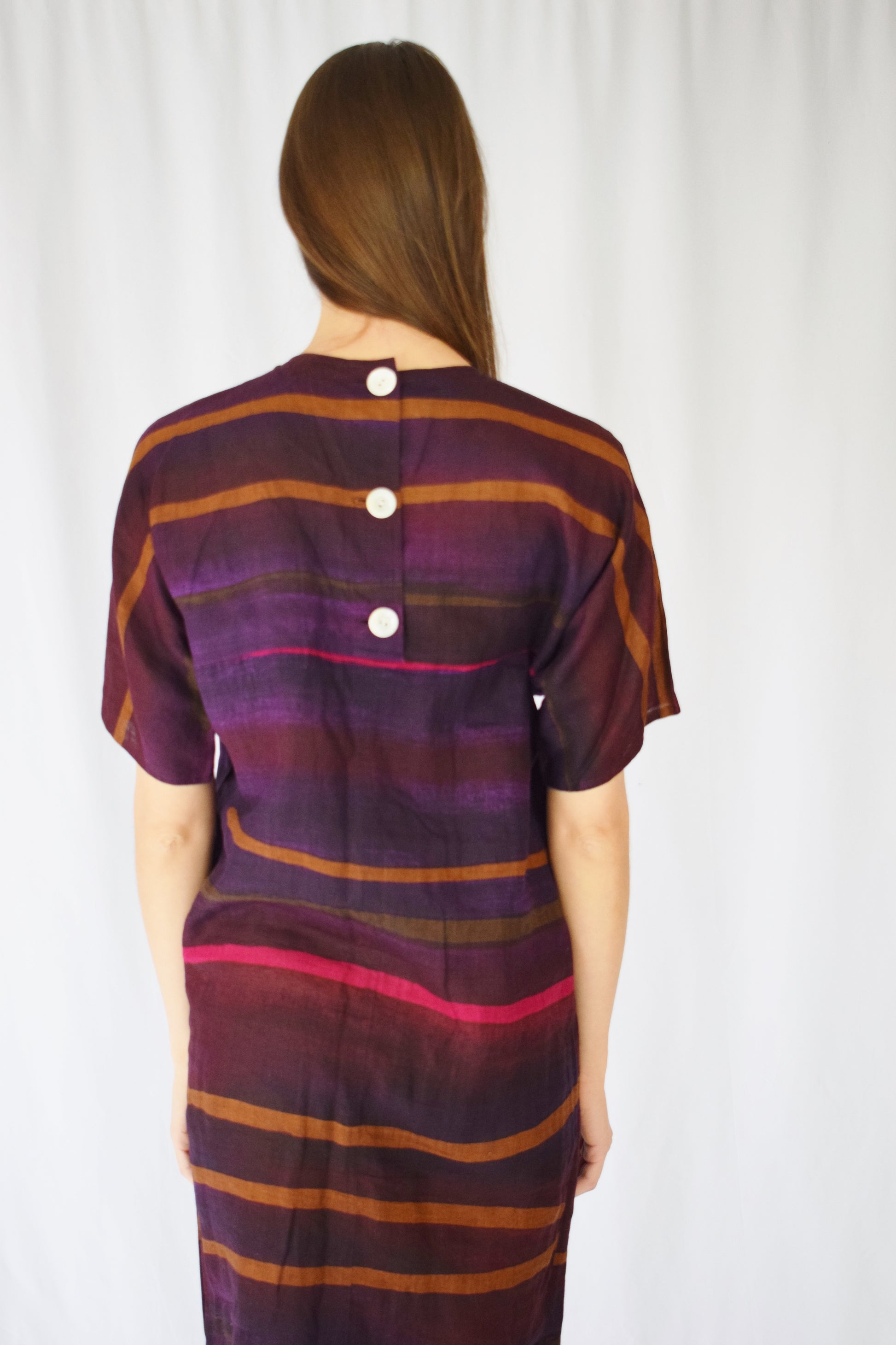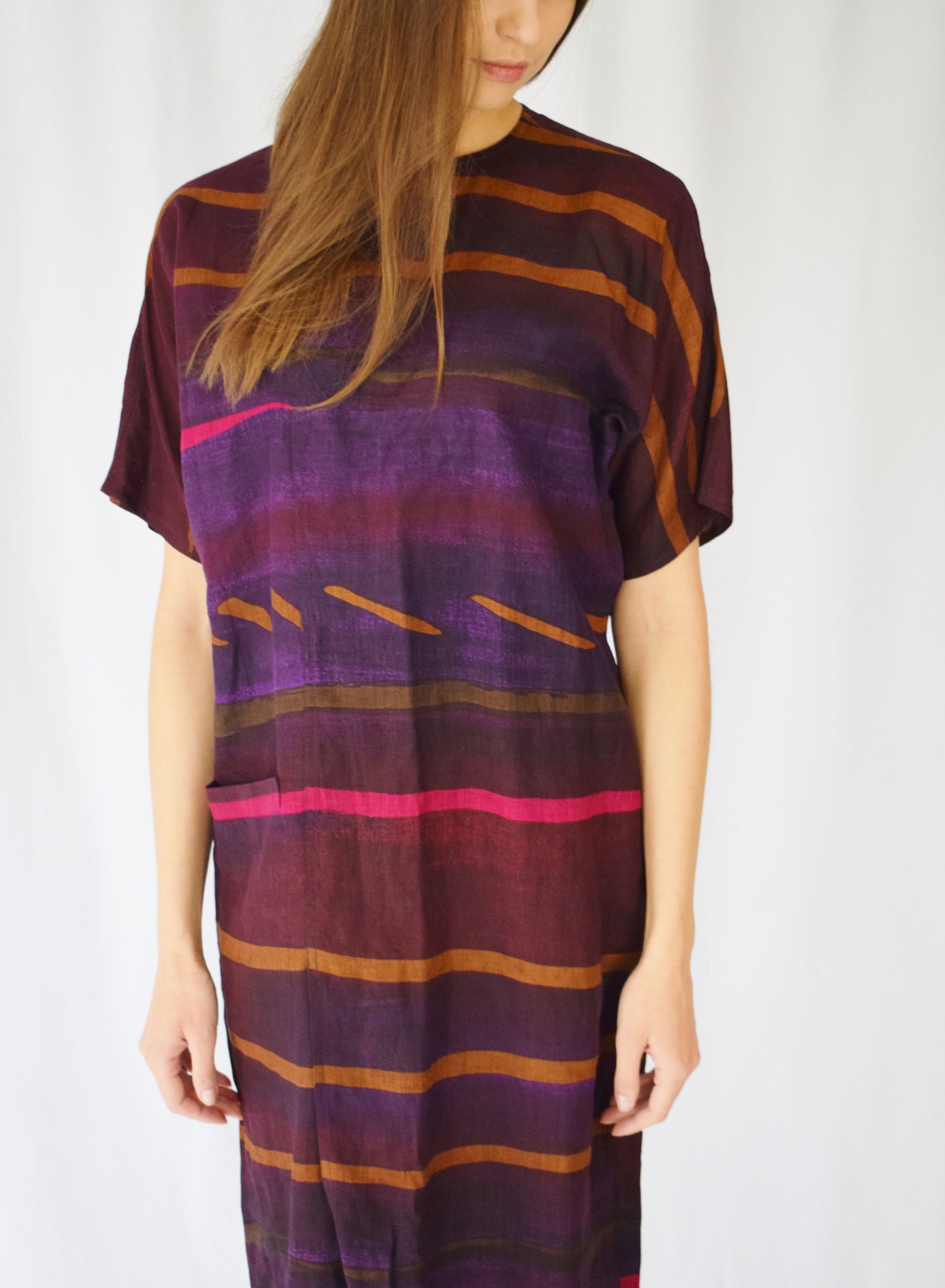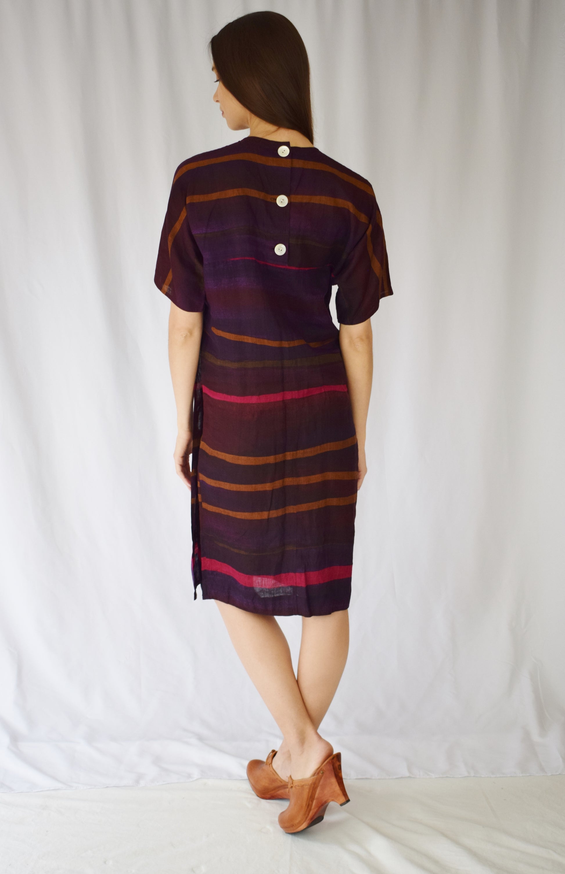 fabulous + interesting details on this seemingly simple silhouette in gorgeous multi-purple-hued linen. hip pockets, large mother of pearl buttons at the back neckline, asymmetrical seaming, and "wrap" detail in the front. a really great piece.