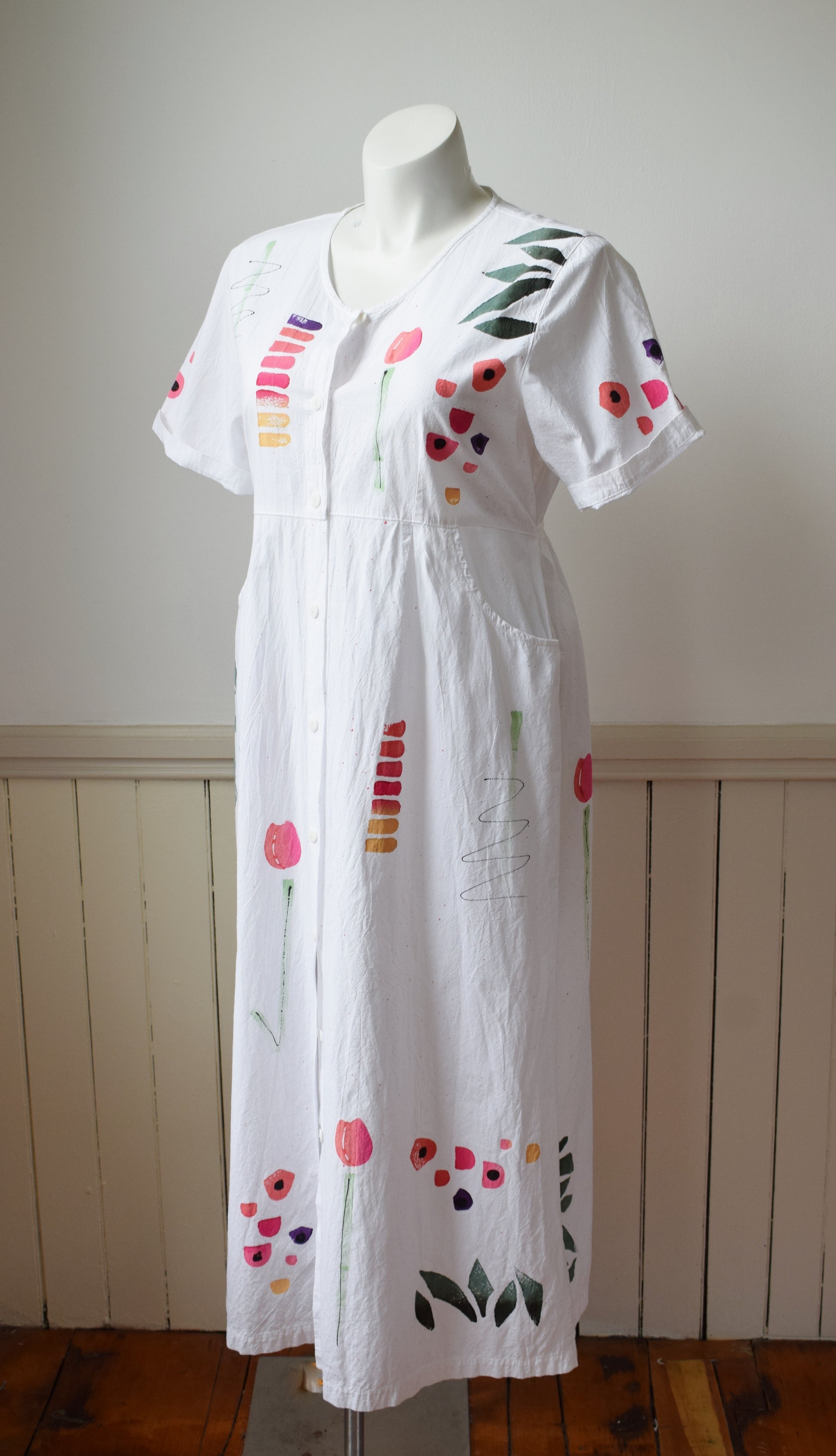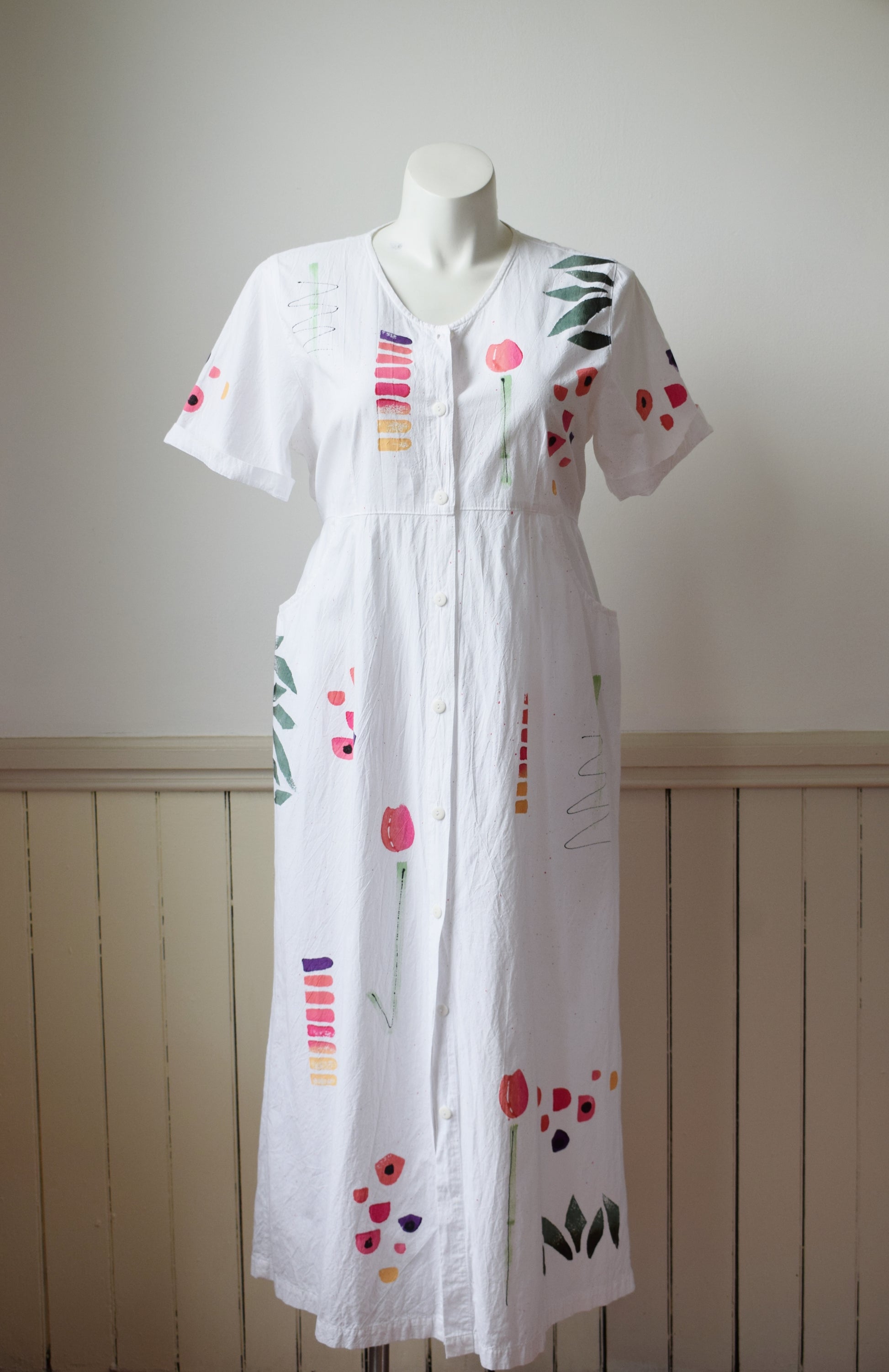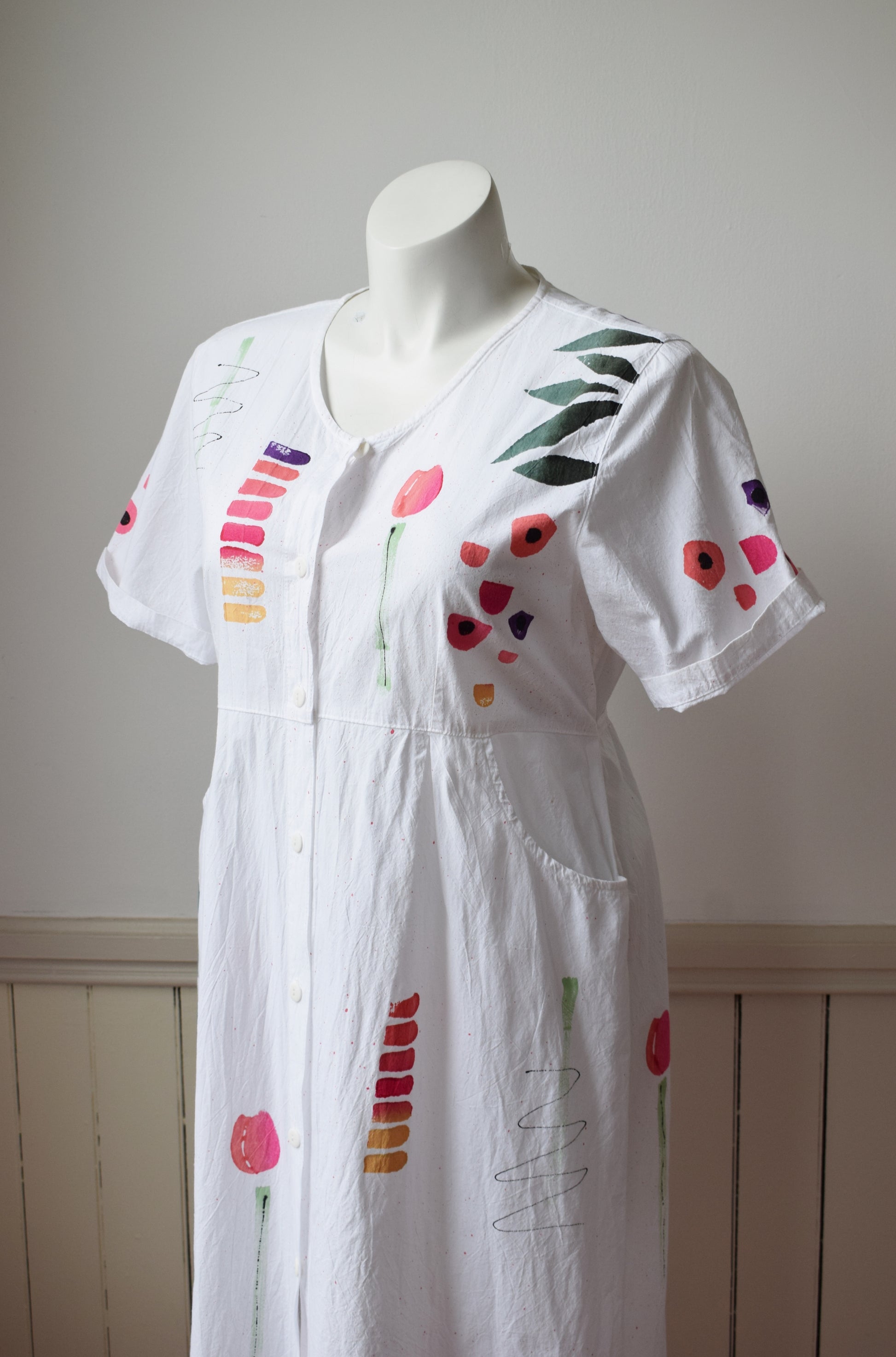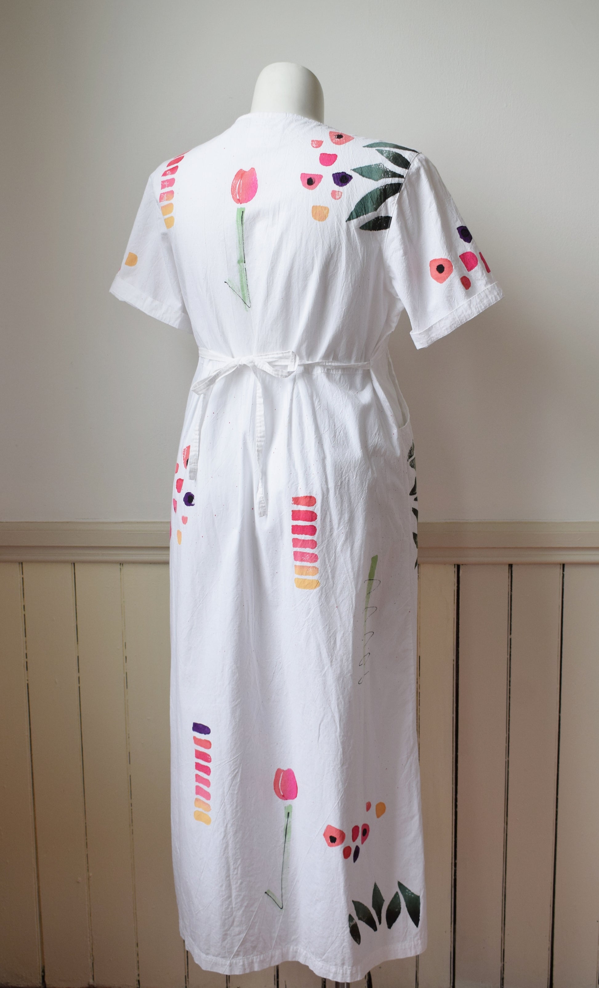 textural white cotton with all-over hand painted floral and abstract print in pinks, purples, and greens. boxy cut ties at the waist and buttons down the front. hip pockets.