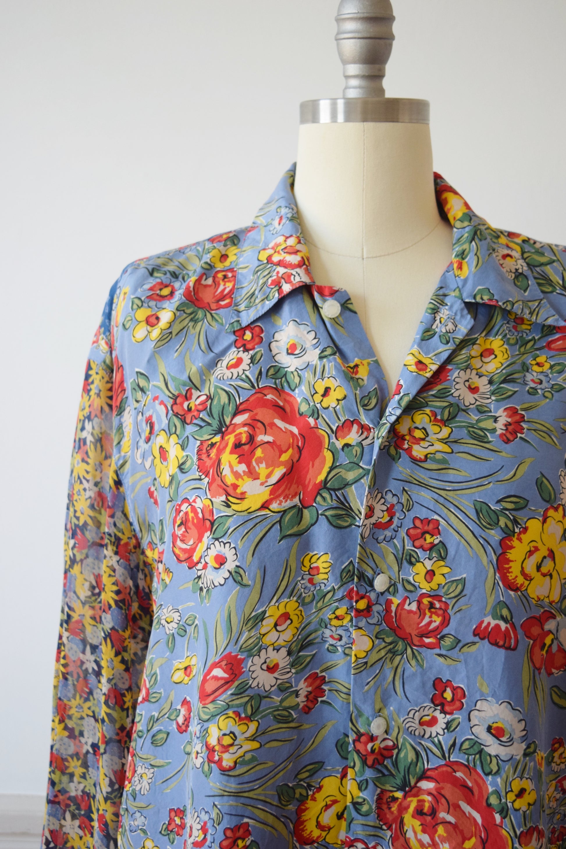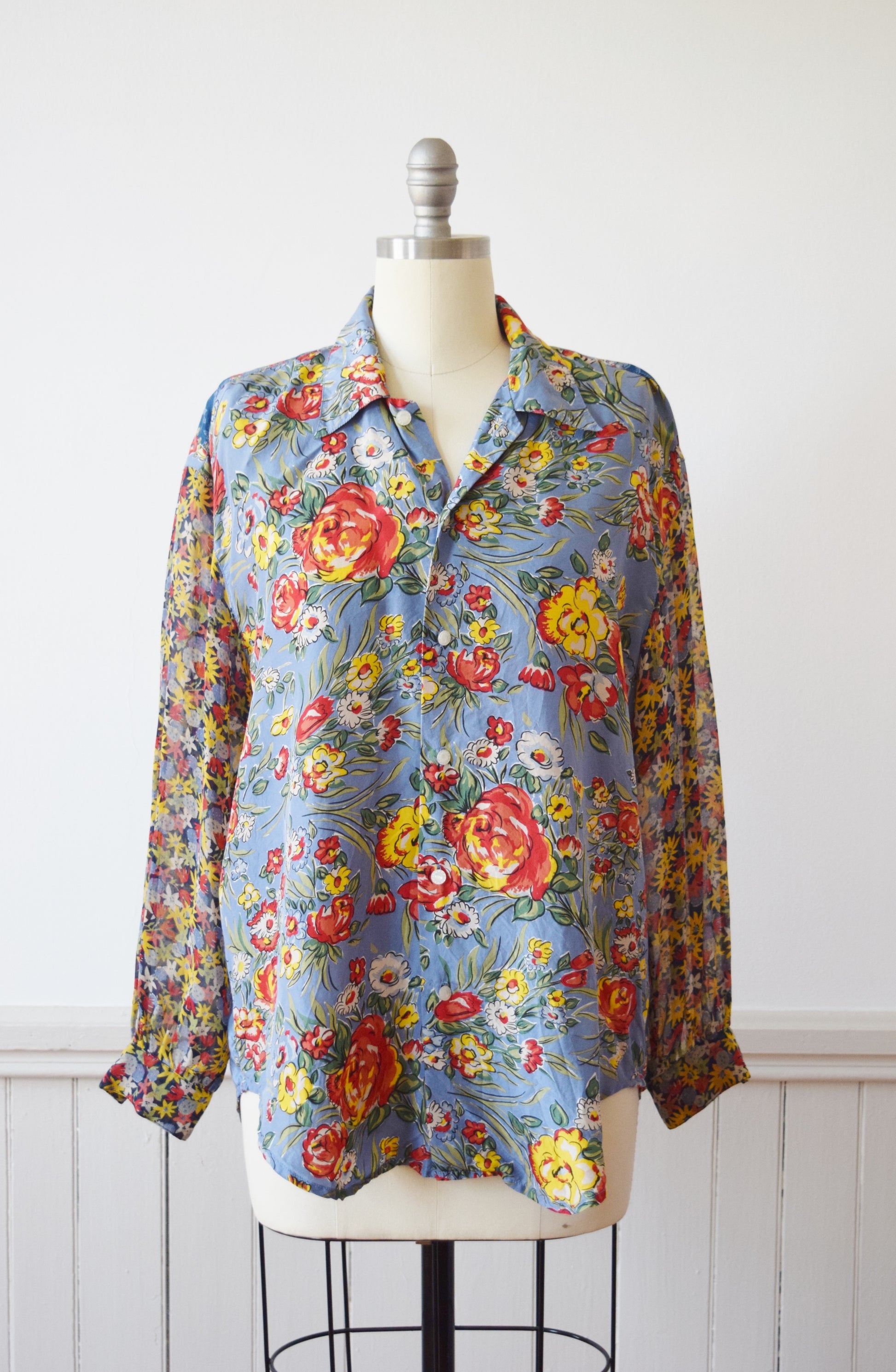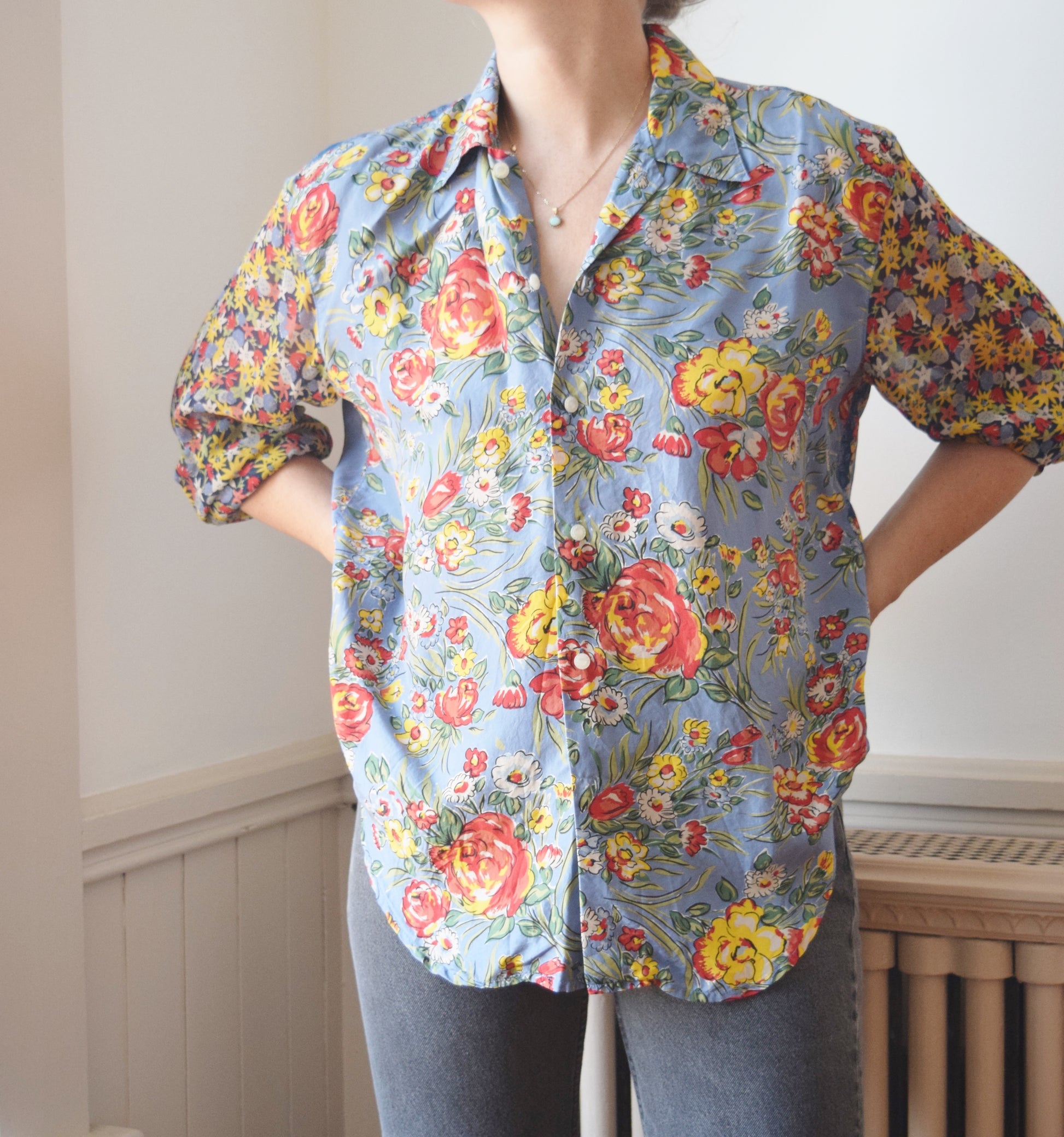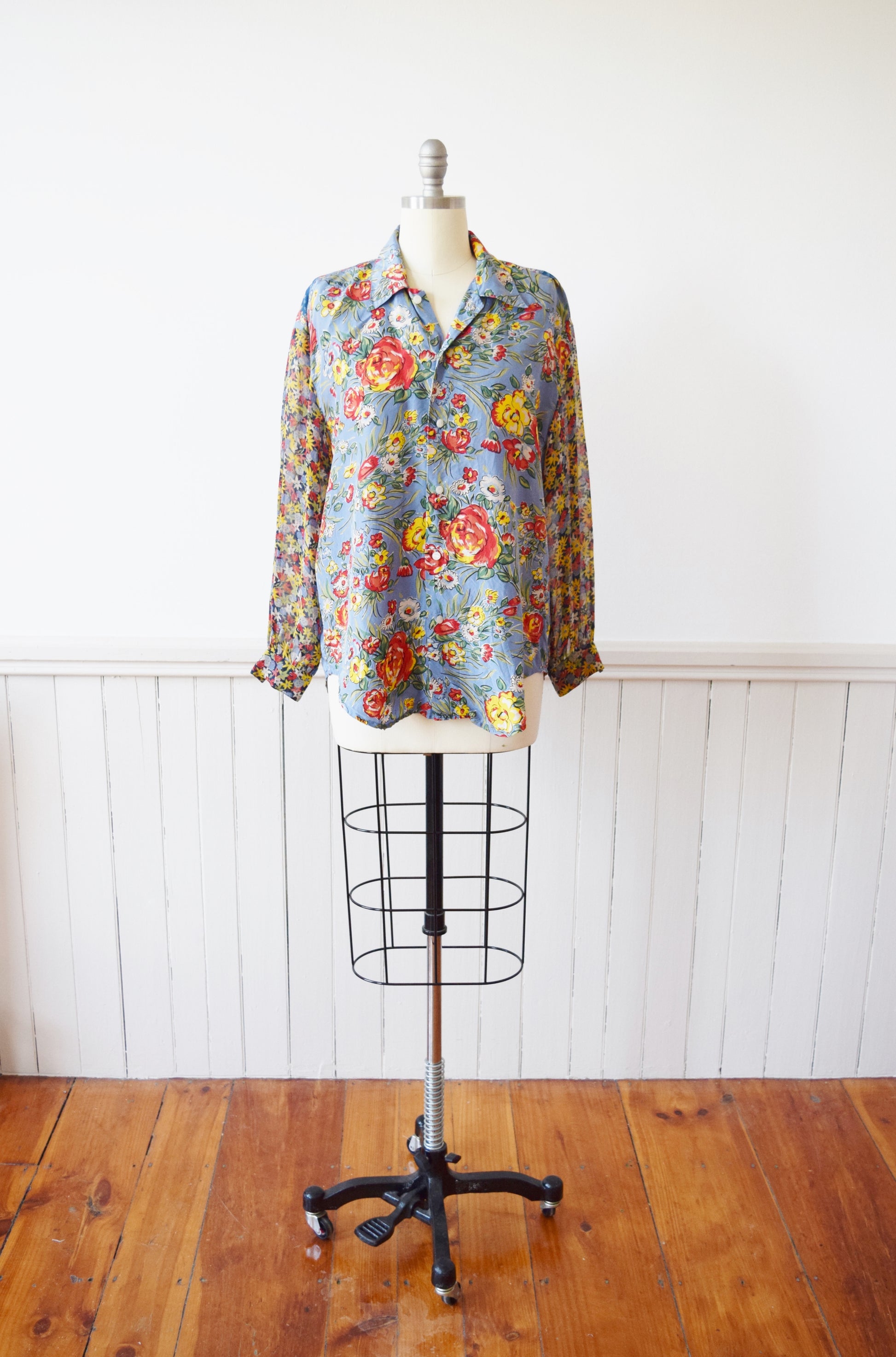 all silk in three coordinating but different prints. the sleeve in a semi-sheer crepe.