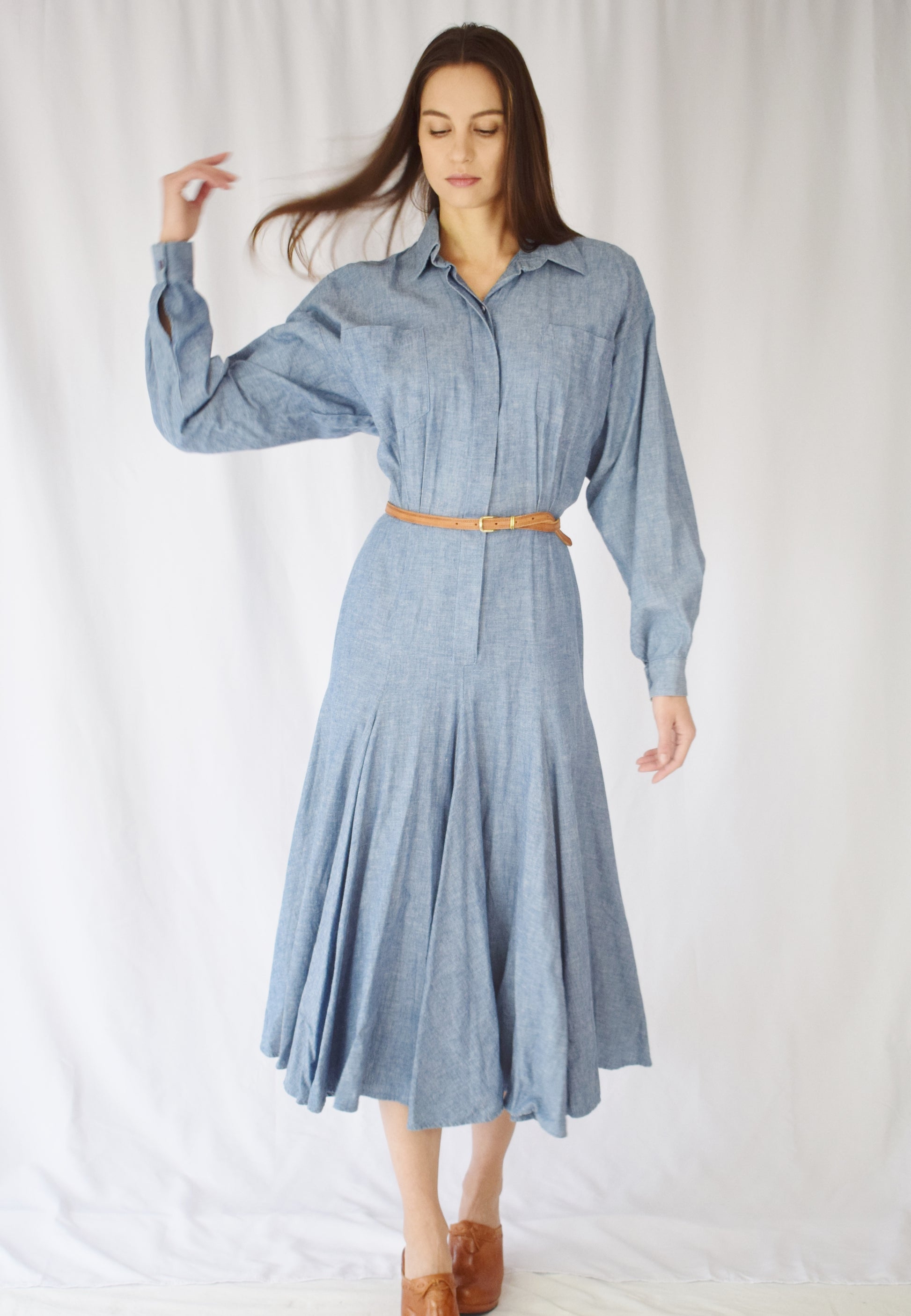 soft cotton chambray. relaxed fit shirt-style bodice, fitted waist, and a modified a-line skirt with very full bias-cut panels for great drape and swish. hidden button placket to hips. (belt shown not included)