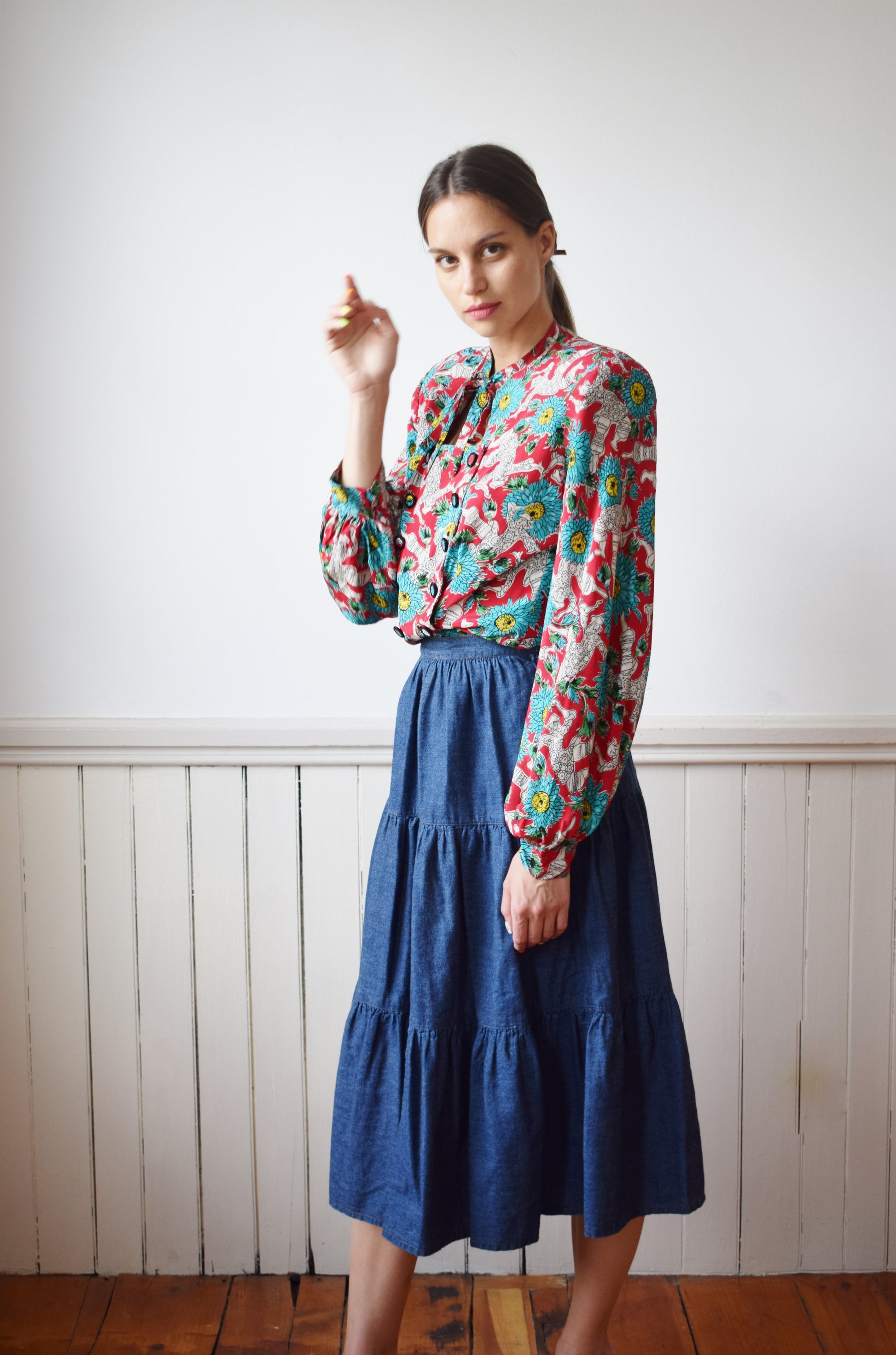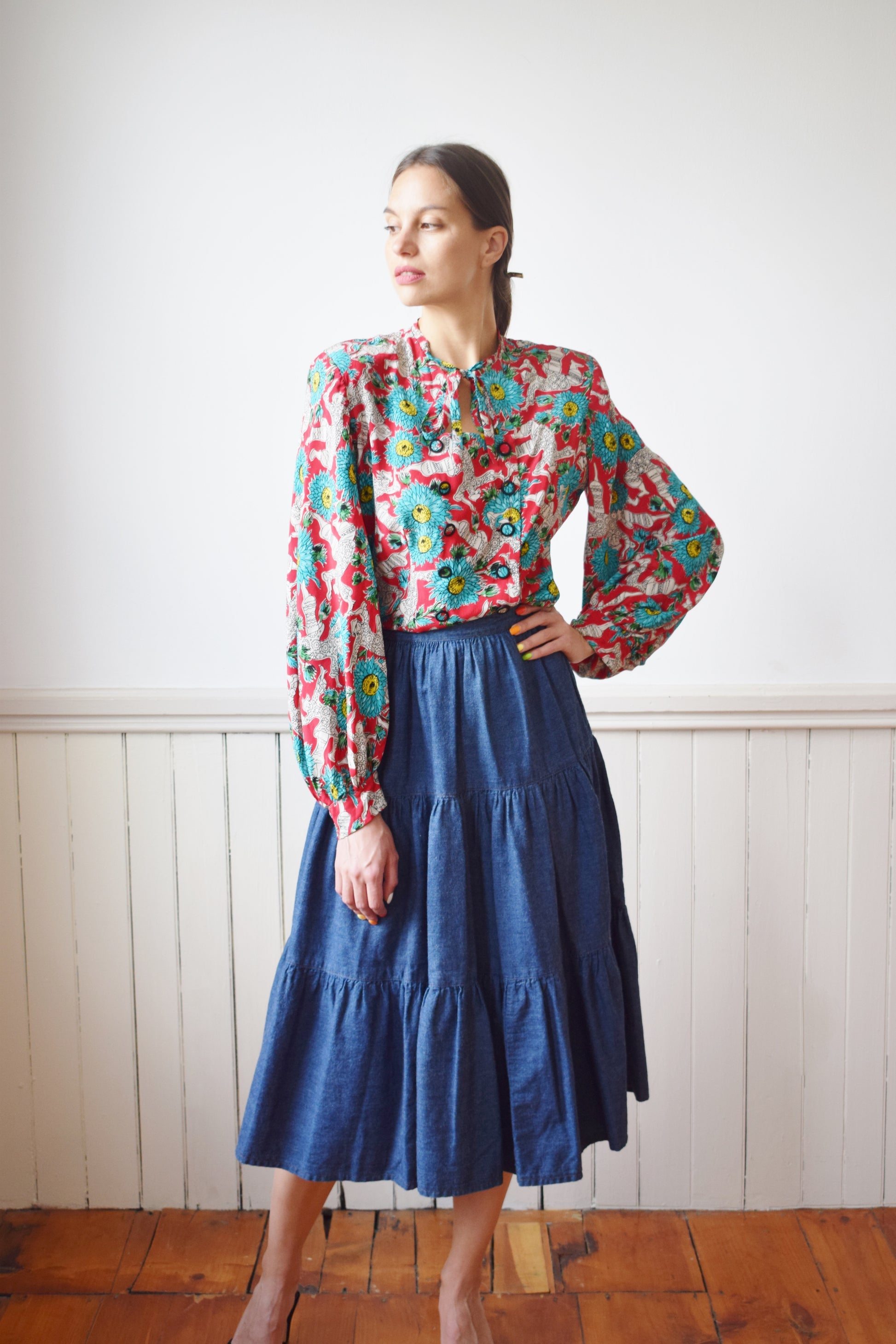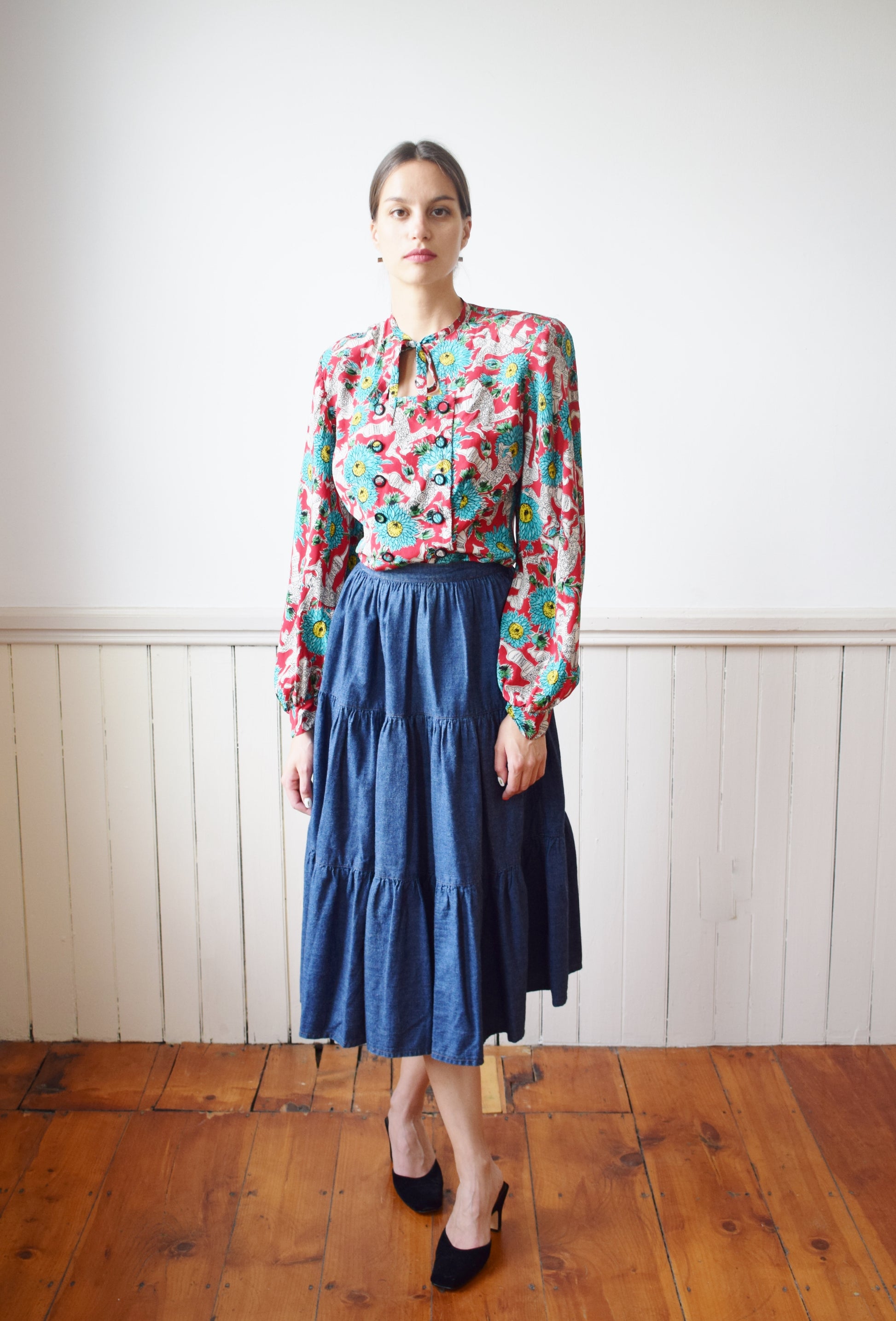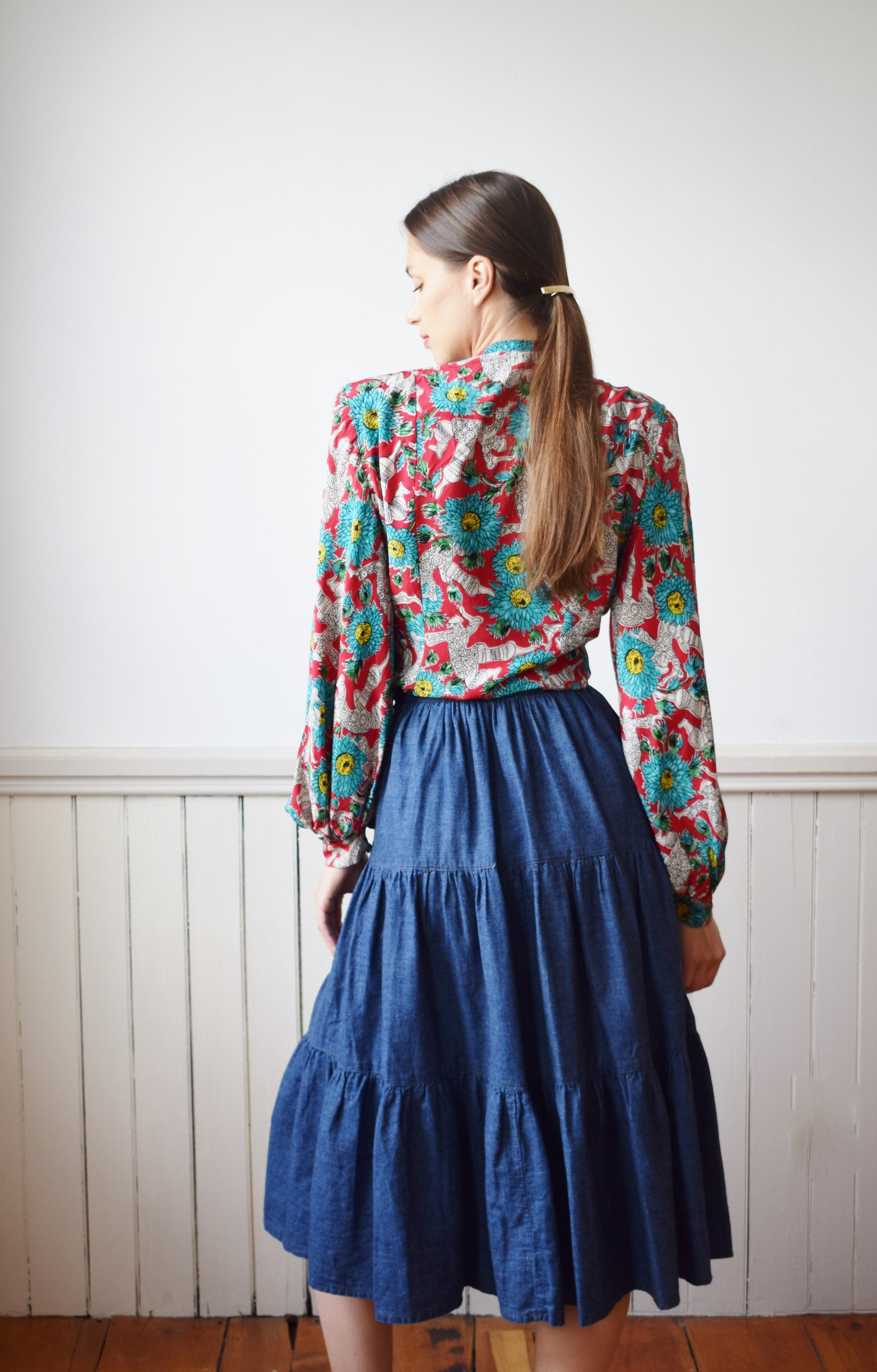dark wash cotton denim. full sweep with 3 gathered tiers. zips at the side.