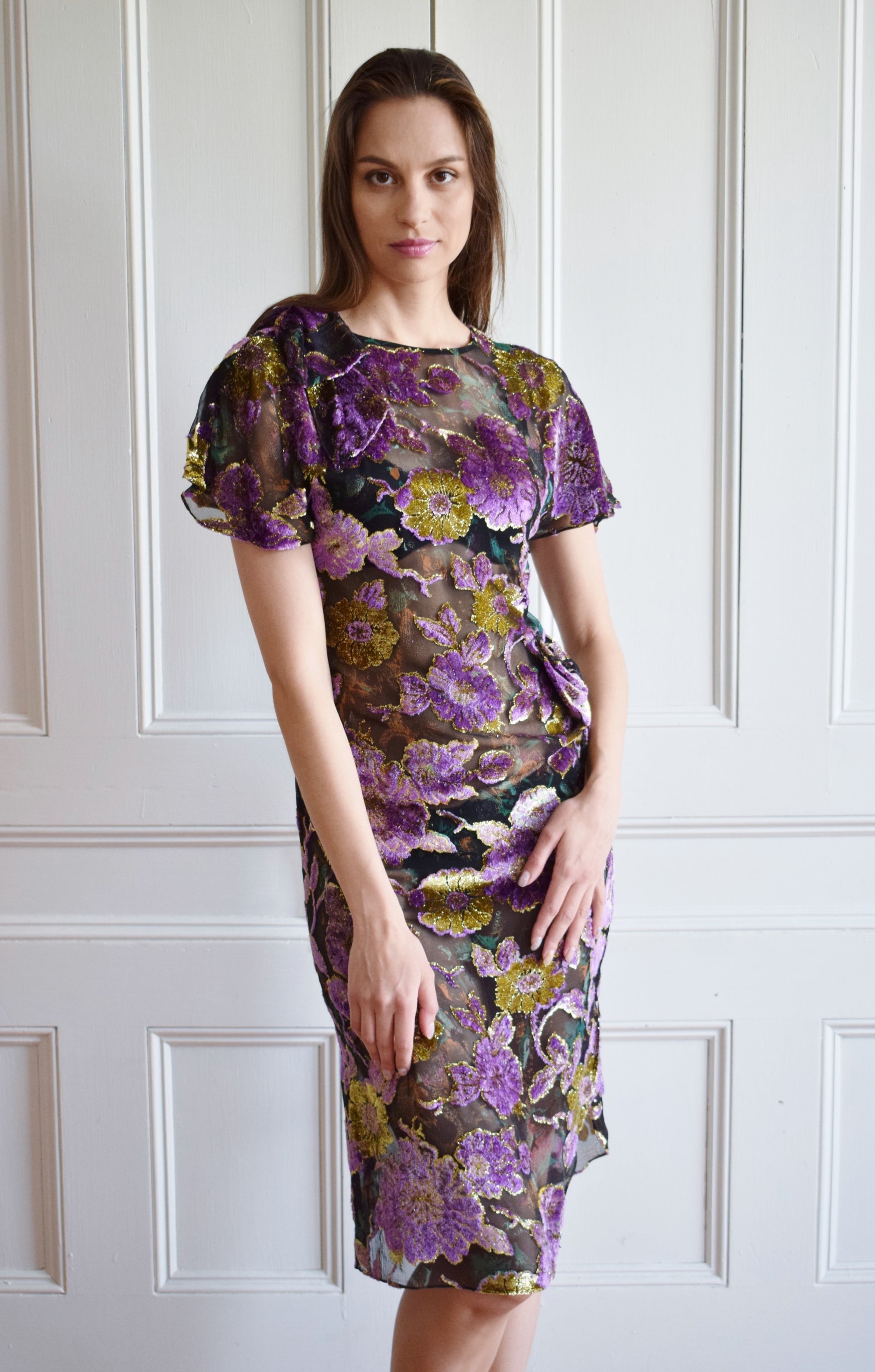 stunning burnout silk velvet: purple and gold flowers on a black a green ground. sheath with bow accents at shoulder and waist, curved side slit. sheer. pulls over head, keyhole button and loop at back neckline.