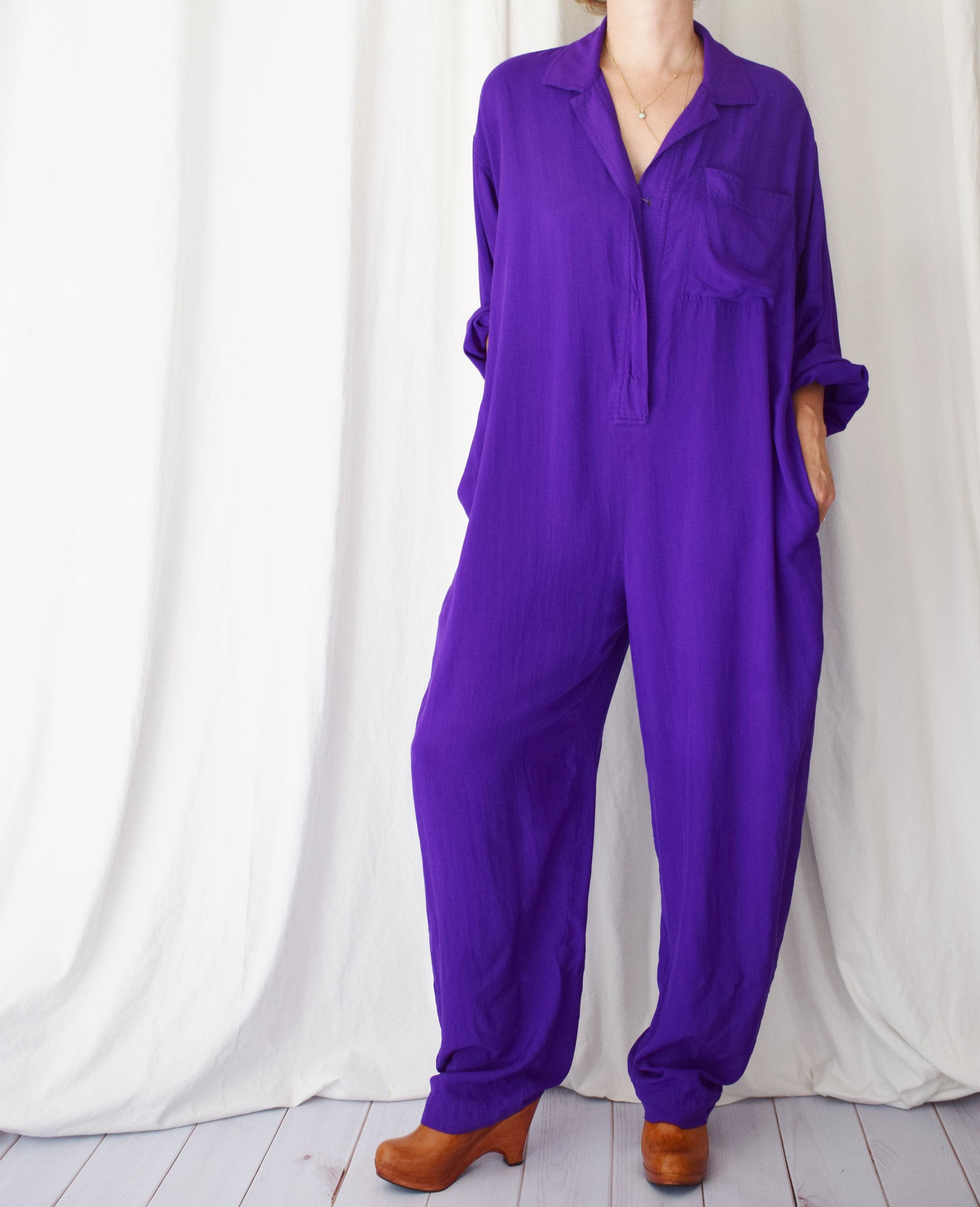 buttery silk weave in a saturated purple tone. a roomy/relaxed and tall fit. hidden button placket down the front to waist, side seam pockets.