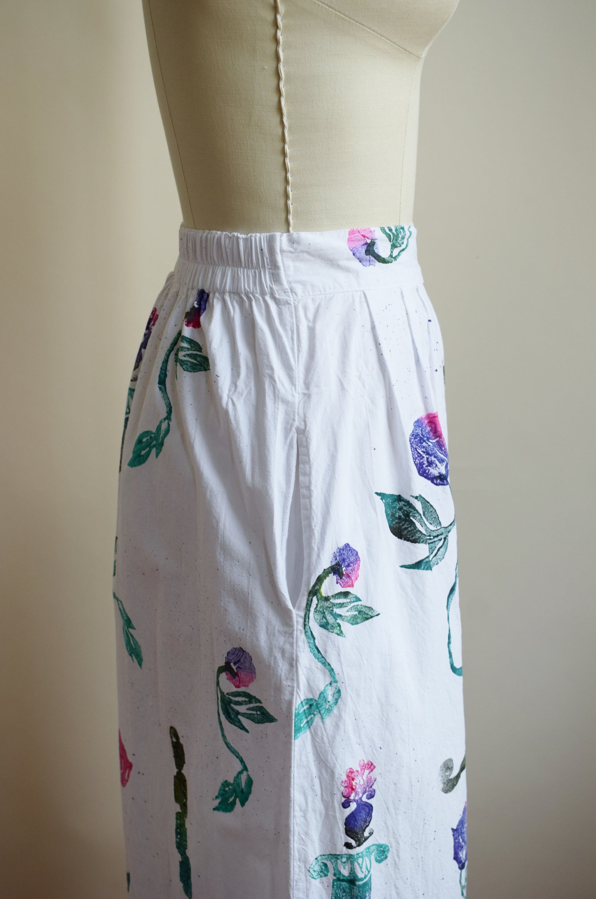 another amazing weirdo piece from a shop favorite, Play Alegre of San Diego: white washed cotton with all-over hand painted roses, vases, columns, and... snakes? and fine purple splattering. pleated and elastic waist with hip pockets and super wideleg silhouette.