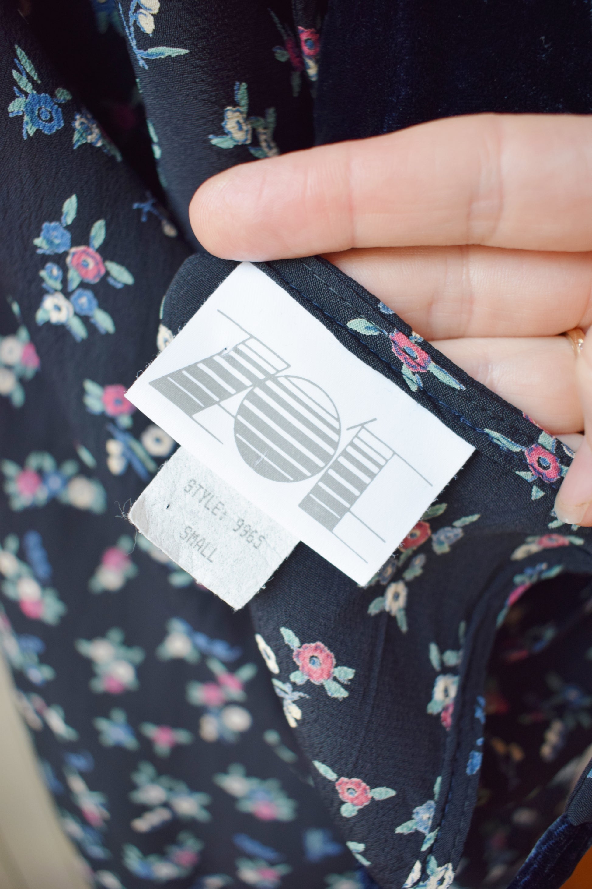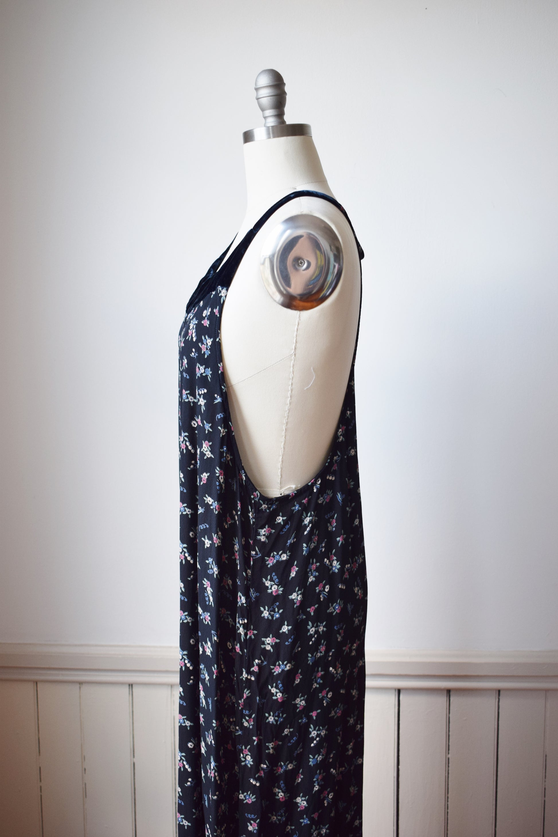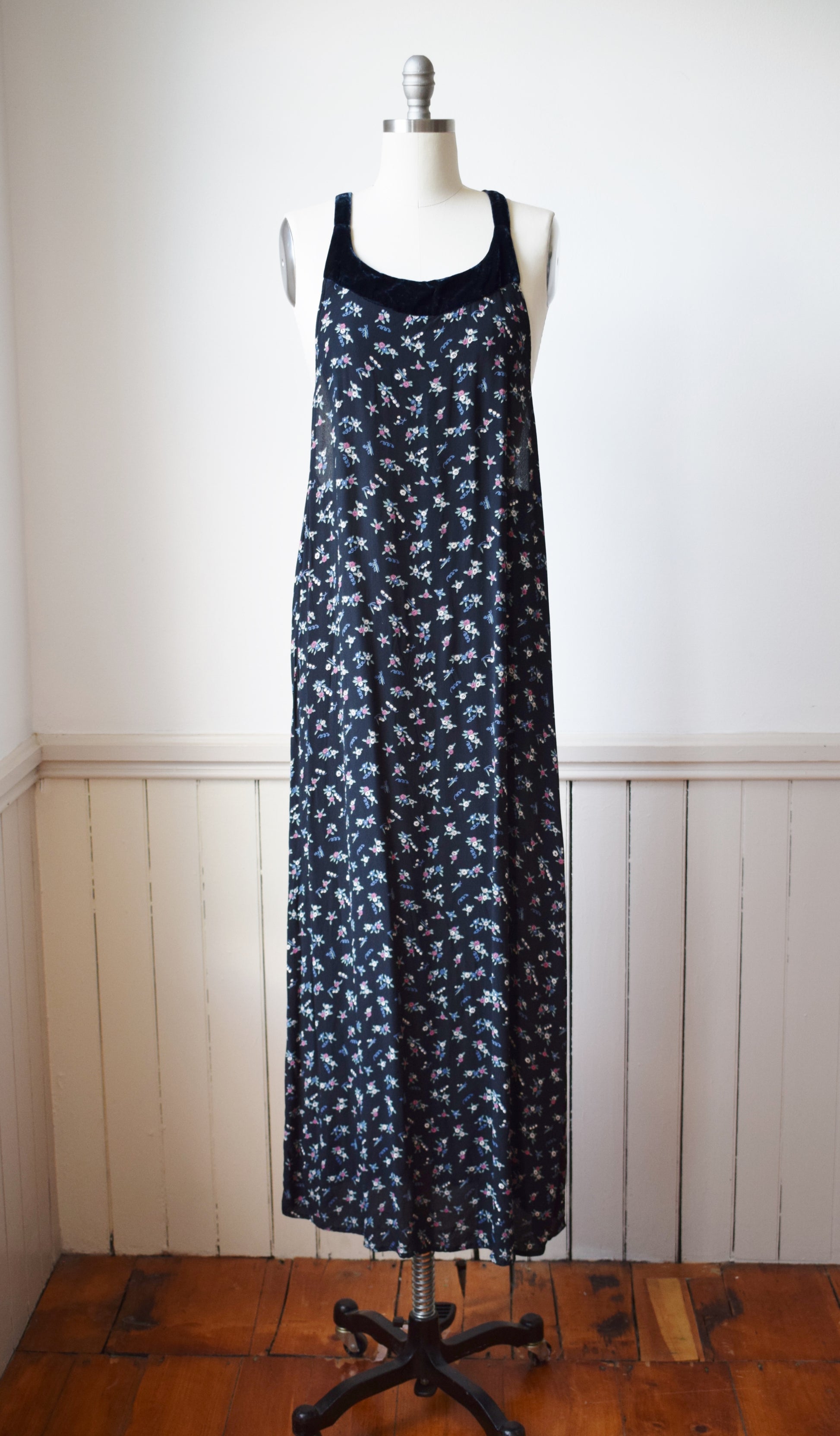 draped rayon crepe in a 1940s-inspired floral print with velvet neckline and strap accent. deep open sides and racer back.