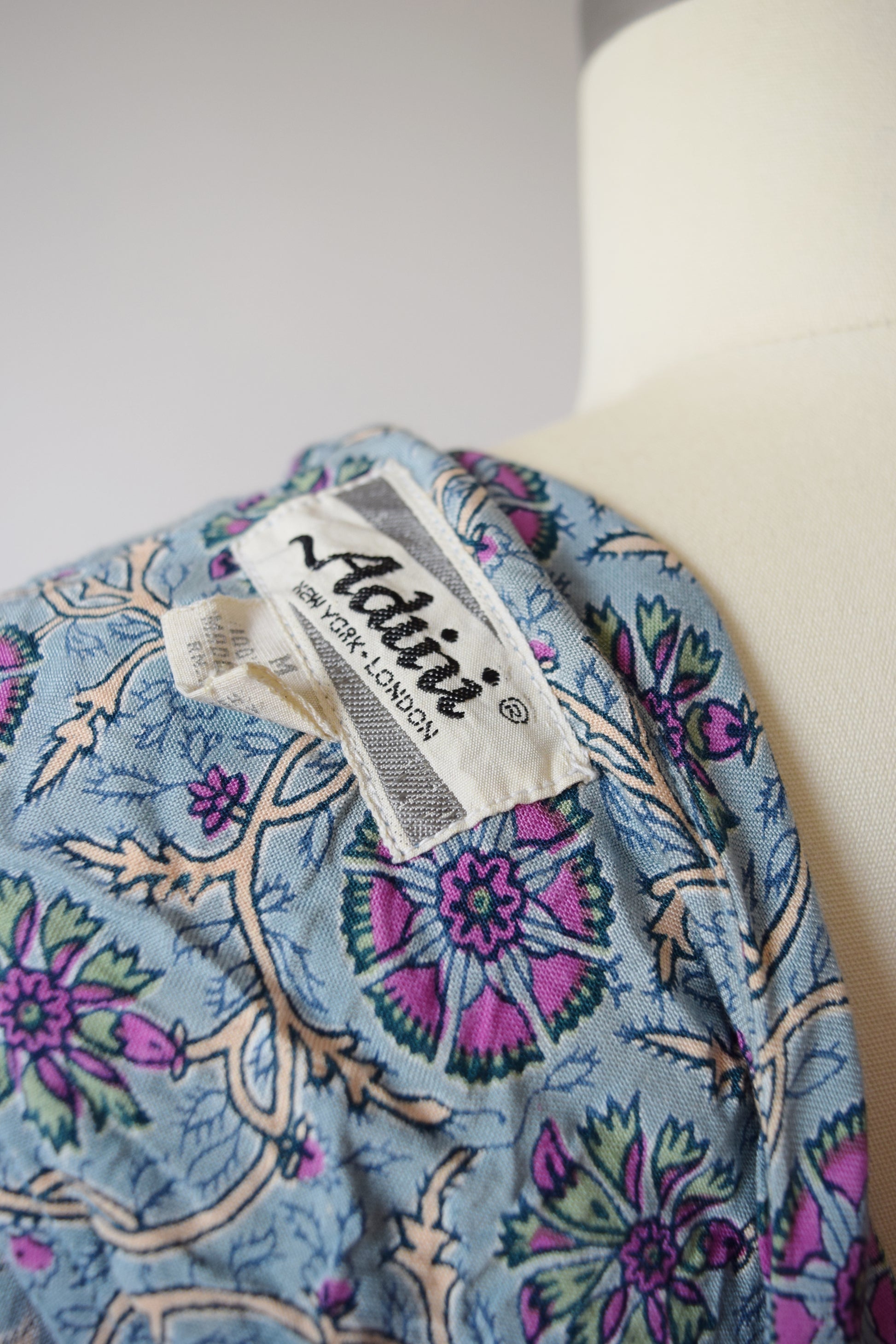 Scrolling floral block print. wide collar, dropped waist. Relaxed shift silhouette.