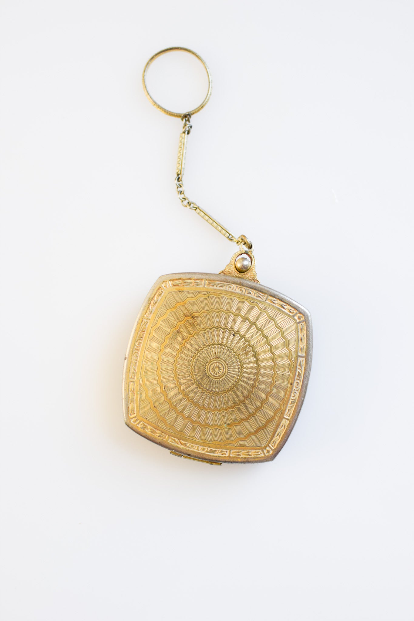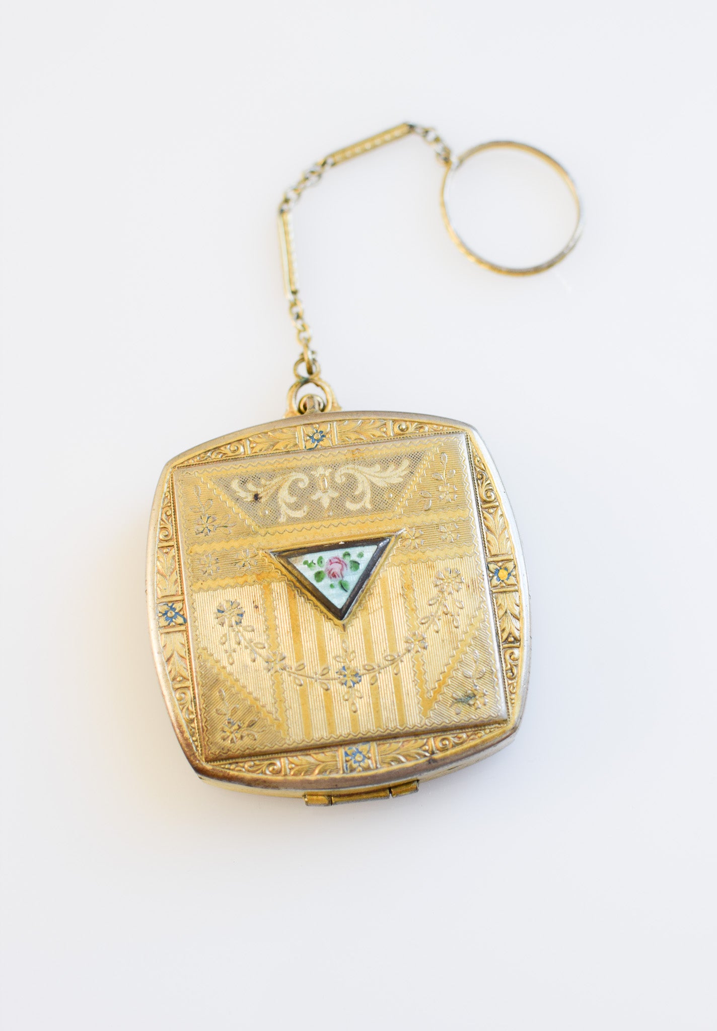 gold tone metal with highly detailed machine turned decoration and a center guilloche enamel rose accent. interior compartment missing powder and applicator, fill it how you like! short chain and finger ring. unmarked.