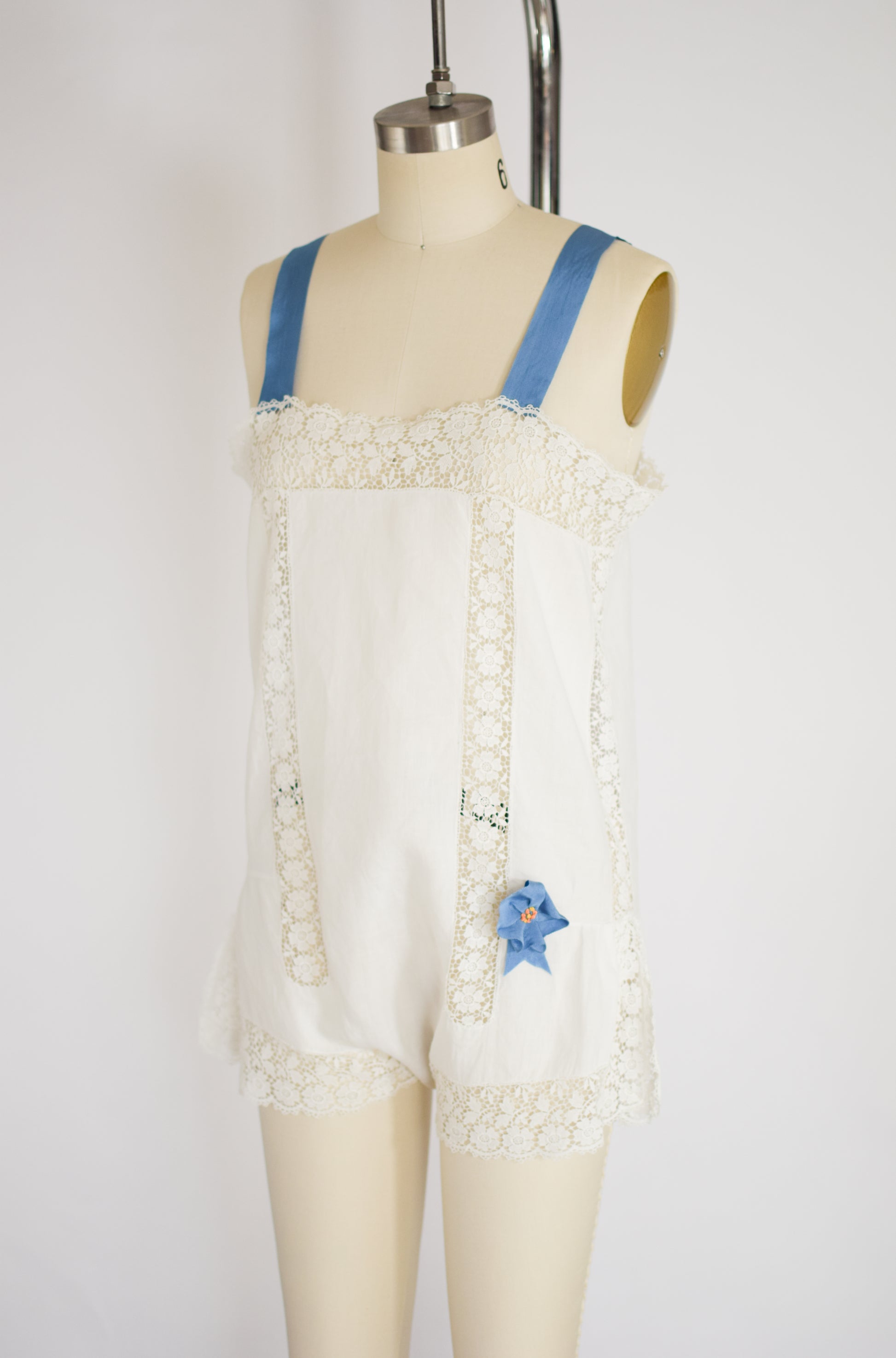 white cotton with floral eyelet lace inset panels and trim. the shorts with gathering and high slits. Pulls over head, fastens at the crotch with two MOP buttons. Antique robin's egg blue grosgrain ribbon straps and rosette were added at Fieldwork.