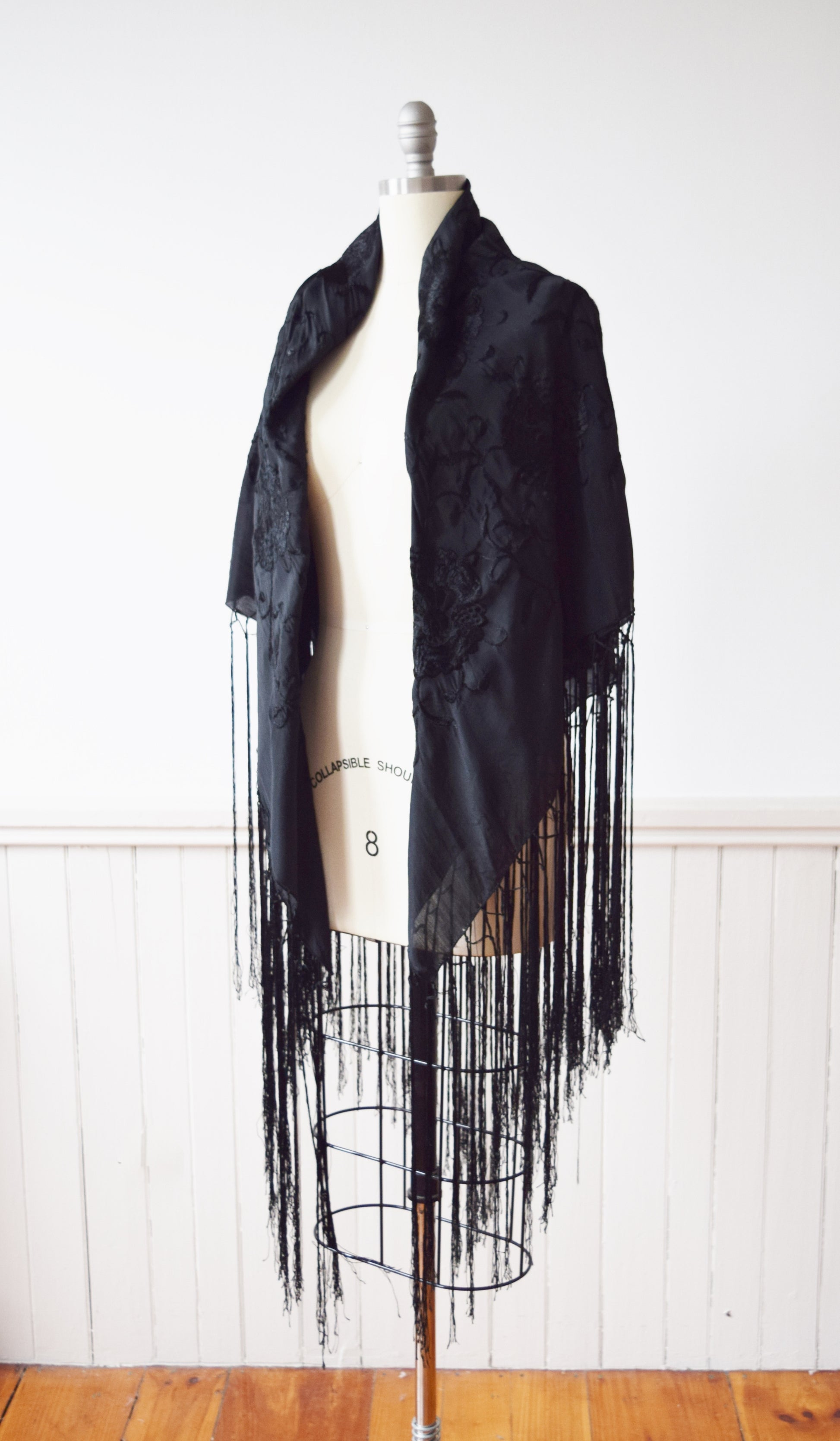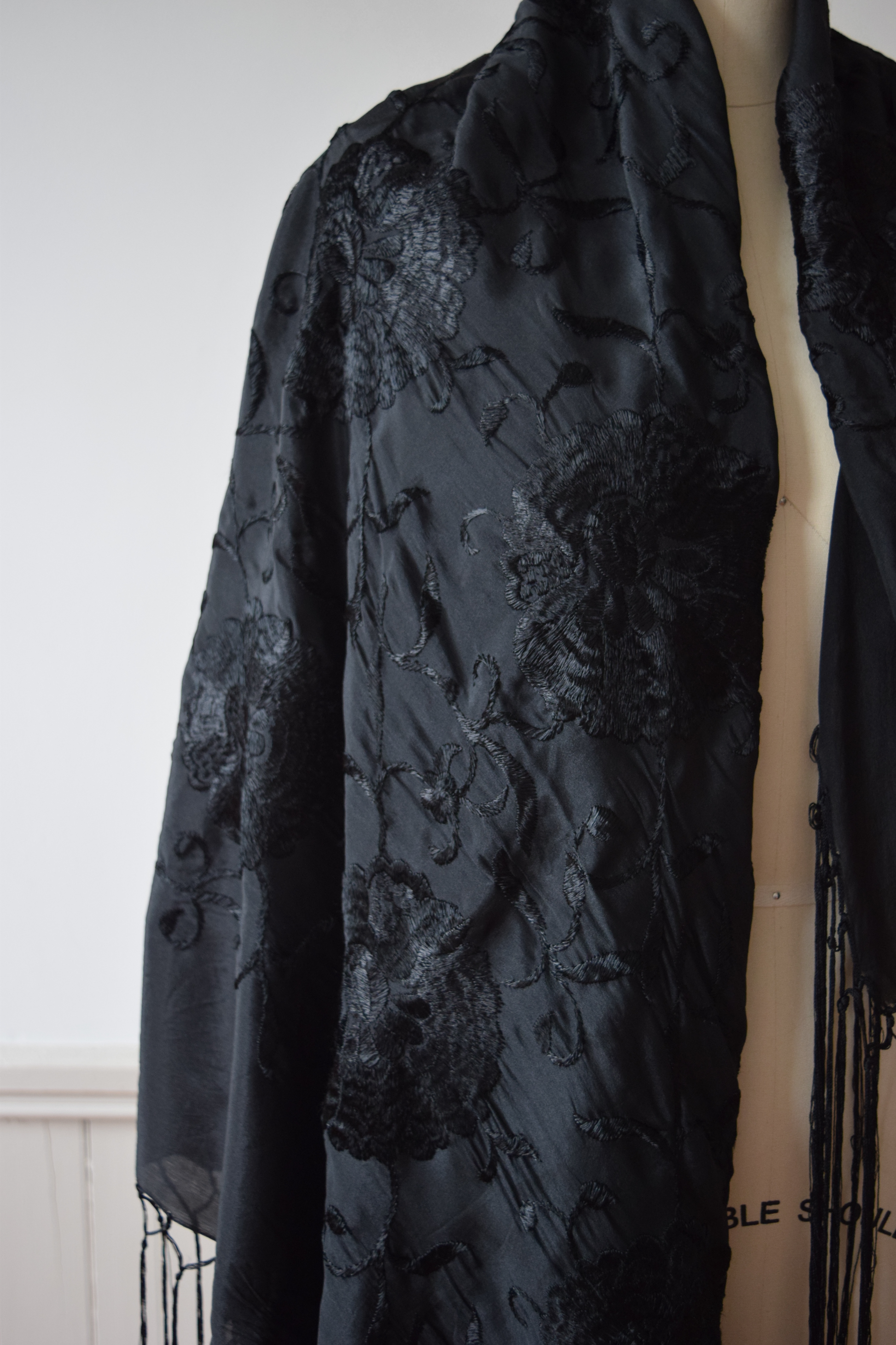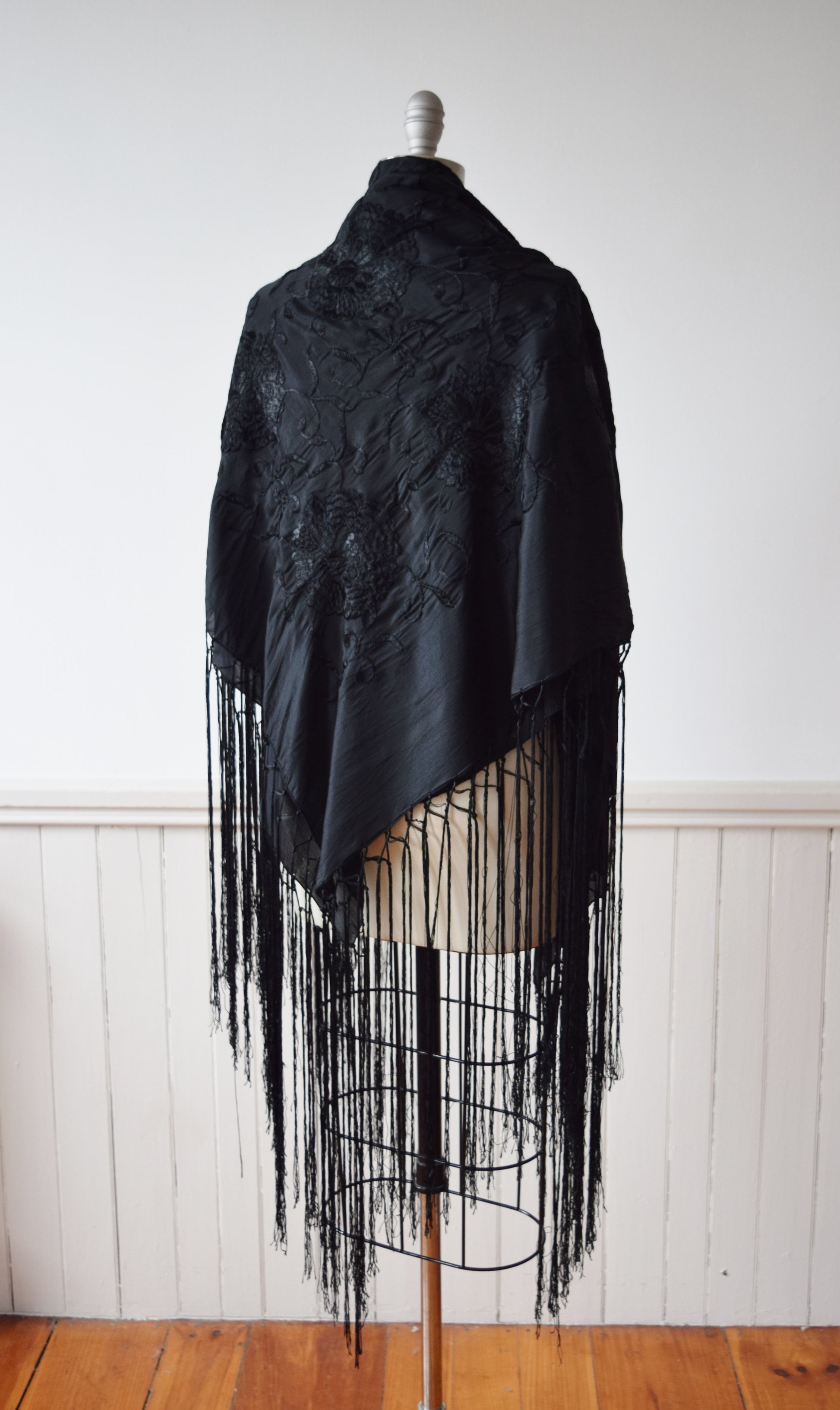shimmery black silk with tonal black silk floral Chrysanthemum embroidery. long fringe on all four sides.