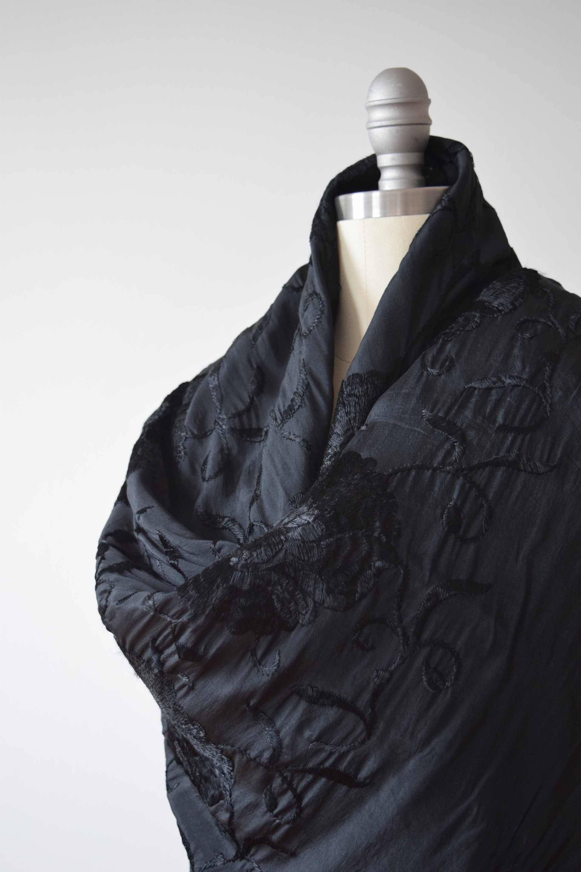 Antique Embroidered Black Silk Piano Shawl