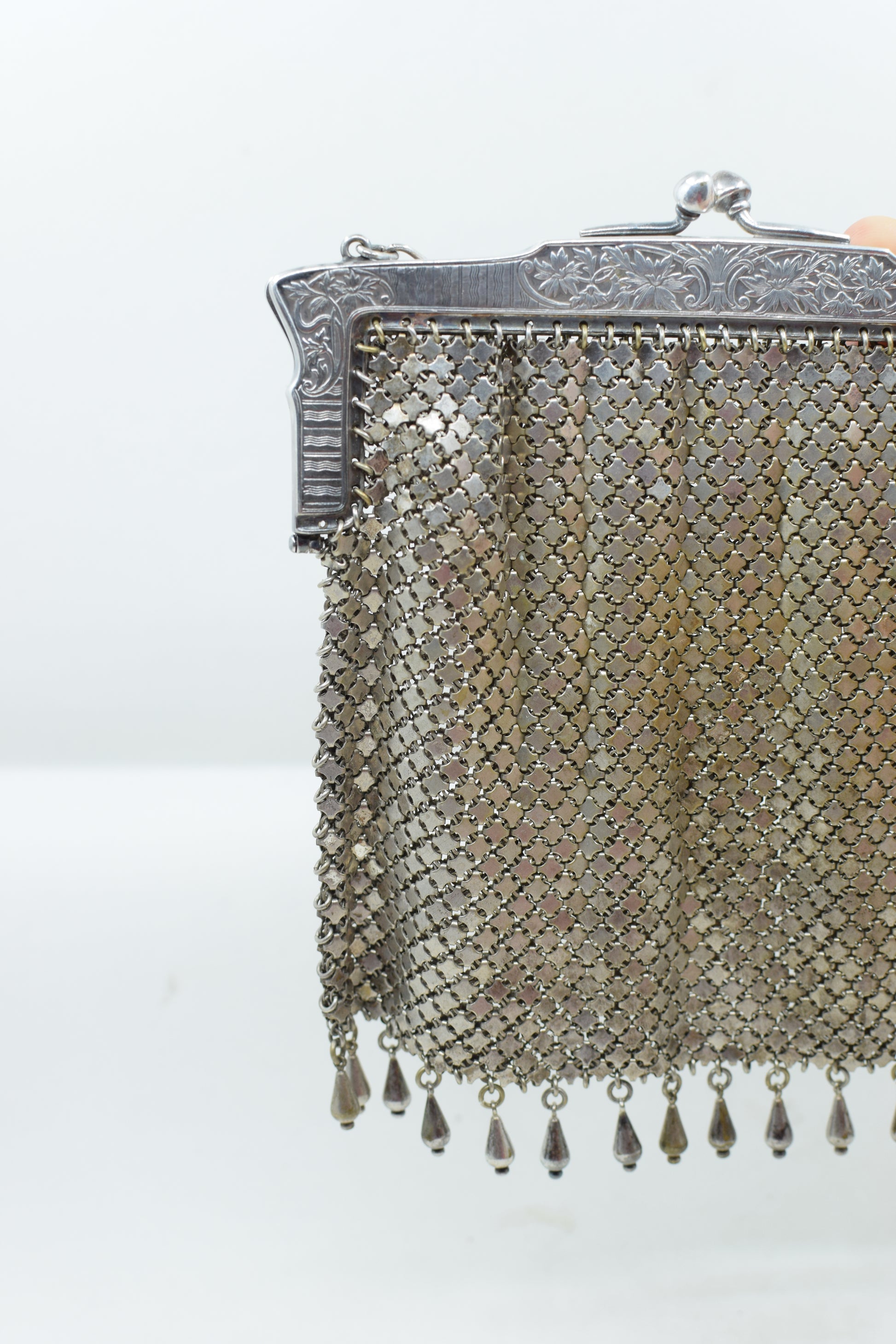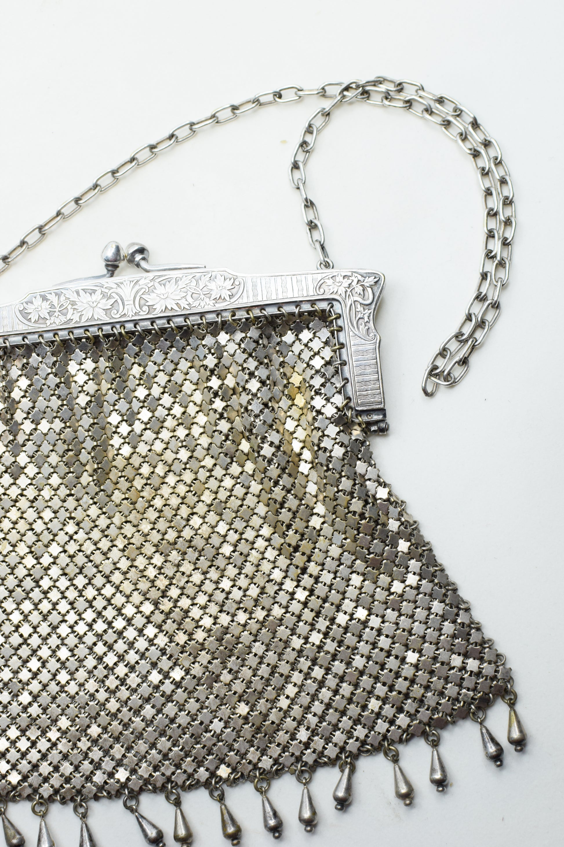 silvery metal mesh body suspended on a silver clasp etched with scrolling Art Nouveau floral details and a meaty chain link handle. finished along the bottom with metal "sinkers". great weight and feel.