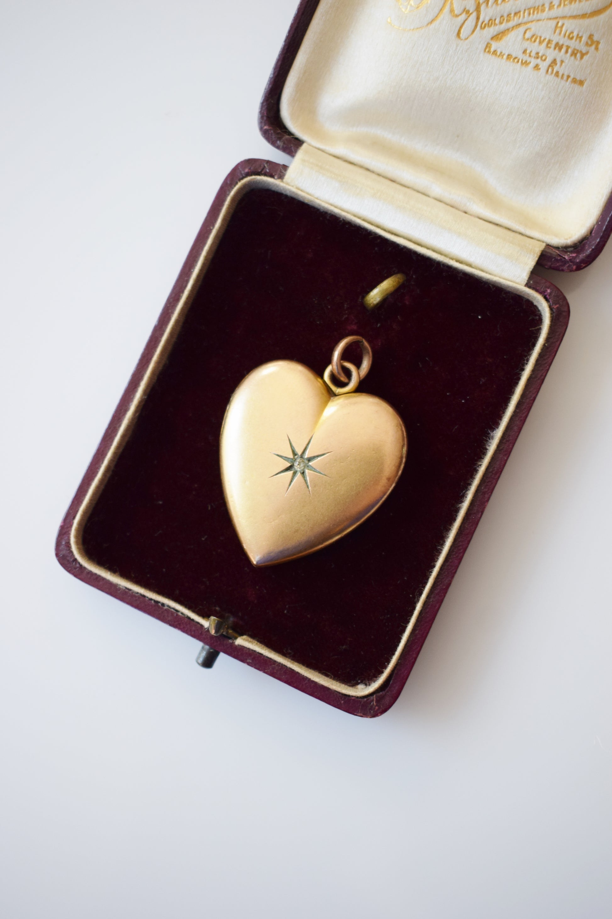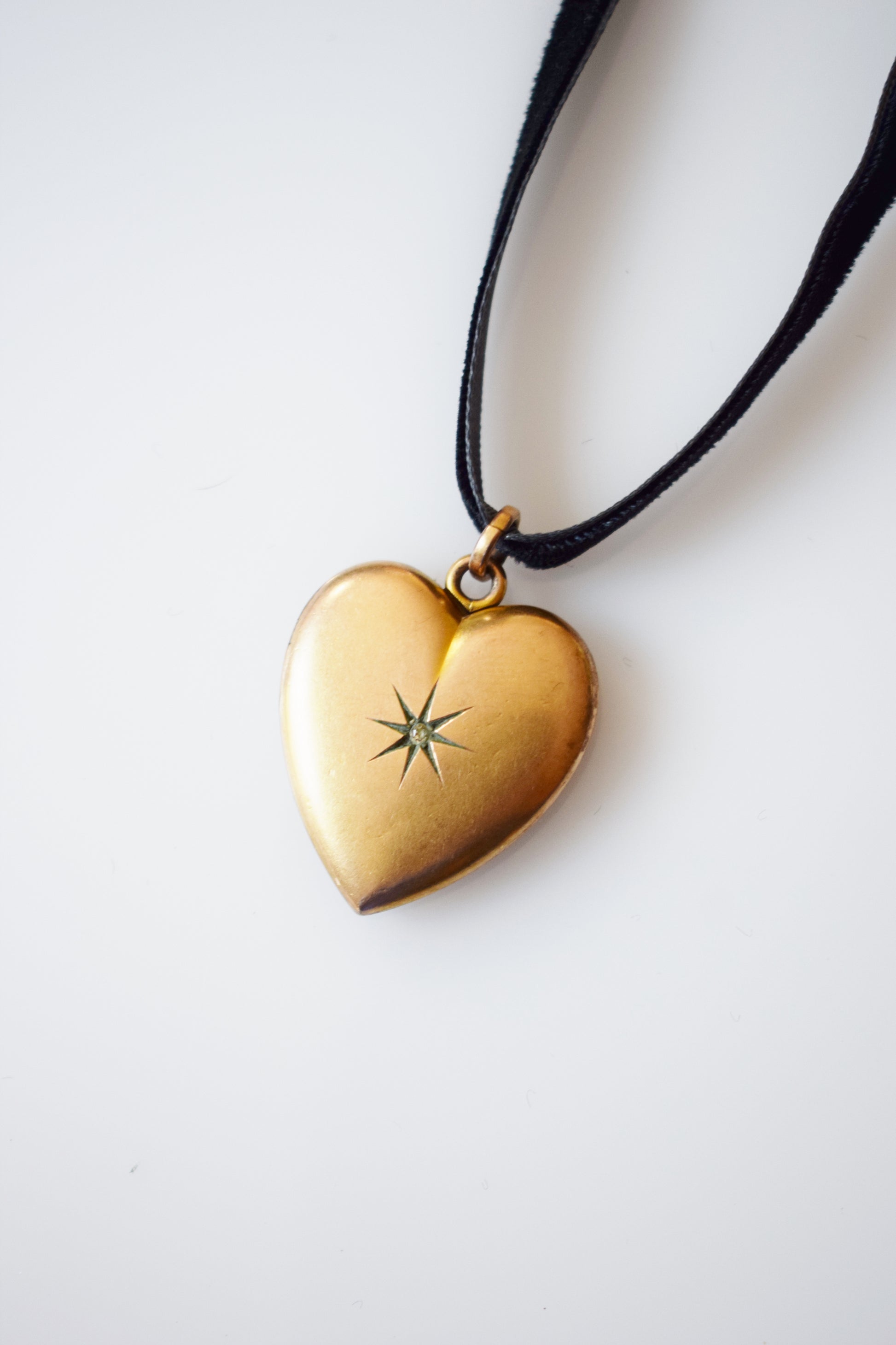 larger-sized warm gold-fill heart locket with central rhinestone-set starburst design. inscribed on the back with decorative monogram "MHK". the interior with compartments for stashing photos, lockets of hair, poems, or mantras. with all original removeable "frame" components and original jumpring.