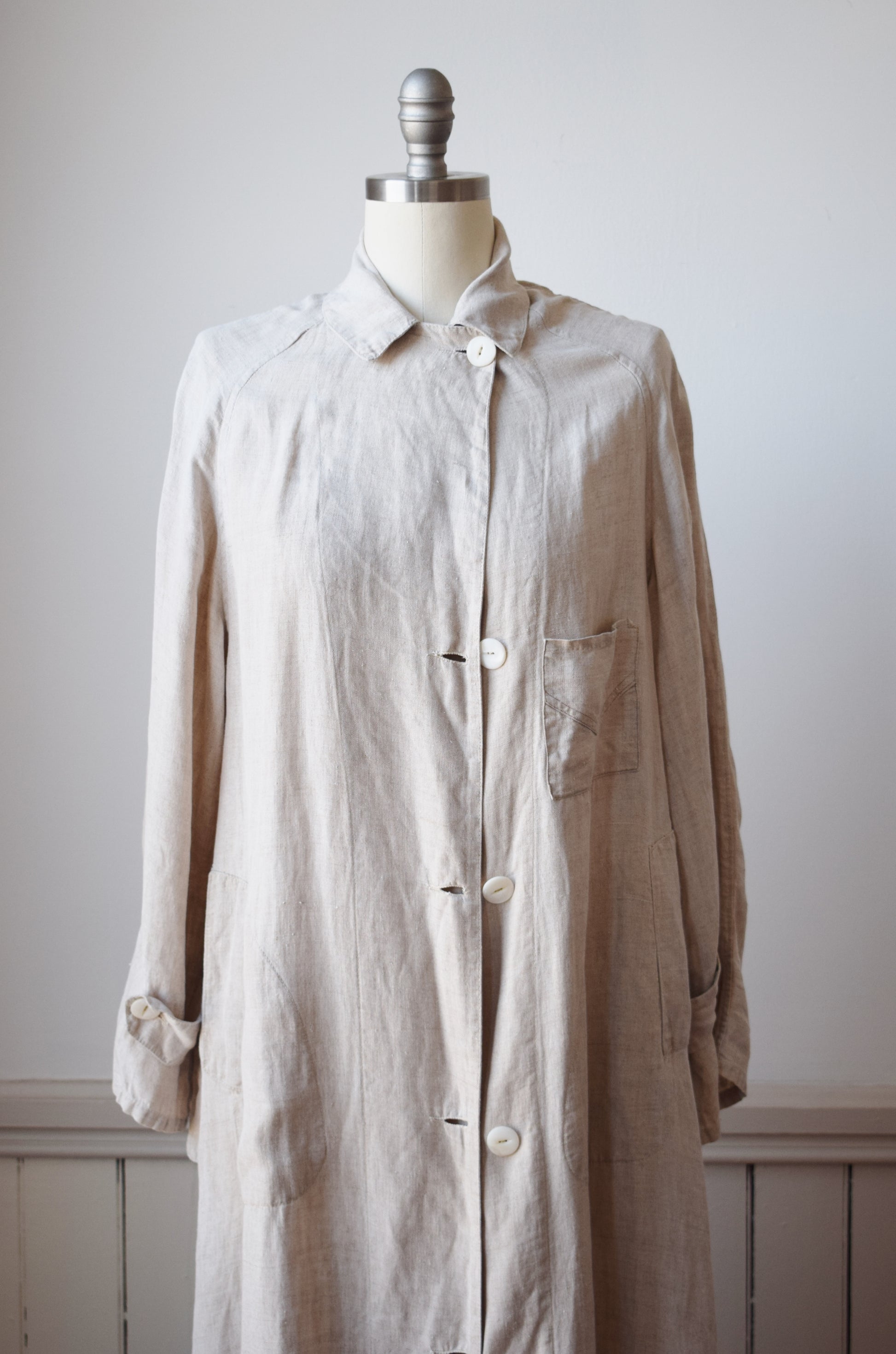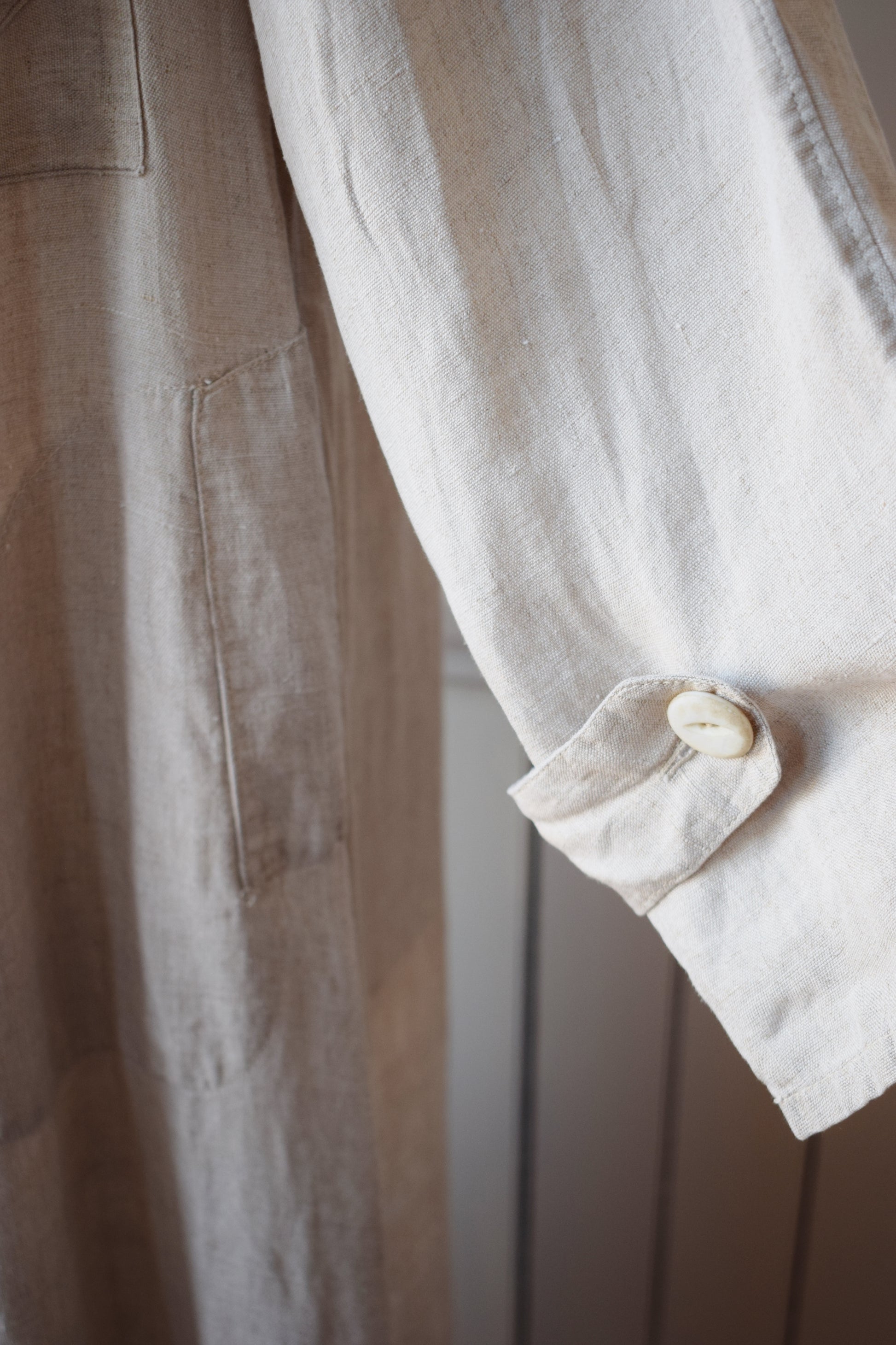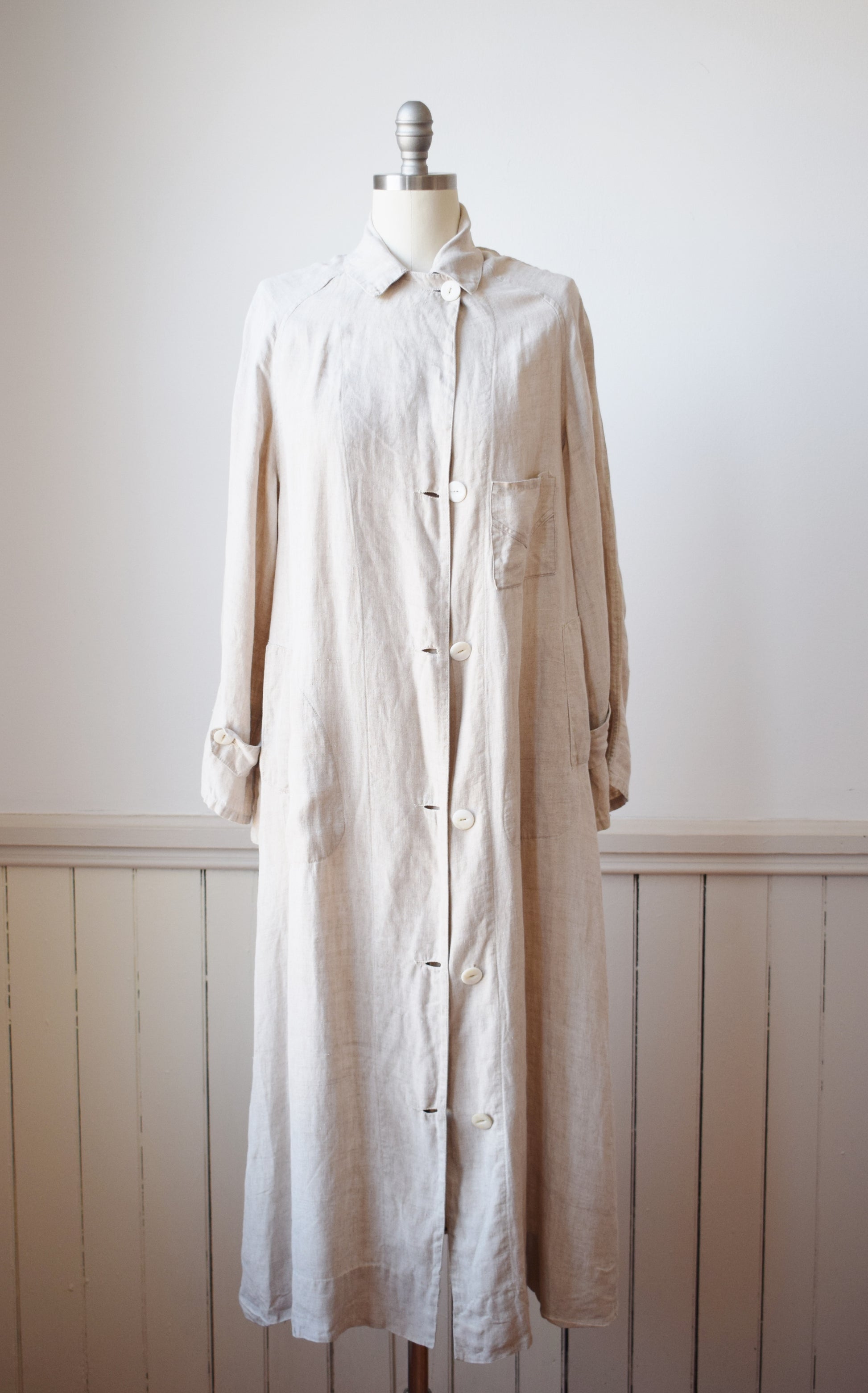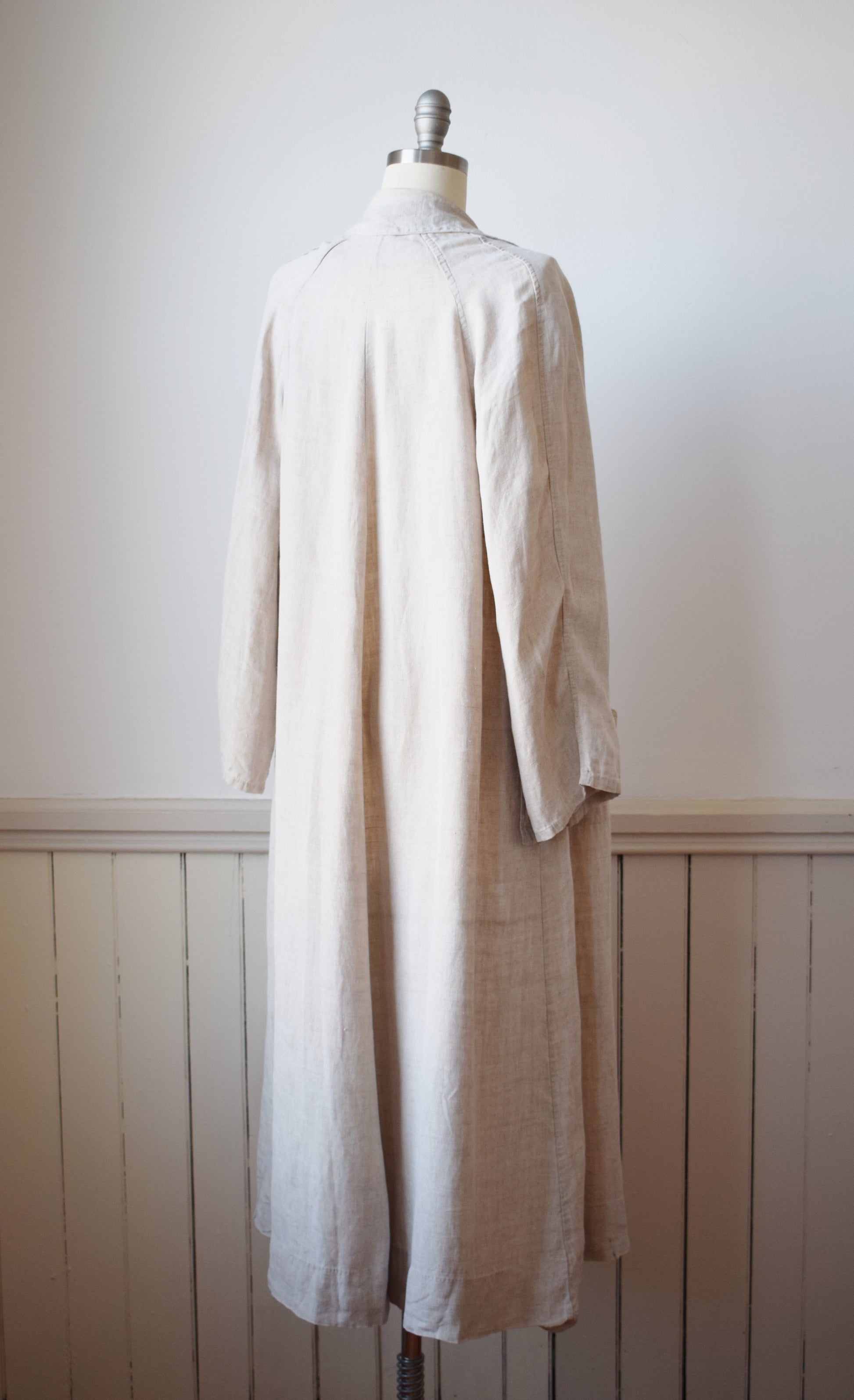 a "driving jacket" in beautiful lightweight natural linen. raglan sleeves with cuff accents, breast pocket, hip pockets, and open side "pocket" on the right to access interior garment pockets. swing cut with great drape. mother of pearl buttons, lovely topstitching and finishing details through out.