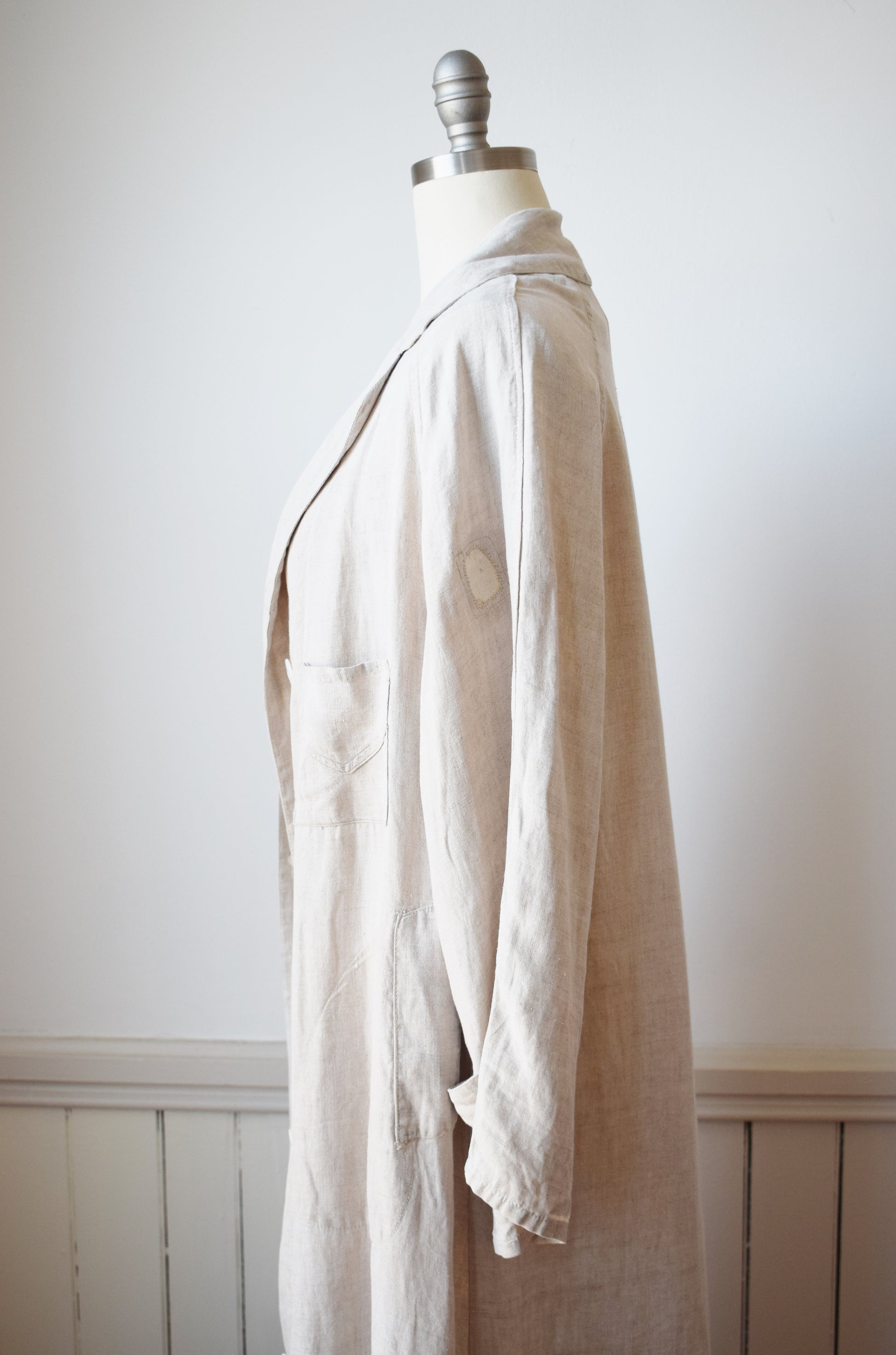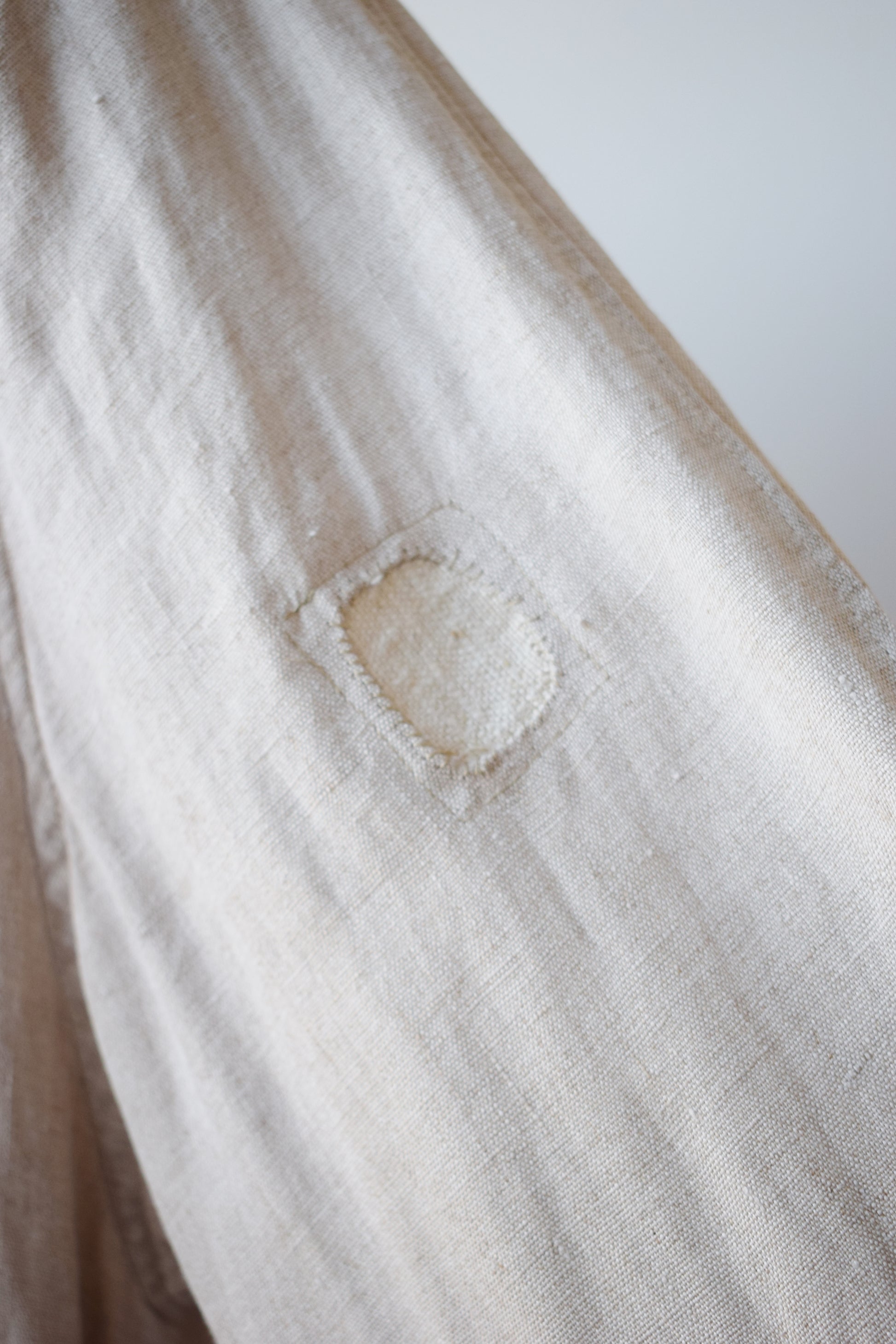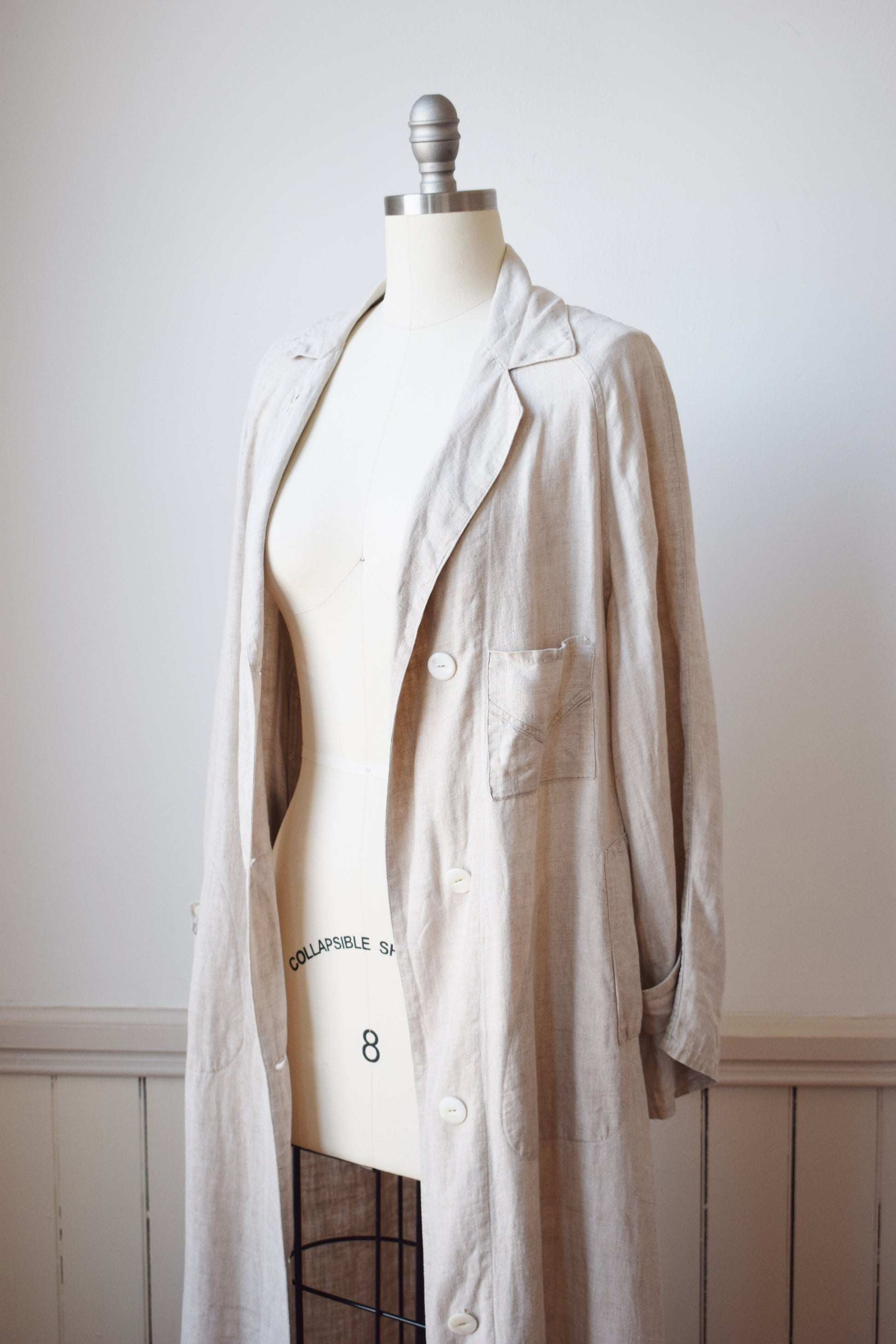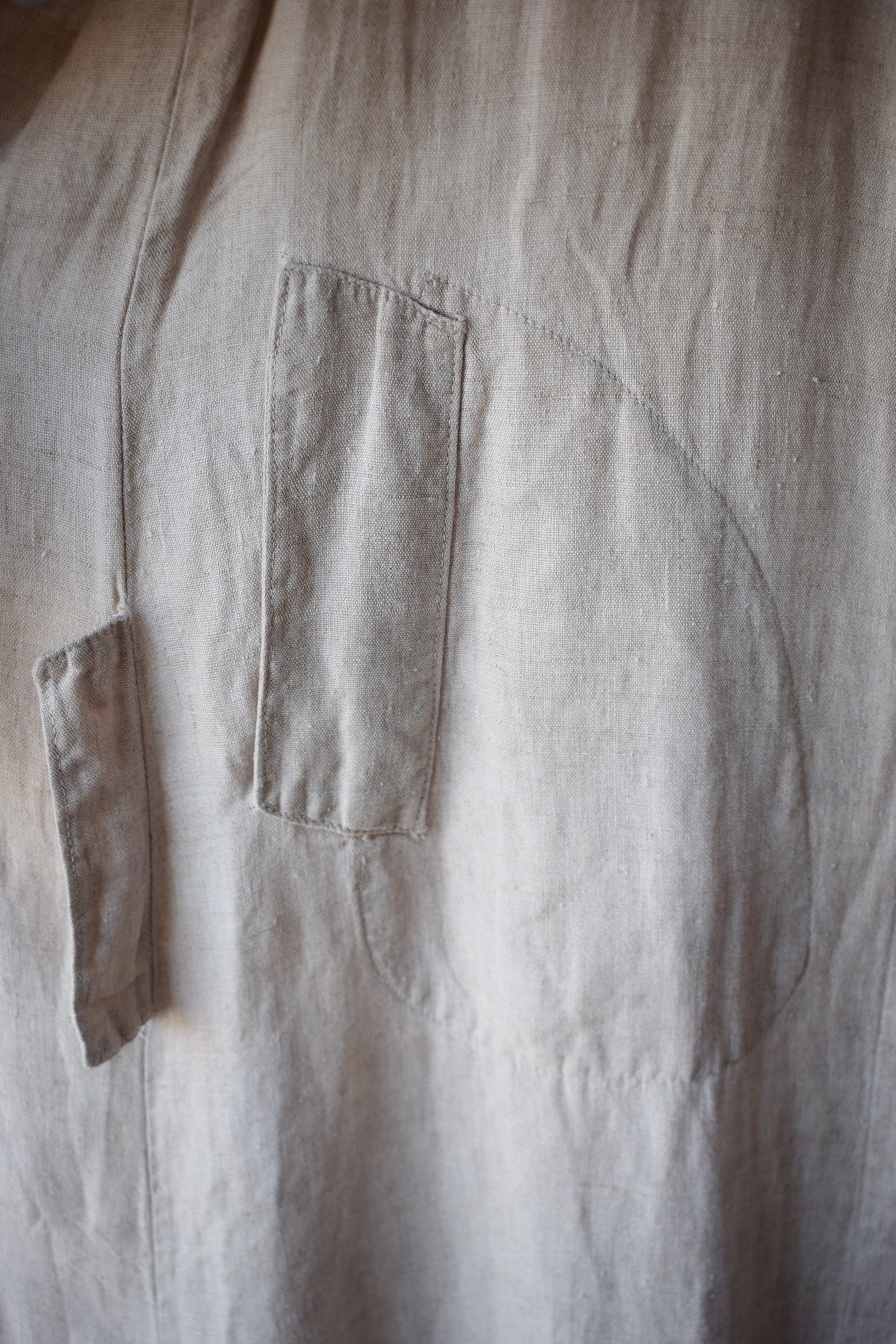 a "driving jacket" in beautiful lightweight natural linen. raglan sleeves with cuff accents, breast pocket, hip pockets, and open side "pocket" on the right to access interior garment pockets. swing cut with great drape. mother of pearl buttons, lovely topstitching and finishing details through out.