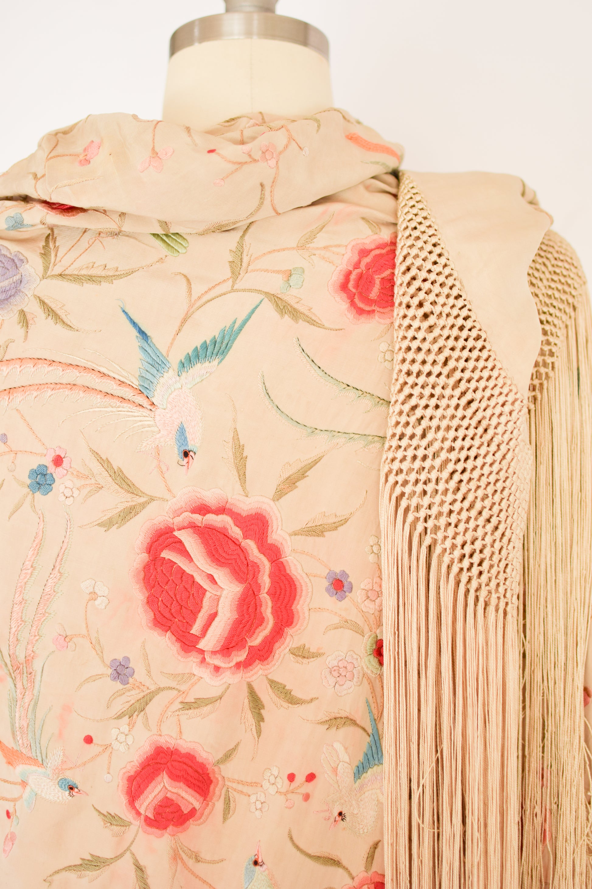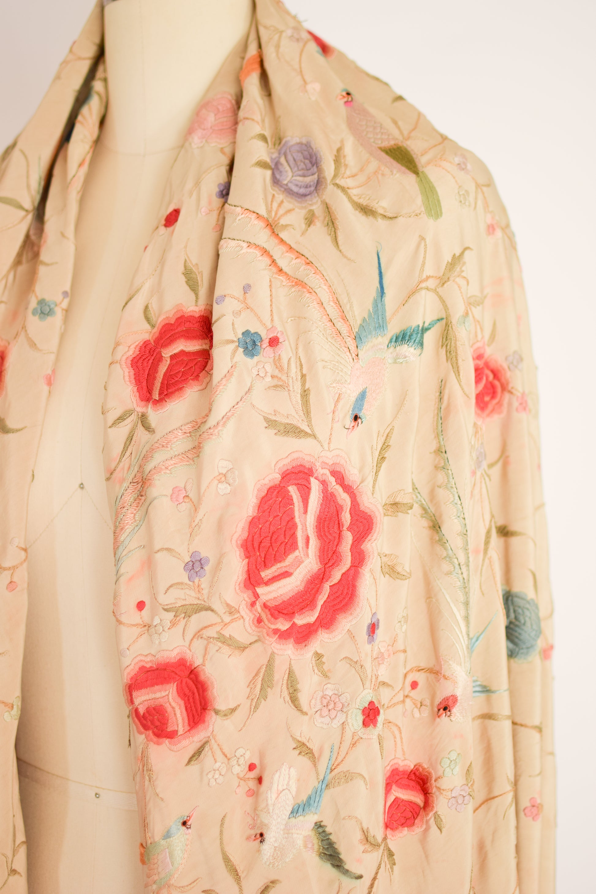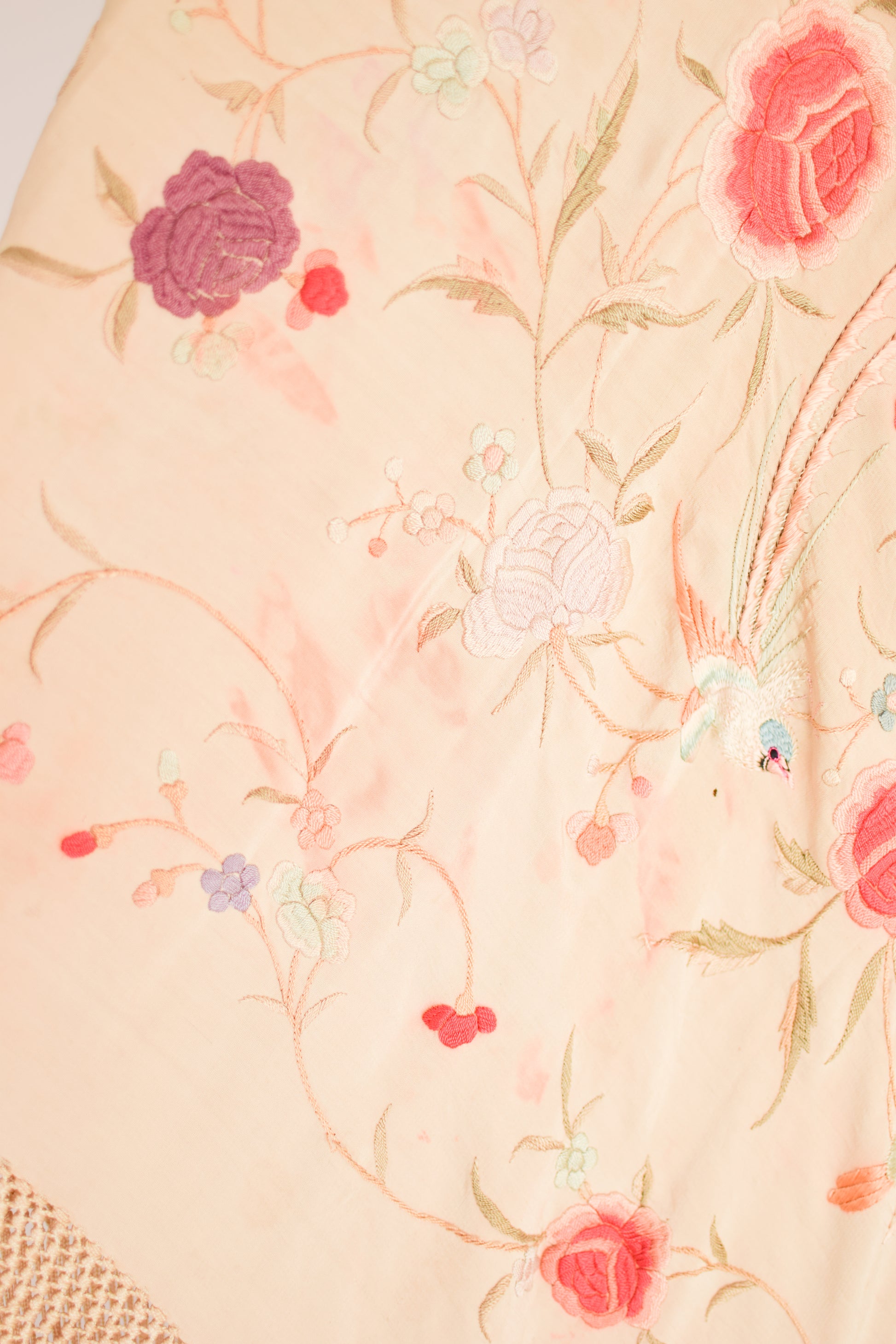 large ecru silk ground with dramatic knotted tassel trim. Embroidered with scrolling floral motifs and song birds in a beautiful pastel colorway that includes peaches, pinks, teals, lavenders.