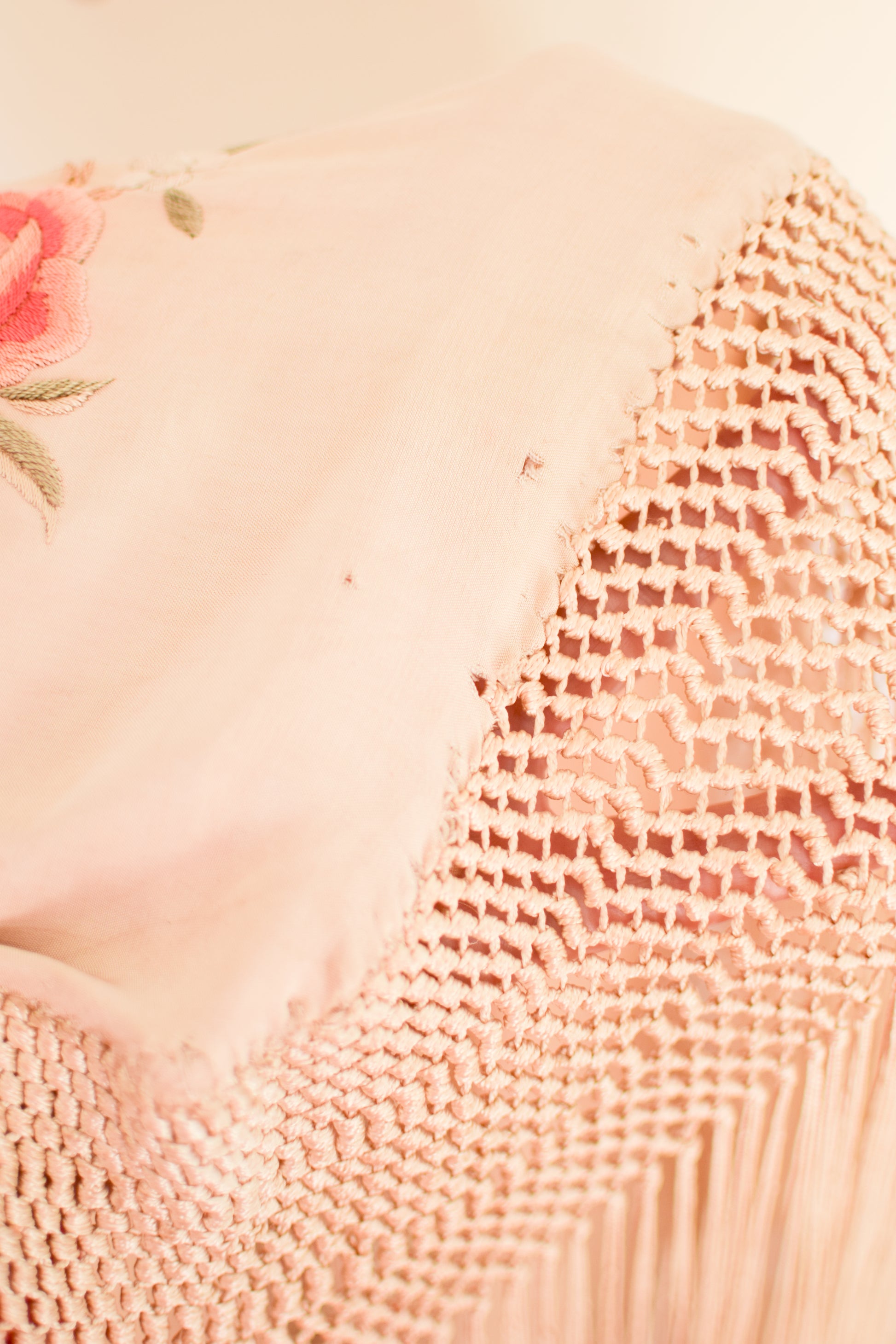 good condition. silk is soft, not brittle and the tassels hang nicely with few knots/kinks. on inspection, there is general light dye transfer from the dark pink flowers onto areas of the silk ground, this can be seen by zooming on photos. there are some scattered pinholes, and one larger pinky-nail sized hole towards the center of the silk. there are some areas of stress to the silk near edges, where tasseling is attached. see images. even with these flaws accounted for, I find the piece to be a striking and lovely example of this style and very wearable for a special occasion. priced with condition in mind. recommend to store folded flat, with protective tissue paper to help prevent further strain to silk.