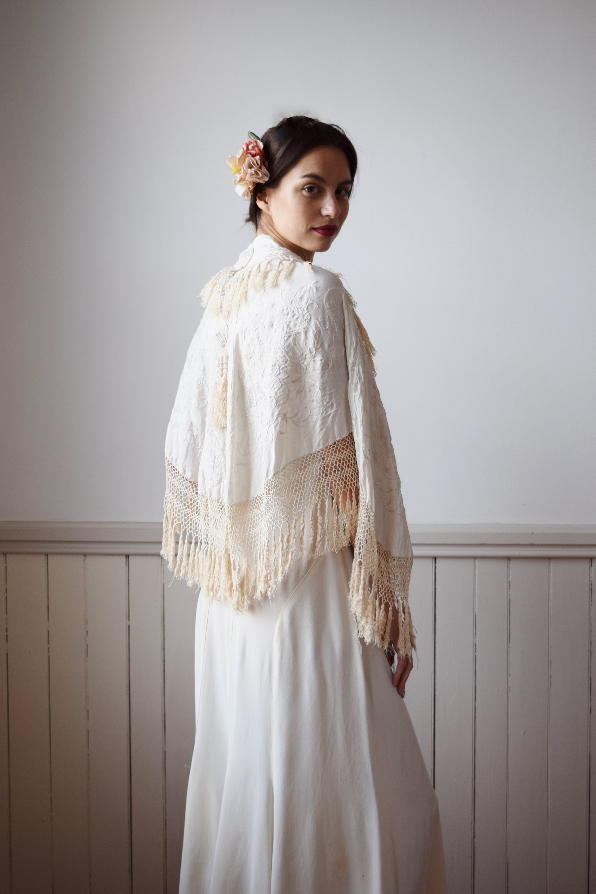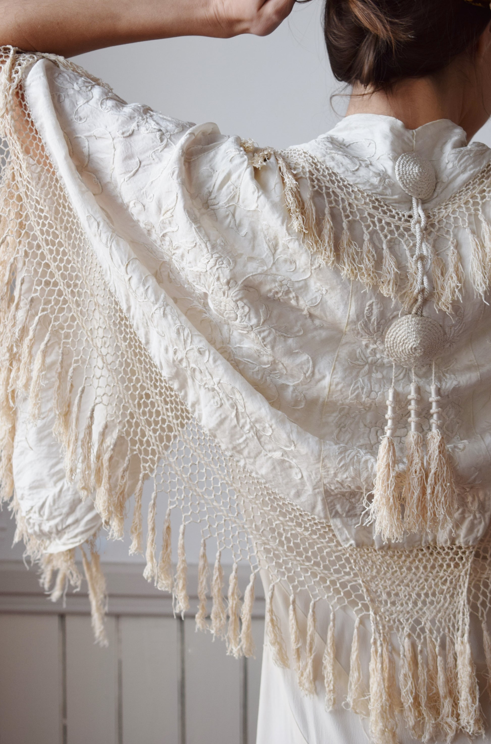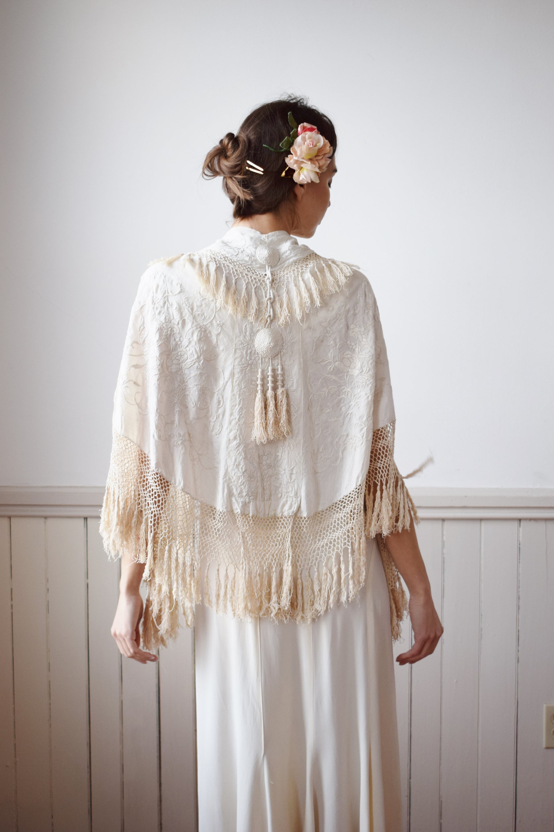 lovely antique white-on-white hand-embroidered silk cape, possibly cut from a piano shawl, with all-around tassels, and tassel collar, and rope/cord detailing on the back and and at neck to tie closed.