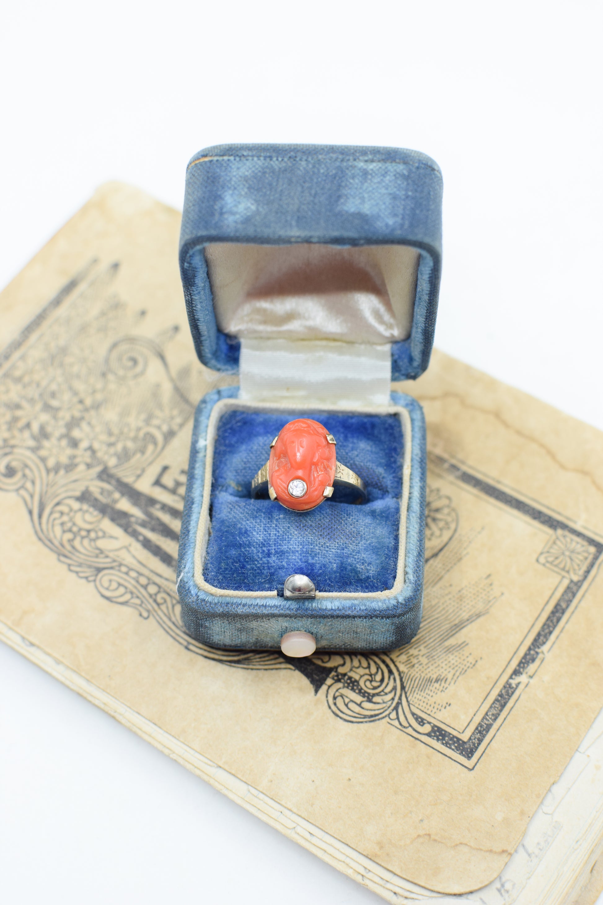 Antique Victorian 14kt Gold, Coral and Diamond Cameo Ring | US 7 1/4