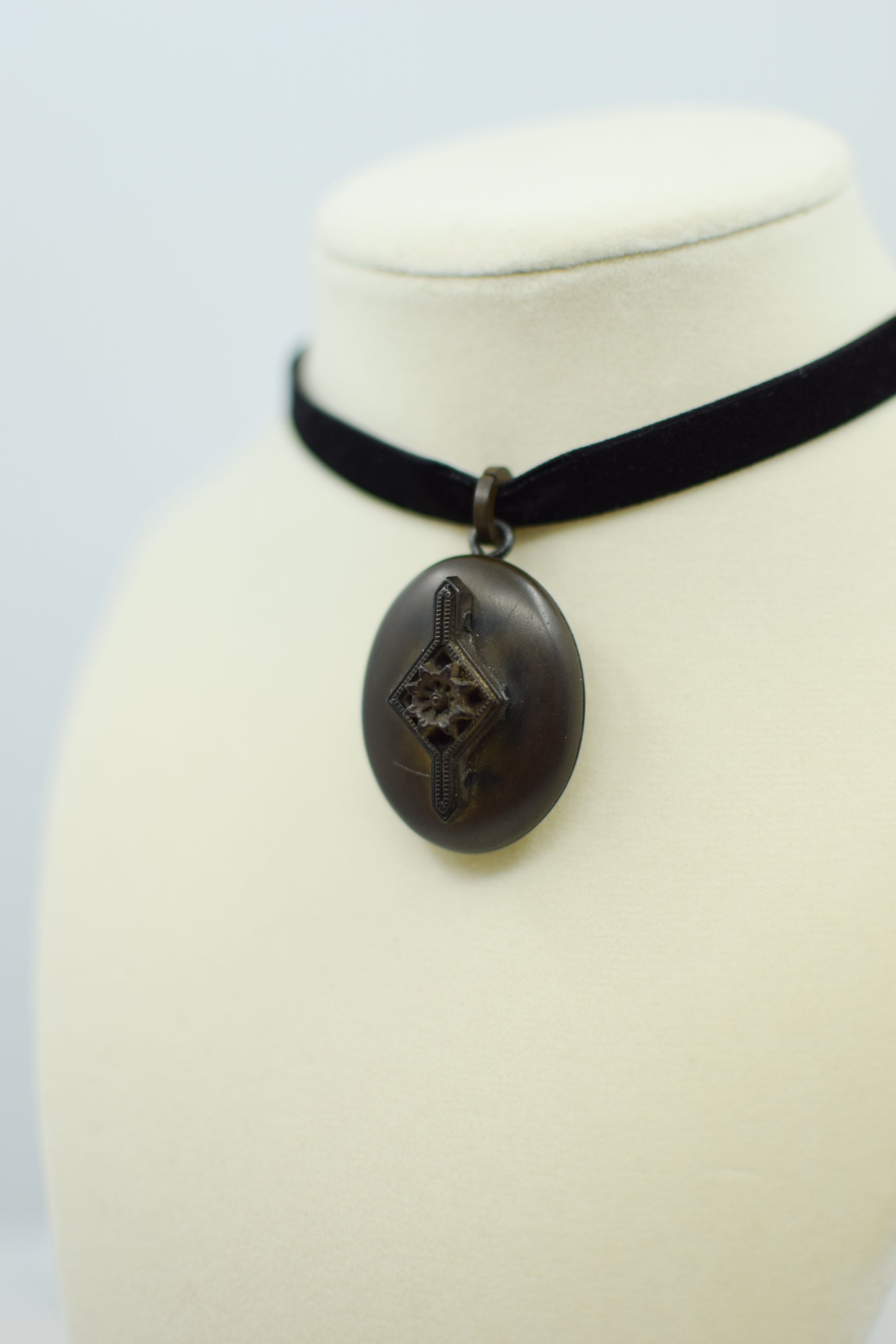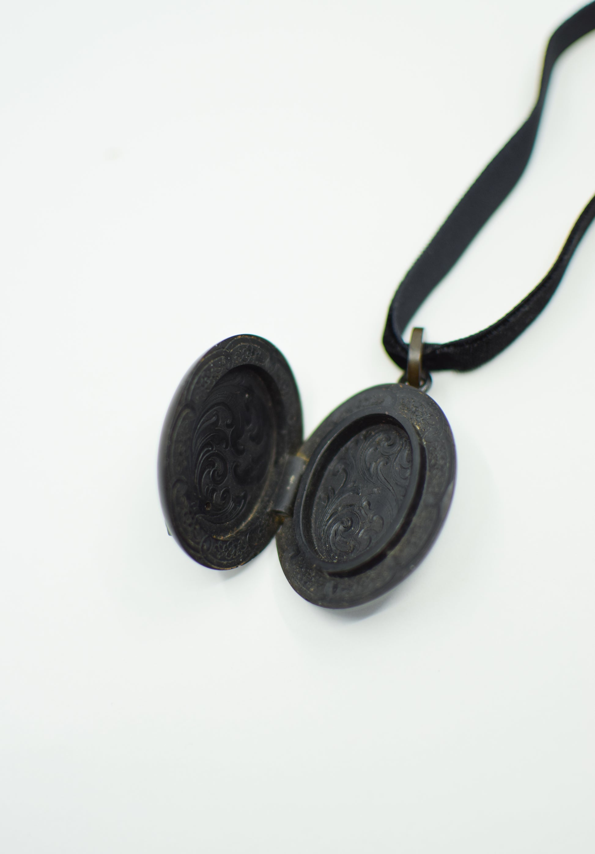 molded vulcanite locket with smooth matte finished exterior and decorative floral applique in high relief. the interior compartments with highly detailed carved floral and foliate accents. with original vulcanite bale. offered with a length of vintage black velvet ribbon, or add to your own chain!