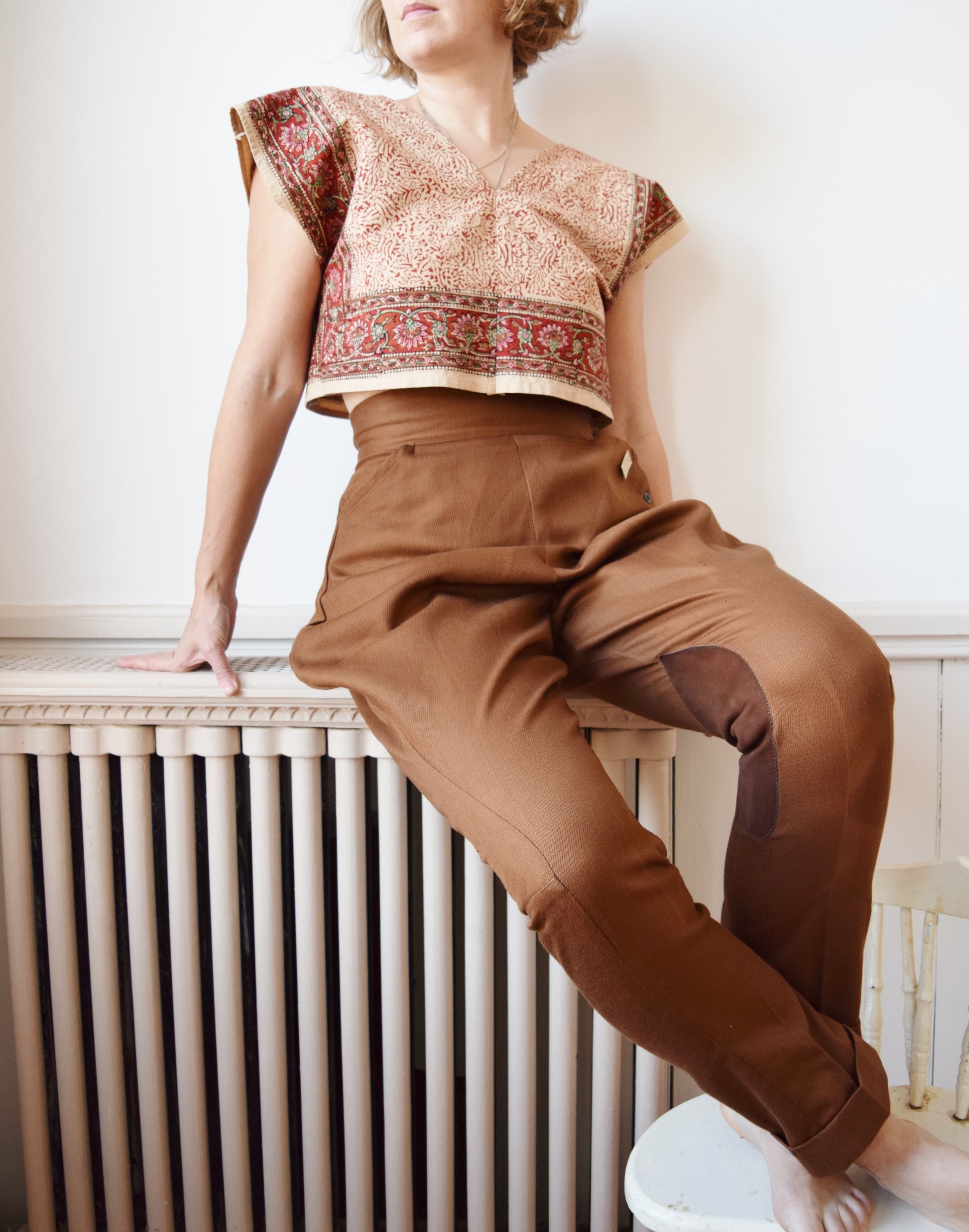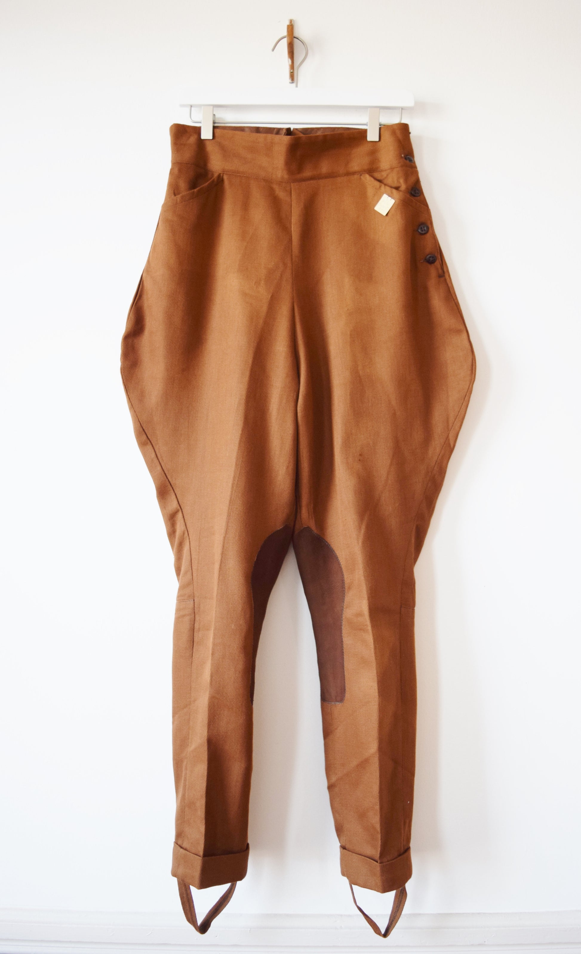 genuine riding pants in a hearty brown worsted cotton with suede knee patches, removeable foot stirrups, and hip pockets.