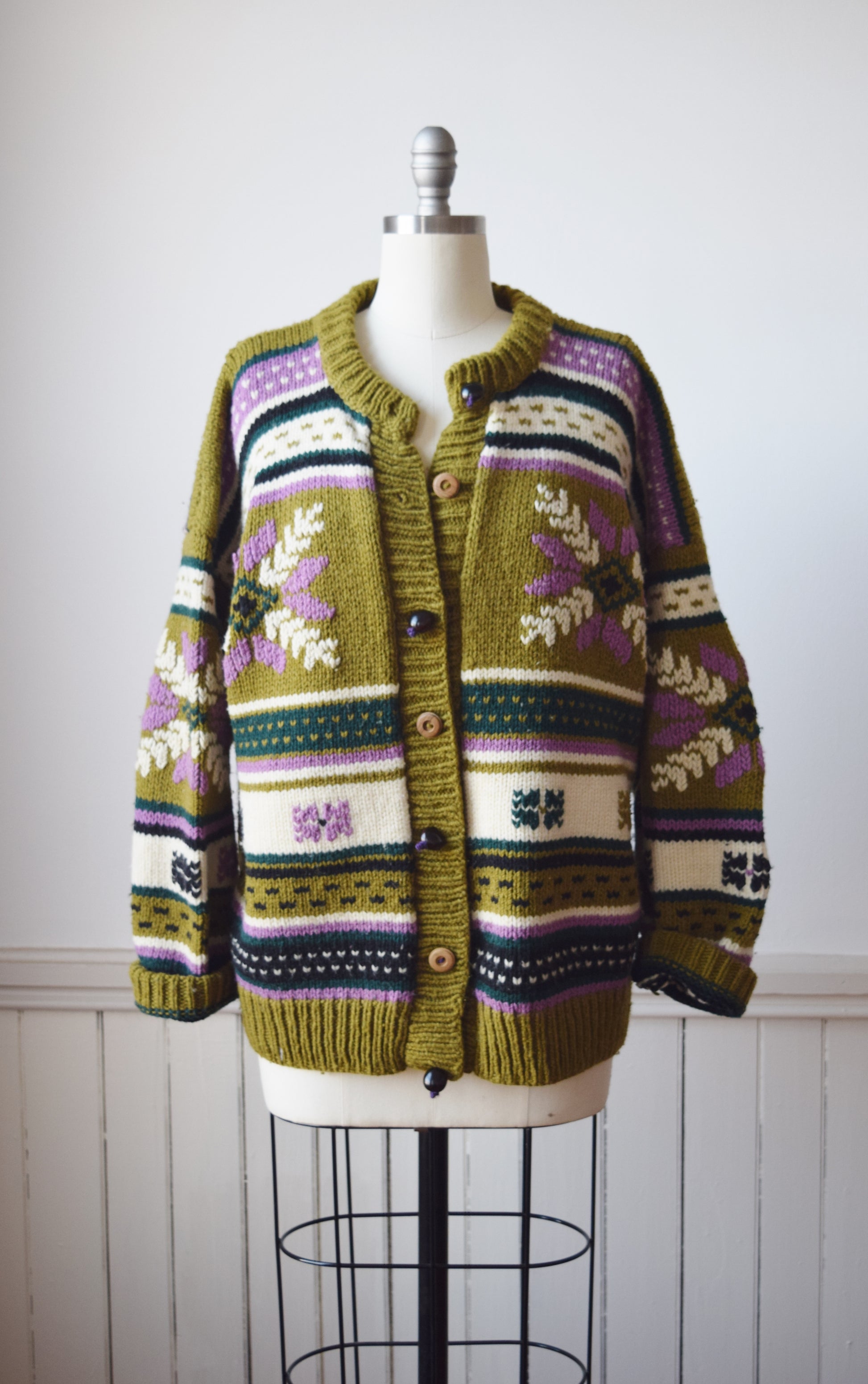 open, super boxy cut in wool or wool blend of olive/chartreuse, cream, purple and greens, with alternating wooden and kukui nut buttons.