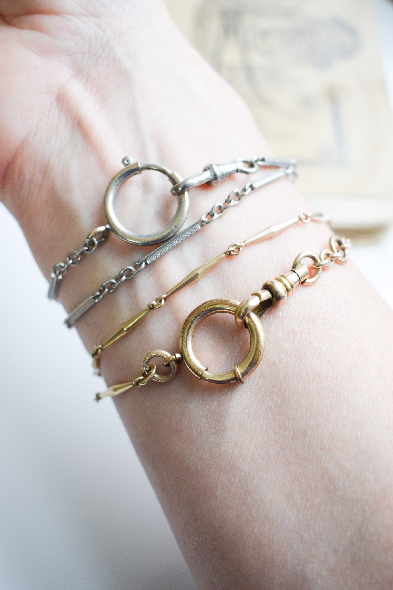 pretty gold-fill bar chain capped with a large spring ring and Albert swivel clasp. hallmarked on one ring, but hard to make out, appears L.J.A. a great stacking piece and/or pairing for favorite charms. works as choker length around neck or doubled around wrist.