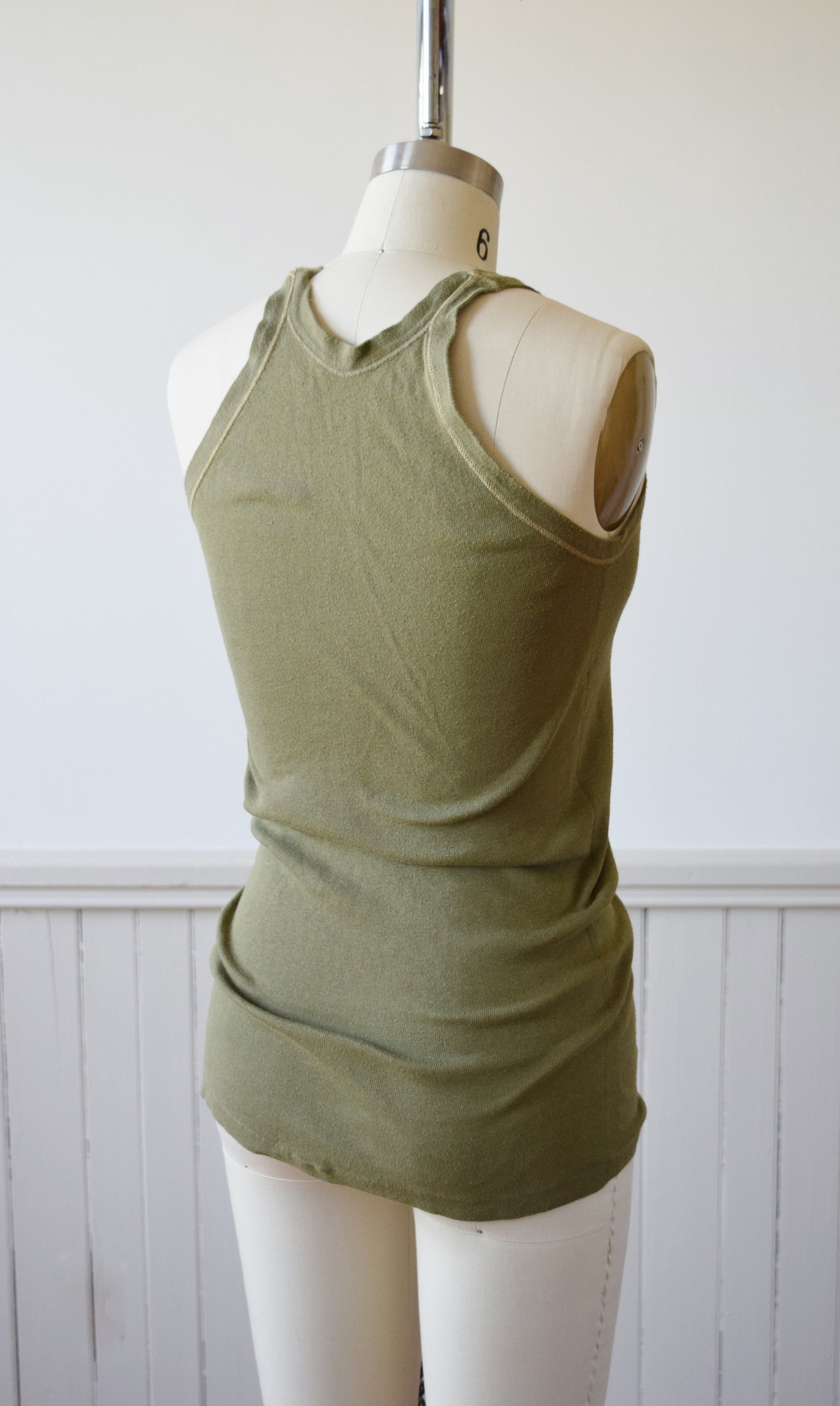 soft and stretchy olive drab rib knit tank. Extra long, cut away armholes.