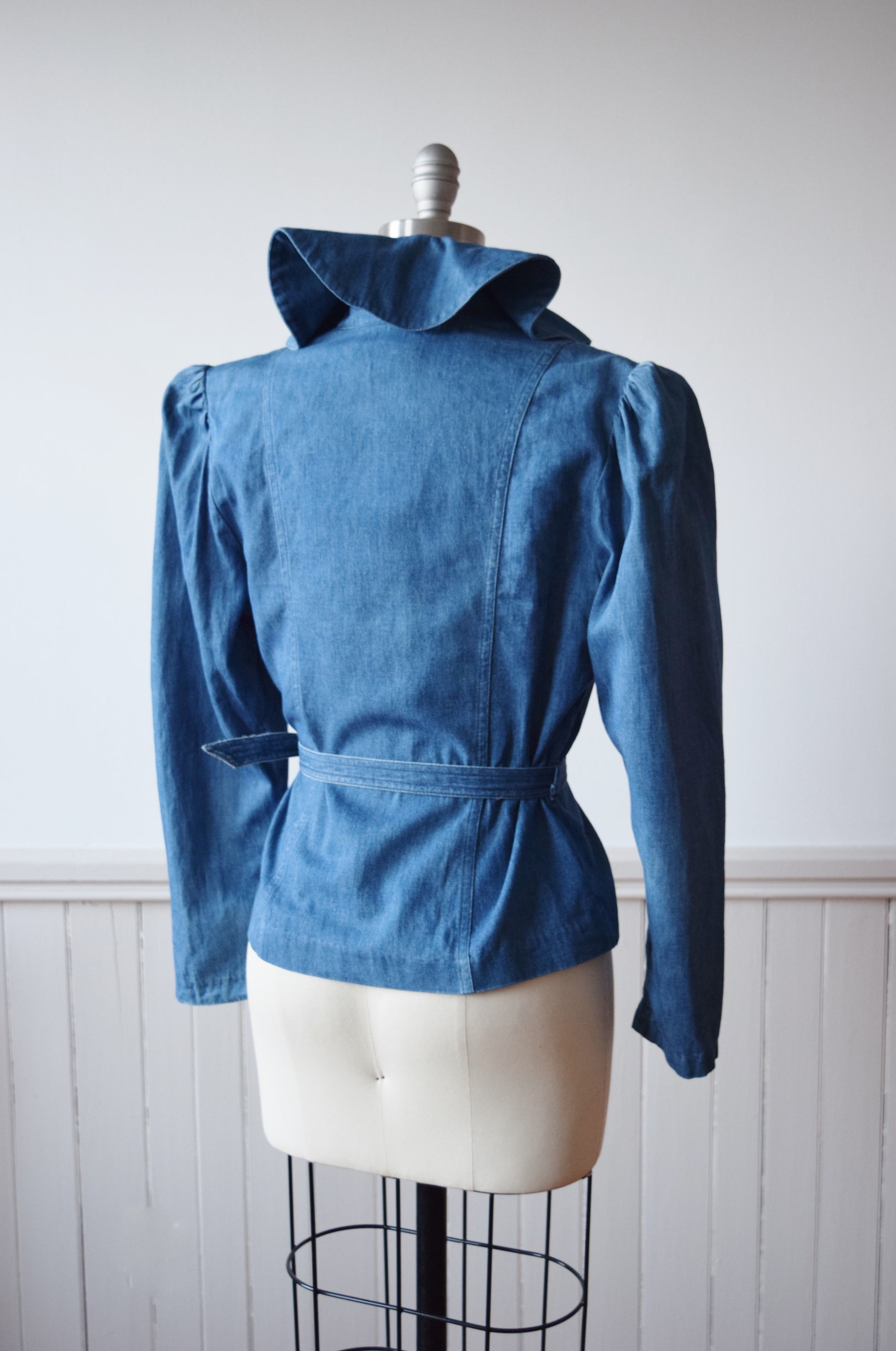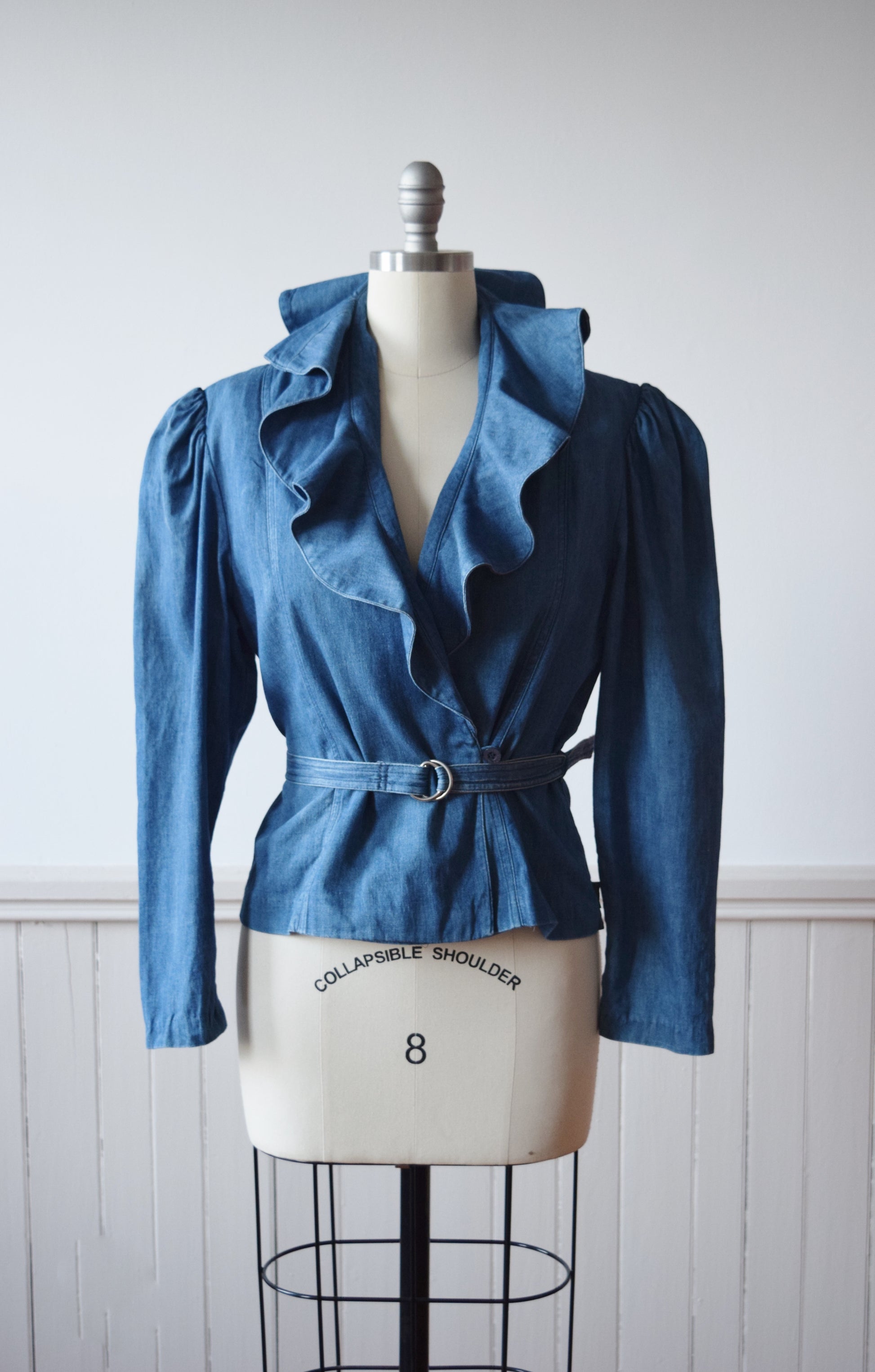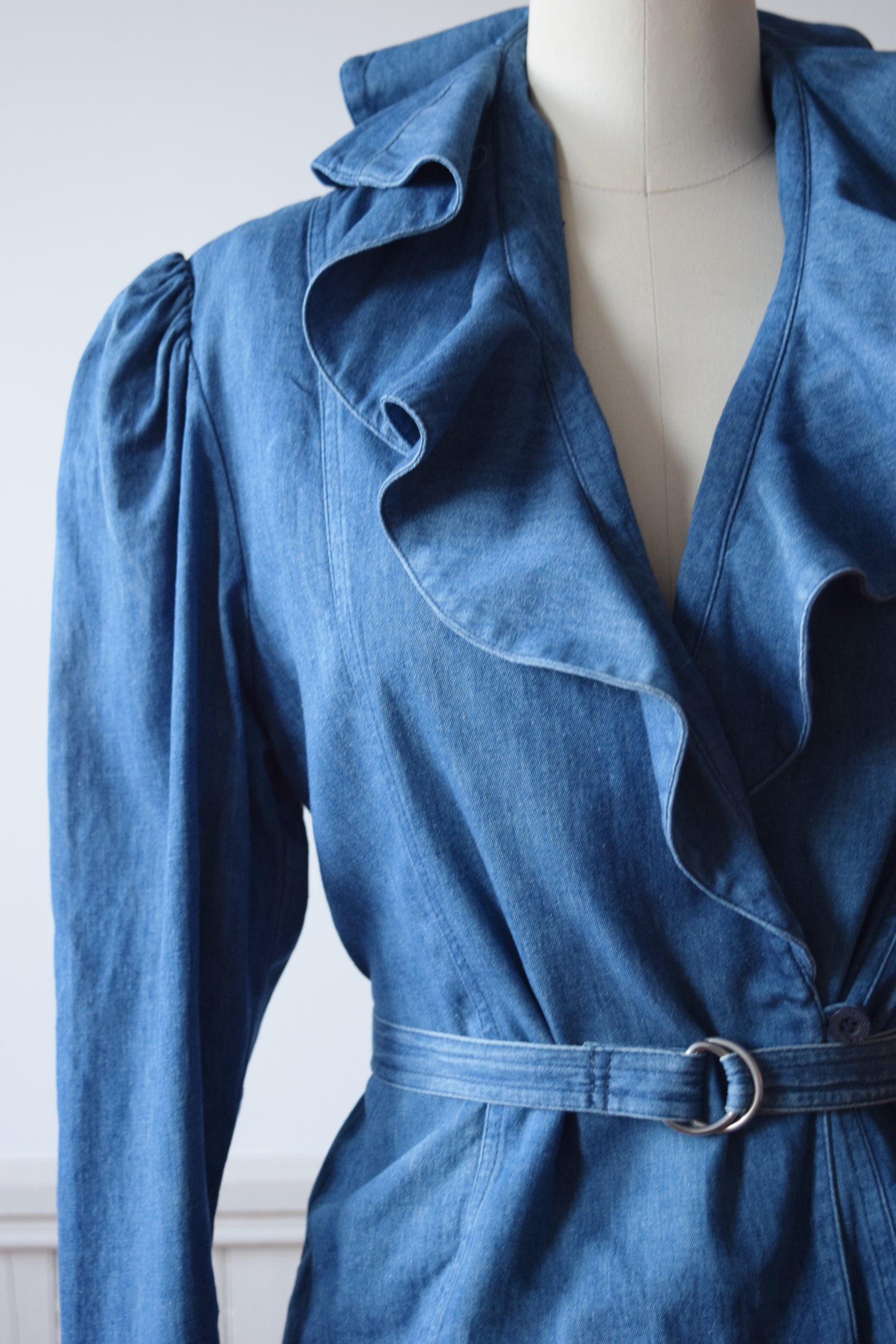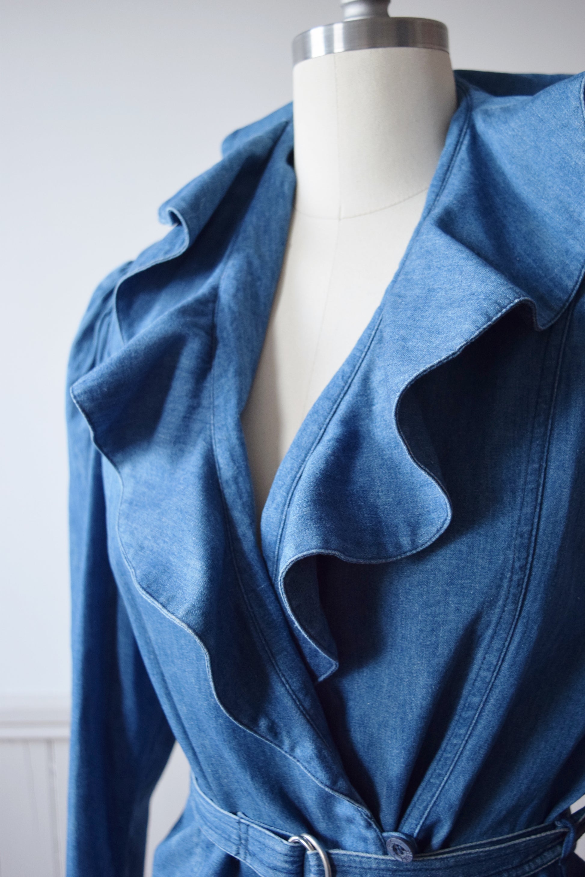 light wieght denim in a wrap style with wide ruffled collar and tie belt. Structural sleeves heavily gathered at the shoulders.