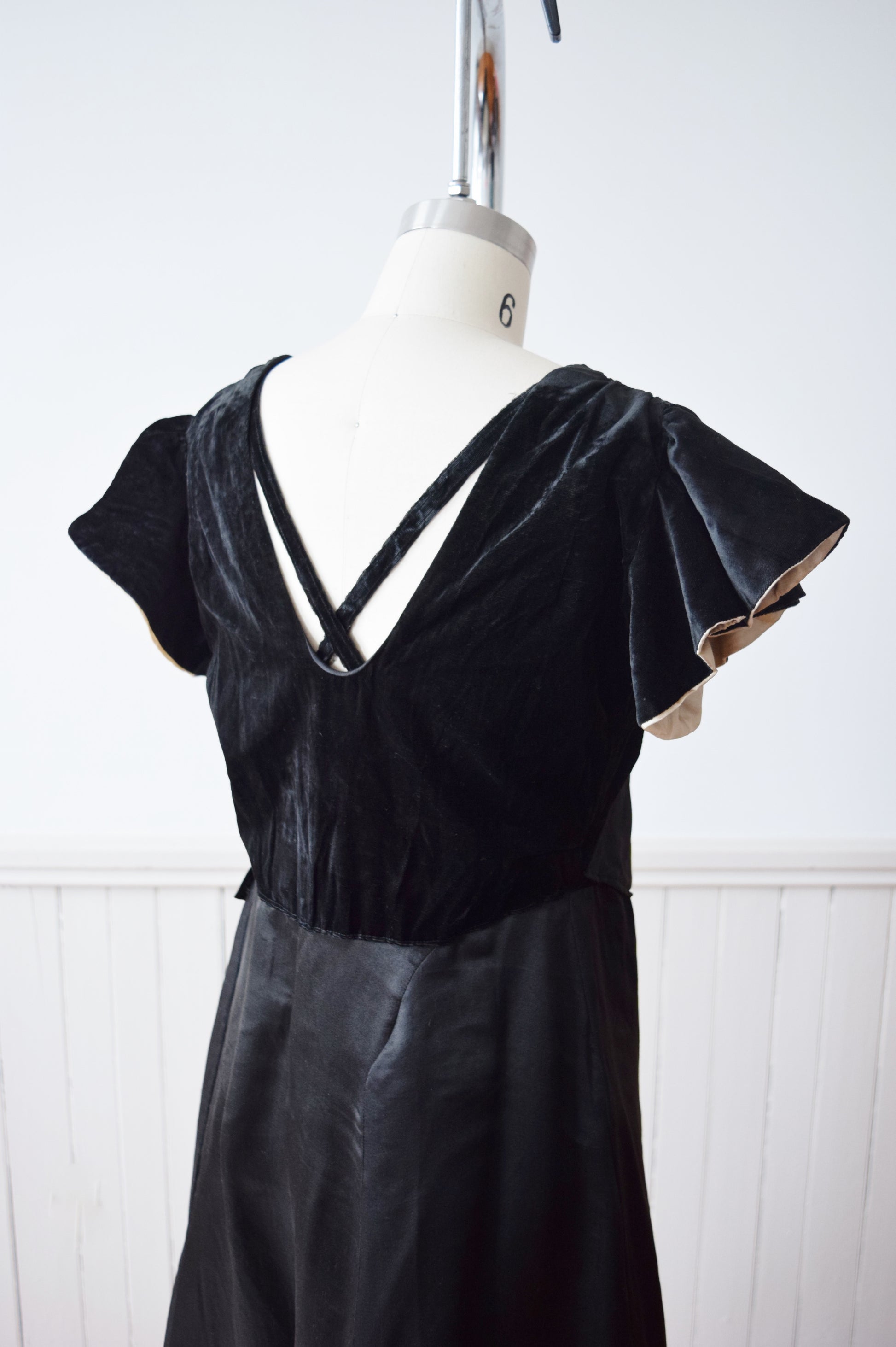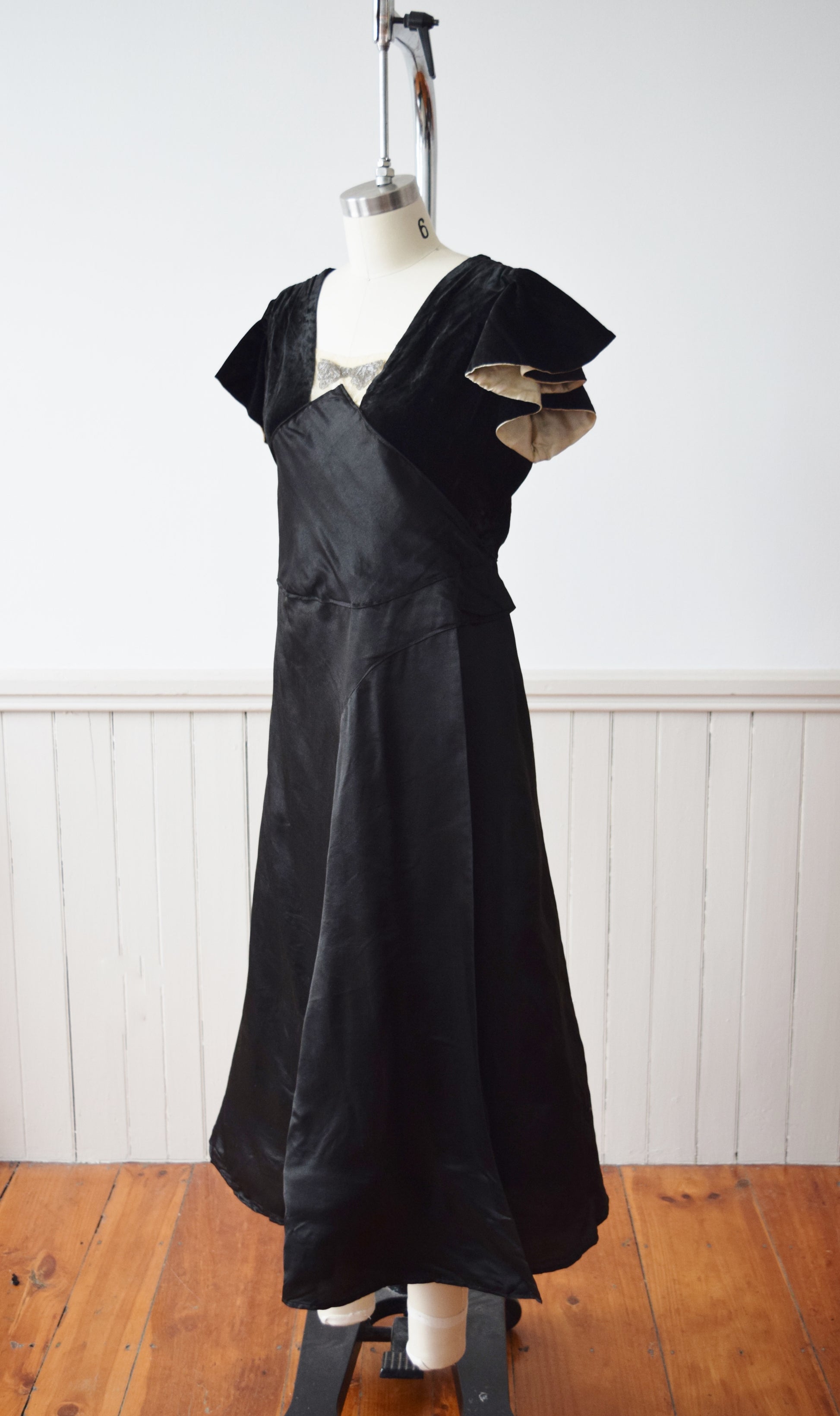 Silk velvet bodice with cream satin lined flutter sleeves, deep V back with interesting X strap detail. Lace and bead modesty panel. The silk satin skirt with asymmetrical seaming that creates a very full drape.