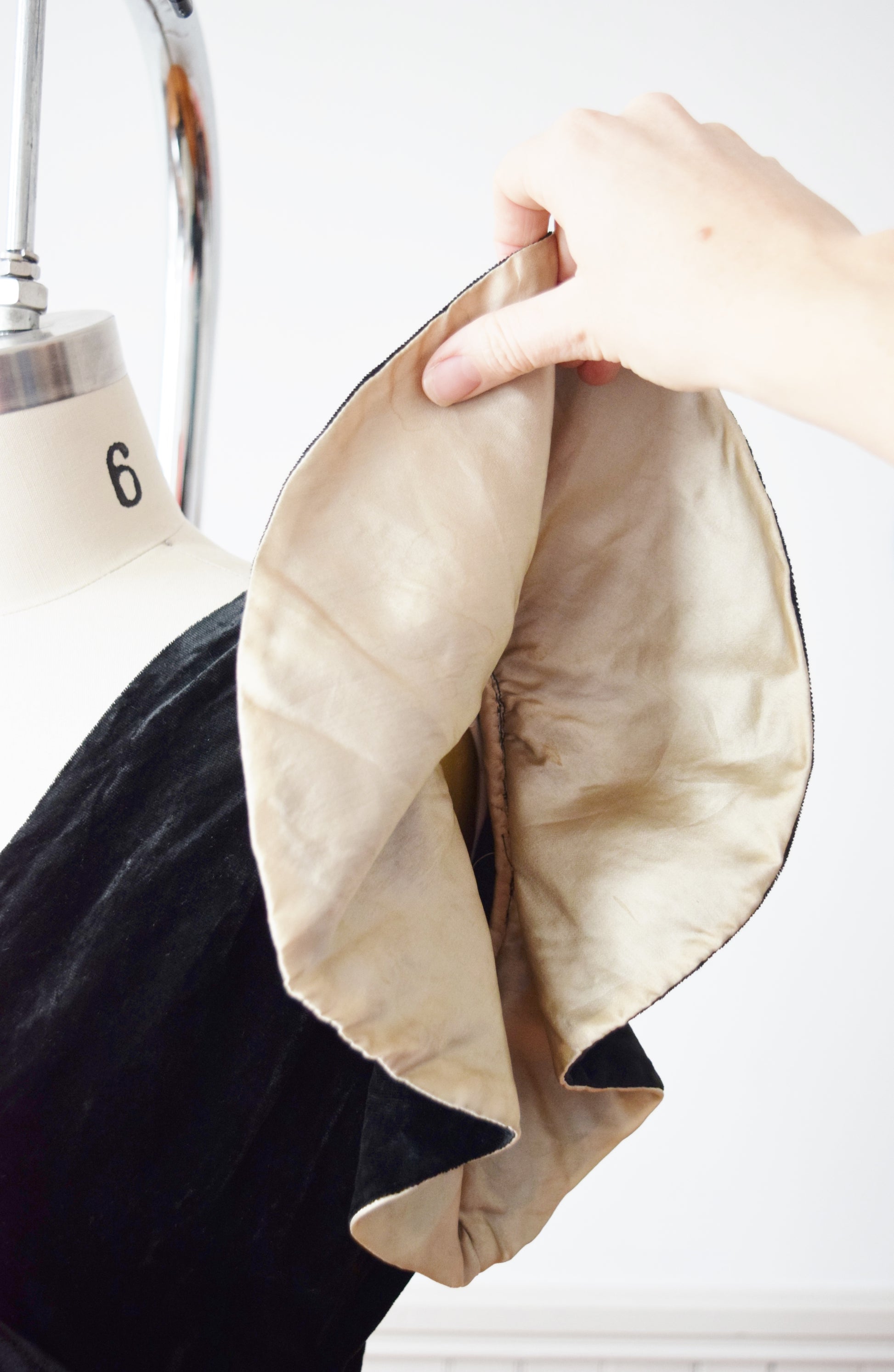 condition: very good for age. sturdy and wearable. Cream satin lining of sleeves exhibits some wear and underarm staining. See image. I have not cleaned this dress, but find it overall clean with no odors. I generally do not recommend washing or dry cleaning dresses of this age. new owner does so at her own risk!