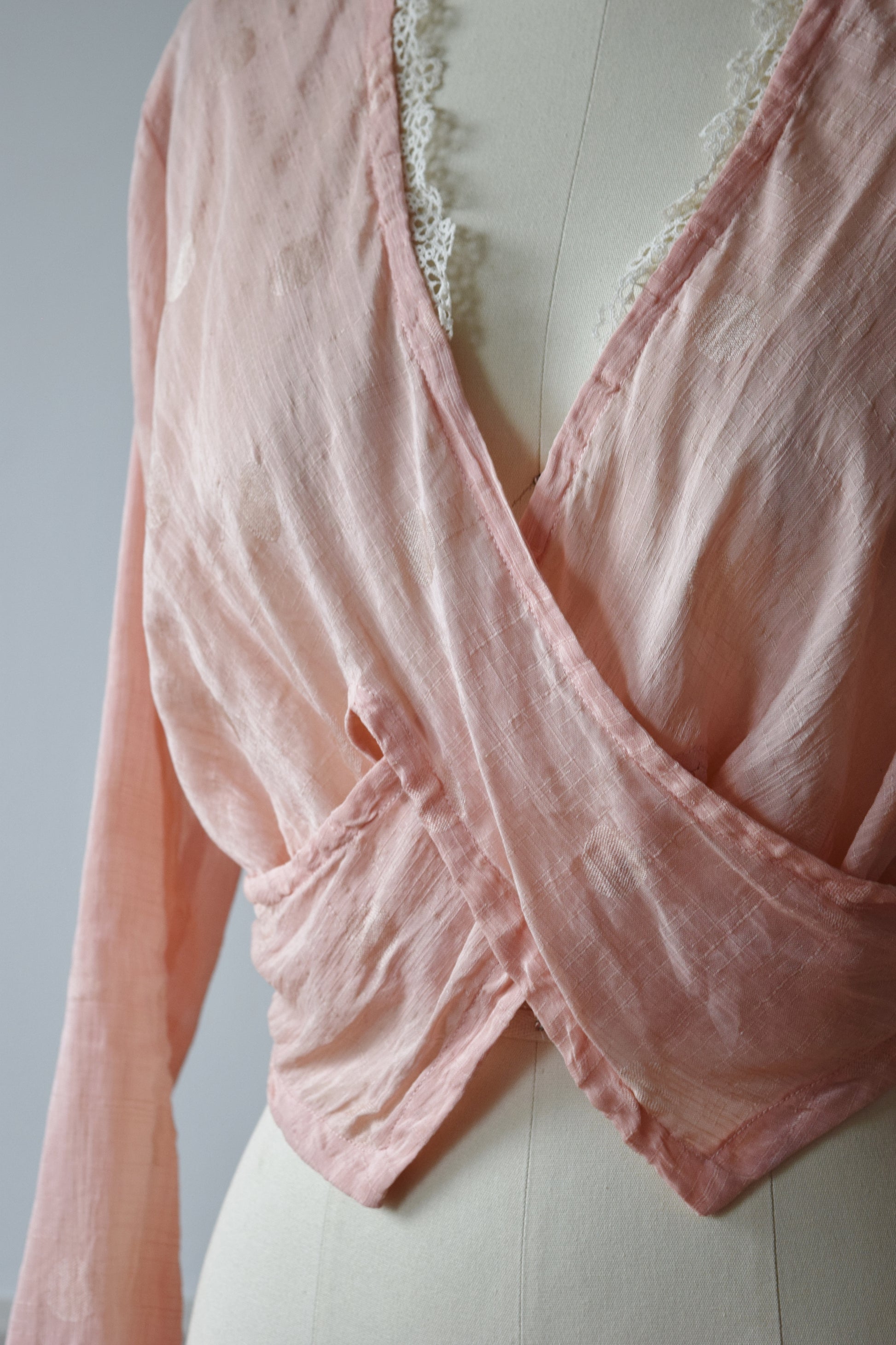 Lovely semi-sheer pink slubbed cotton with jacquard dot design. Interesting pointed ties cross in the front and secure at sides. Cropped cut.