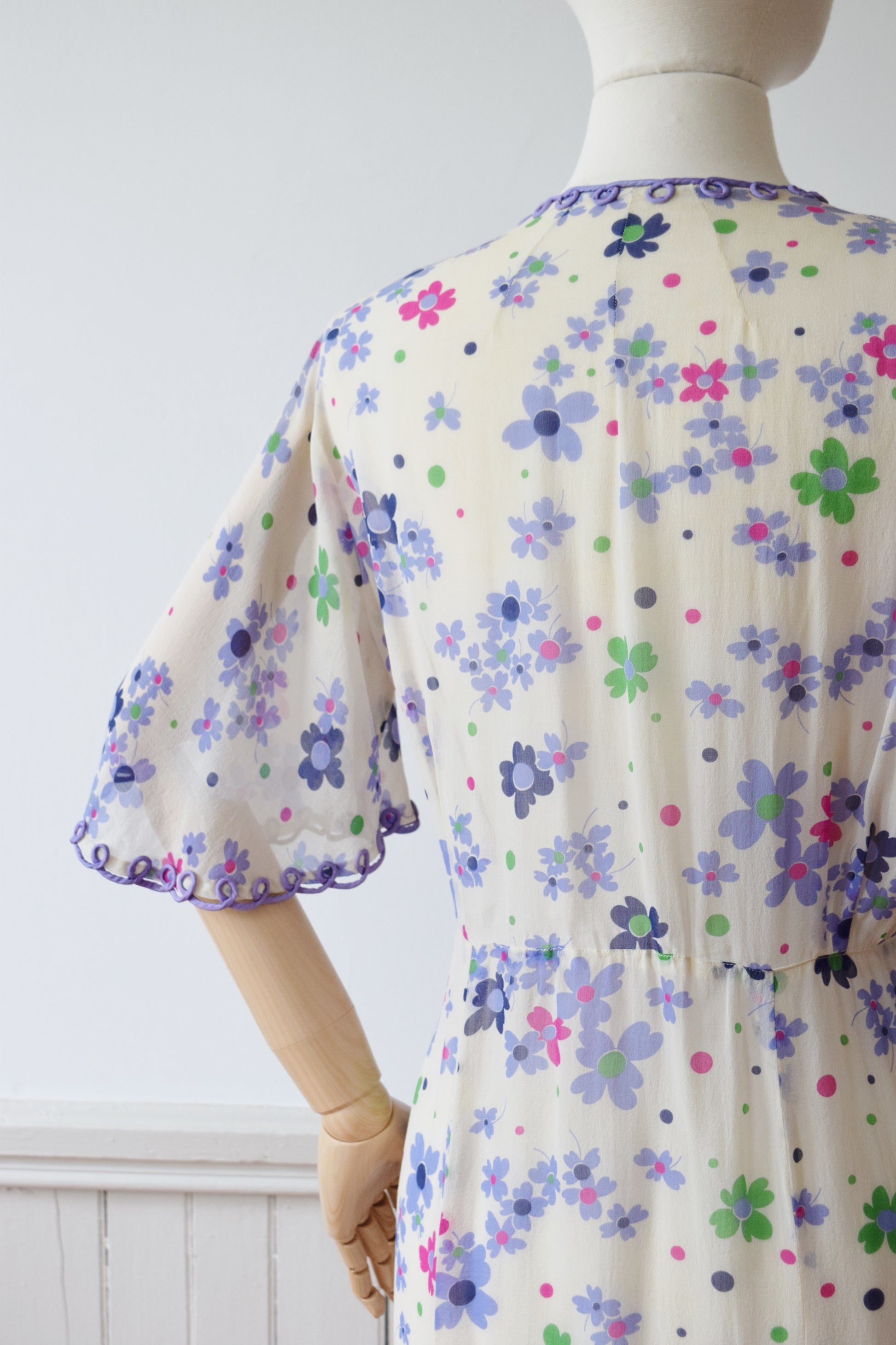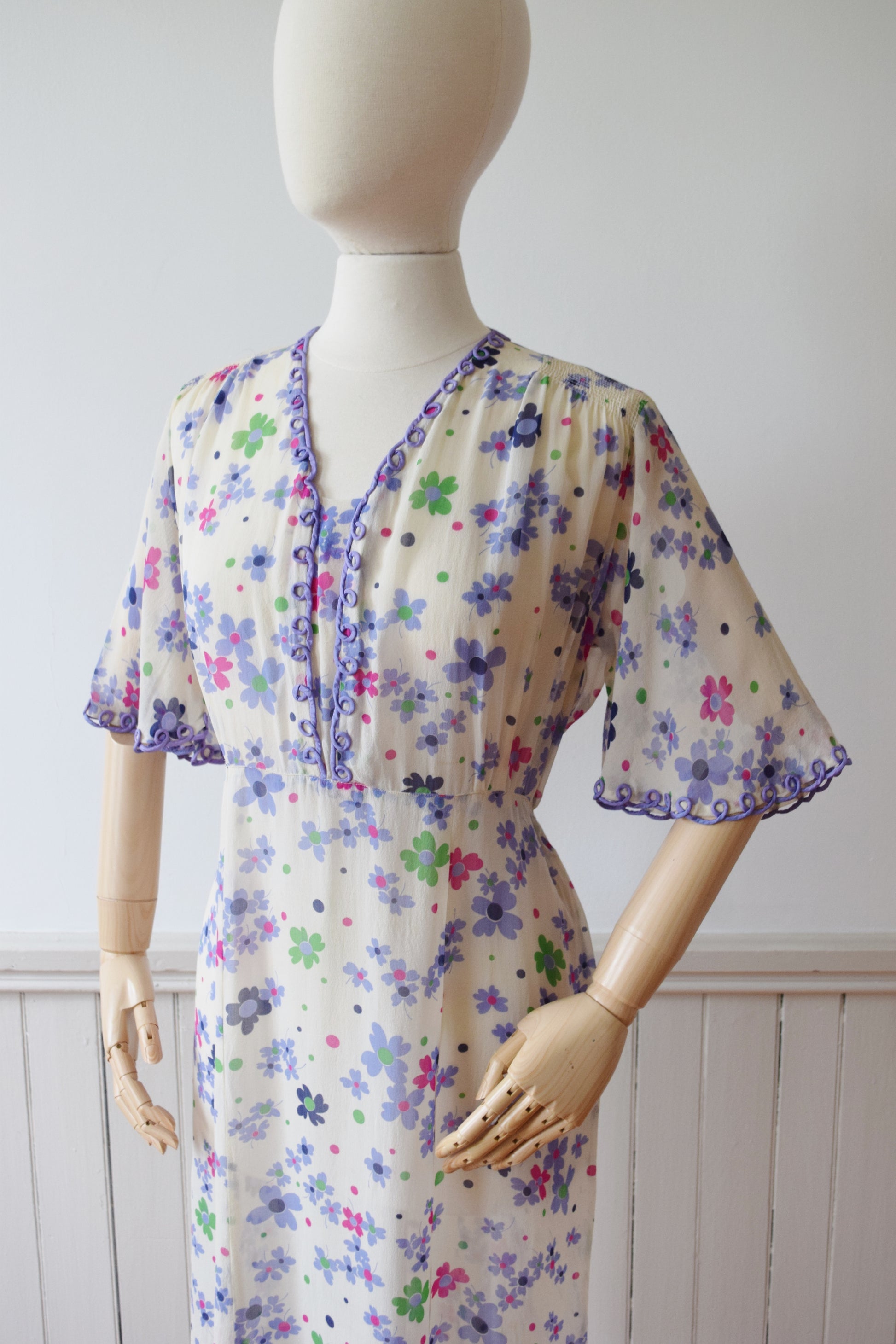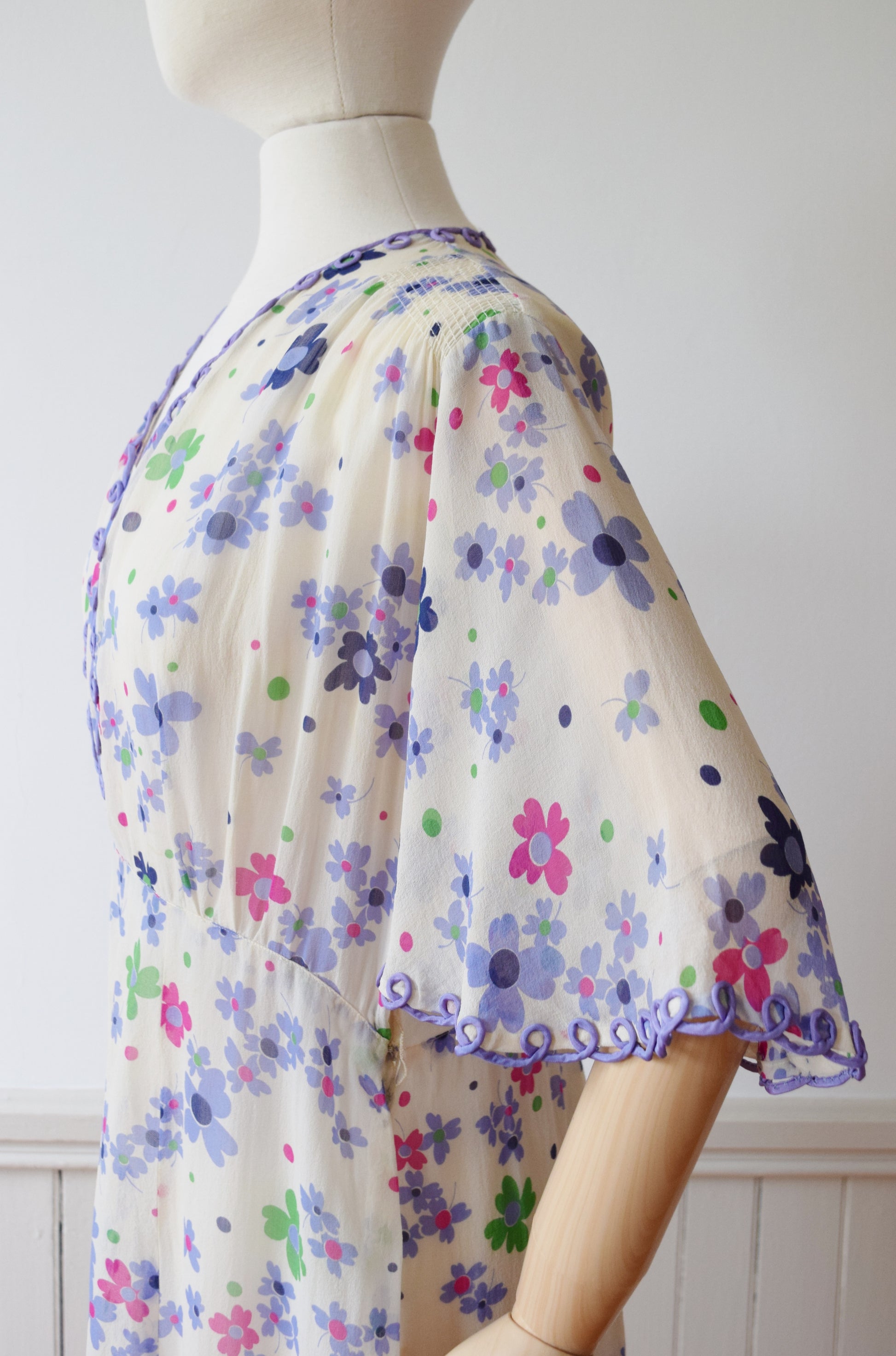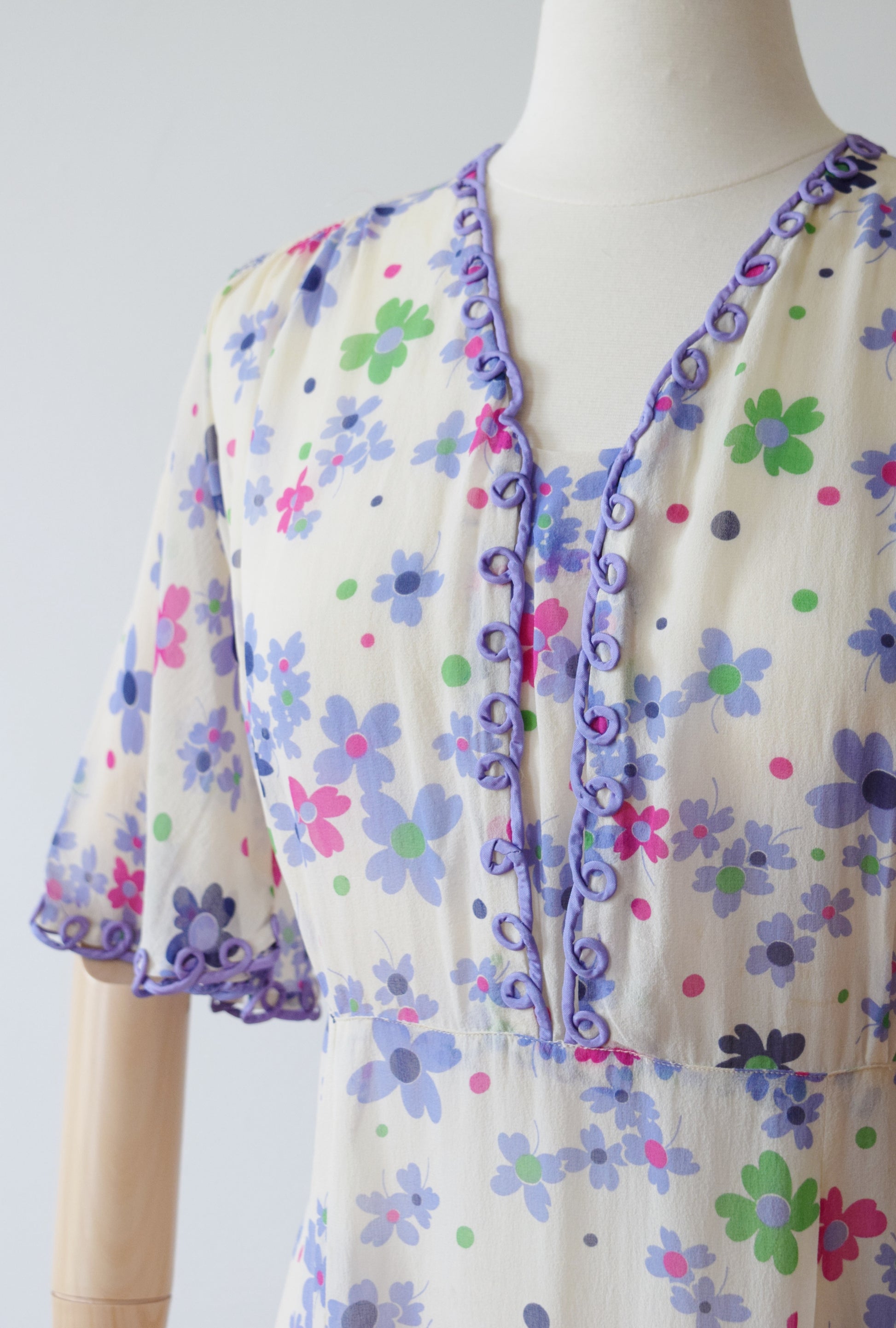 Sheer silk crepe in a pretty purple, green, and pink floral print with looped purple trim athte neckline and flutter sleeves. Shirred detail across the shoulders, 6 paneled skirt.