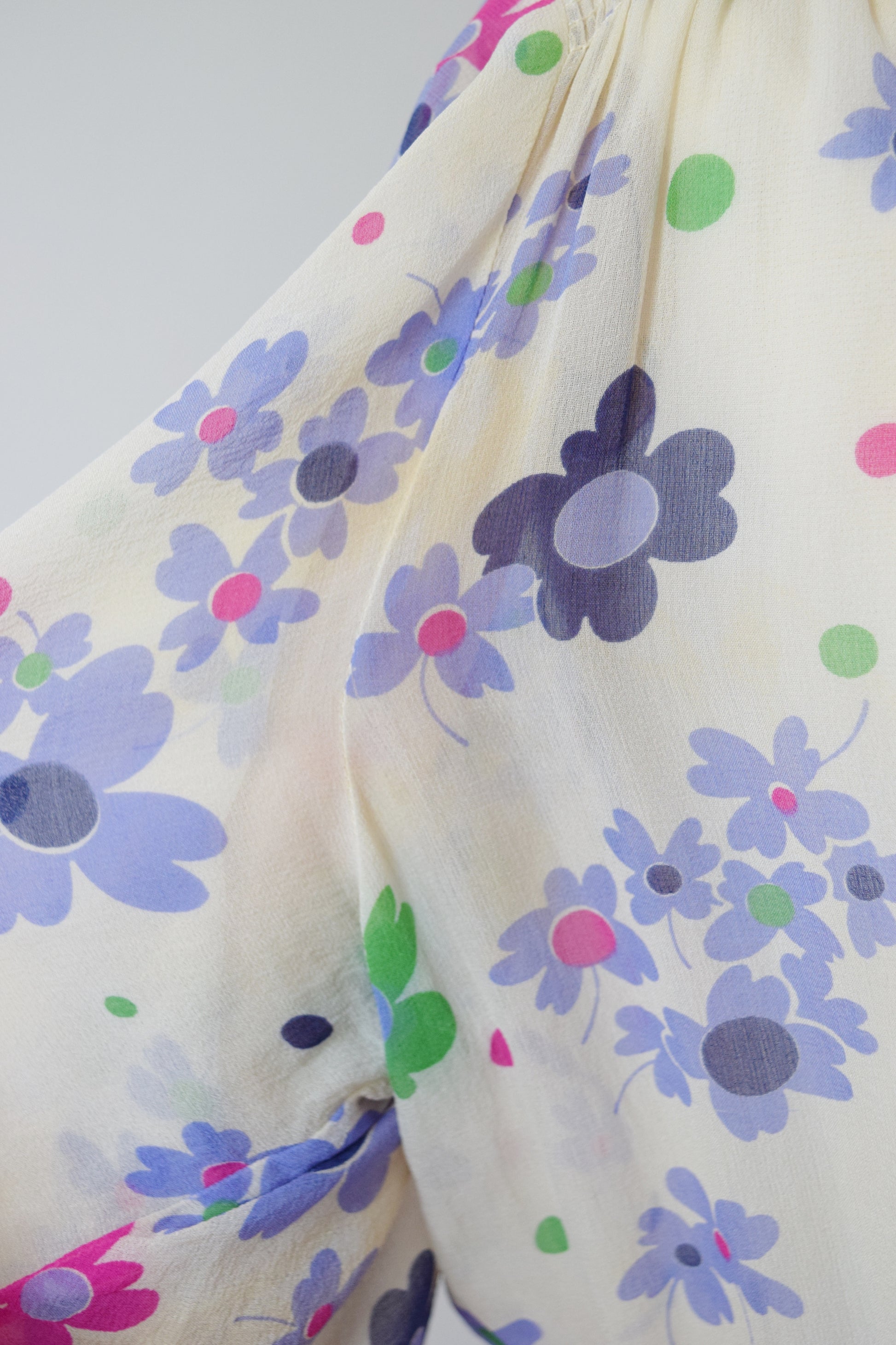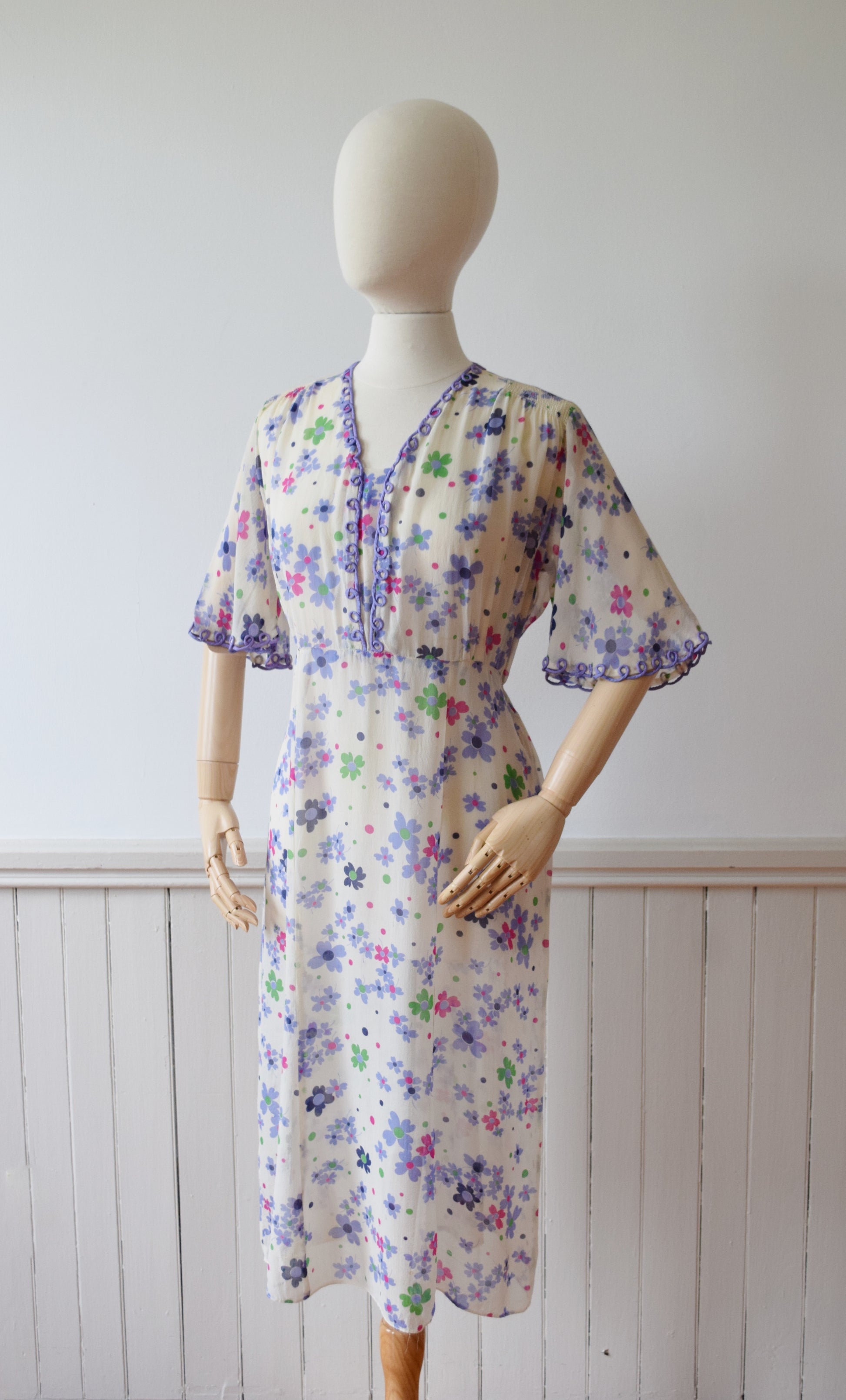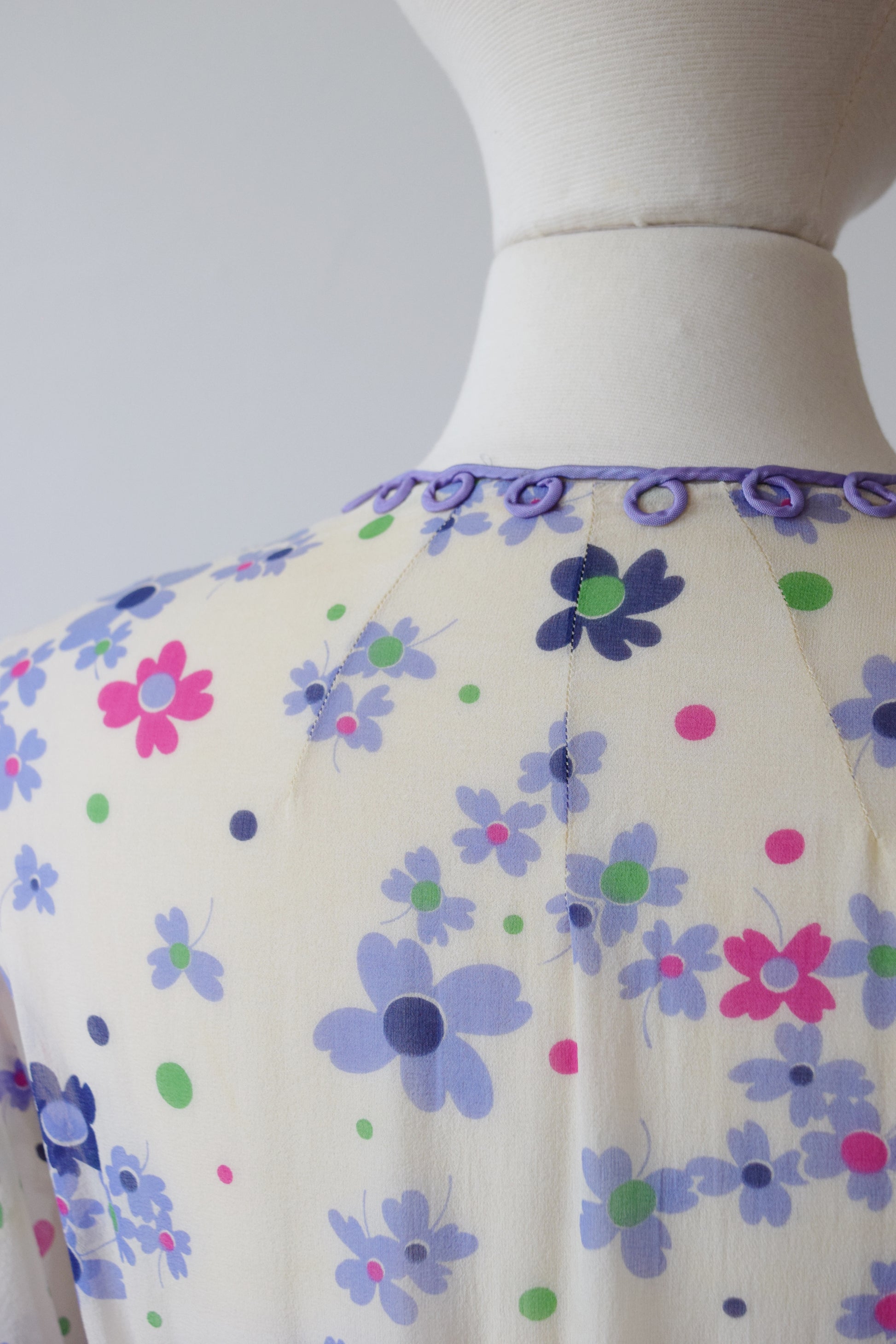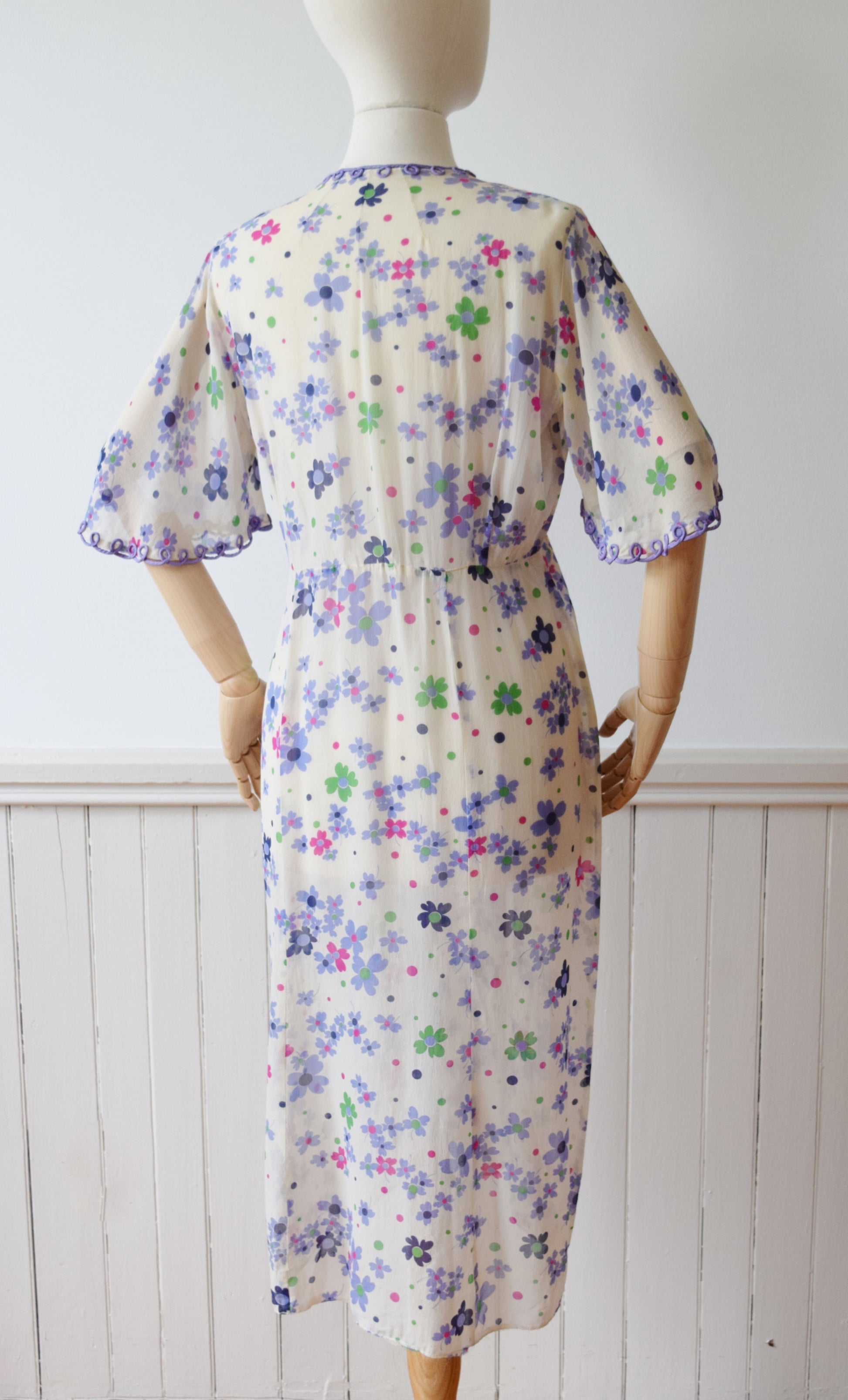 Sheer silk crepe in a pretty purple, green, and pink floral print with looped purple trim athte neckline and flutter sleeves. Shirred detail across the shoulders, 6 paneled skirt.
