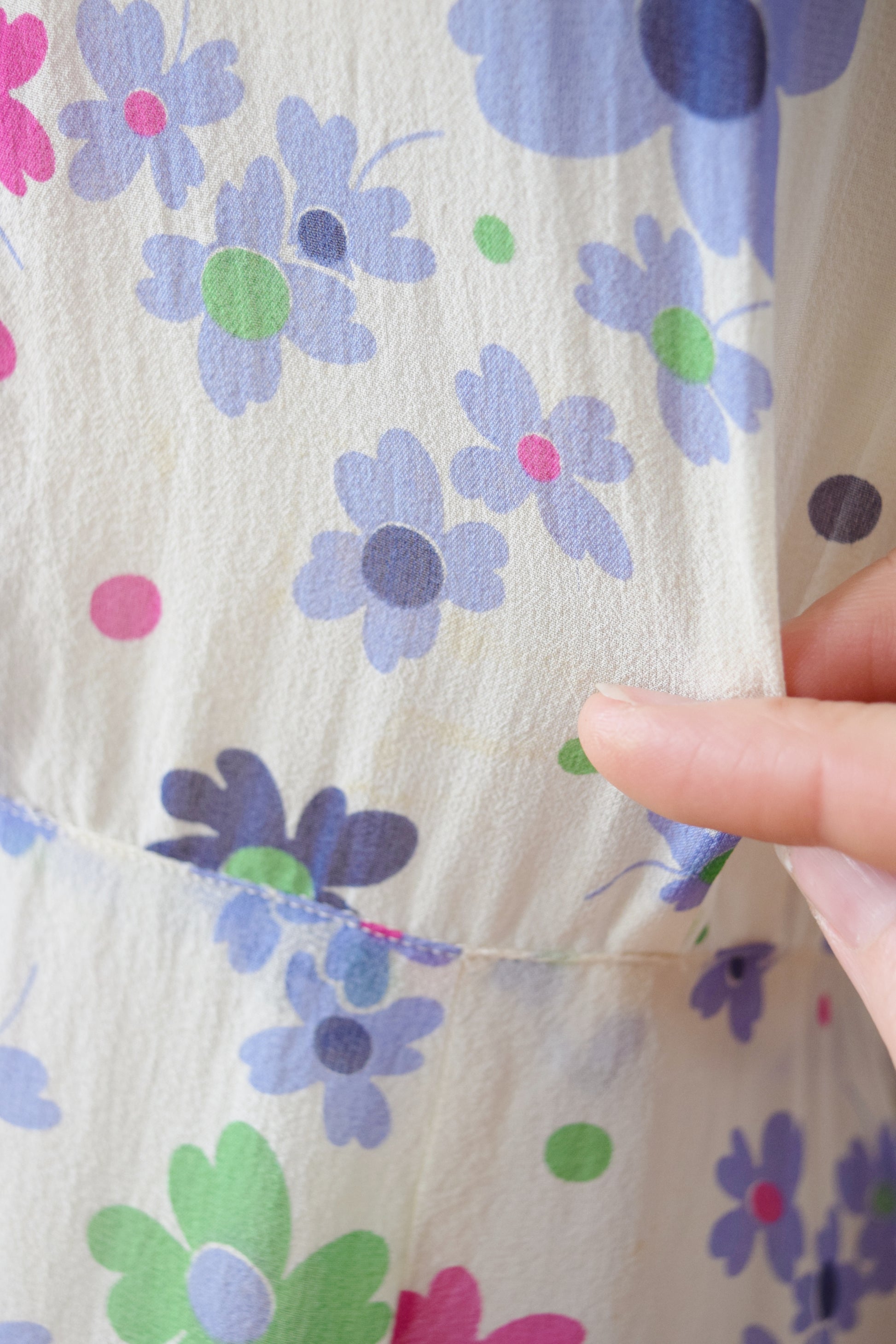 condition: very good. freshly washed and sturdy, print is quite fresh. Some light yellowing around underarms and faint light yellowing across back shoulders/neckline. a few faint spots on bodice.