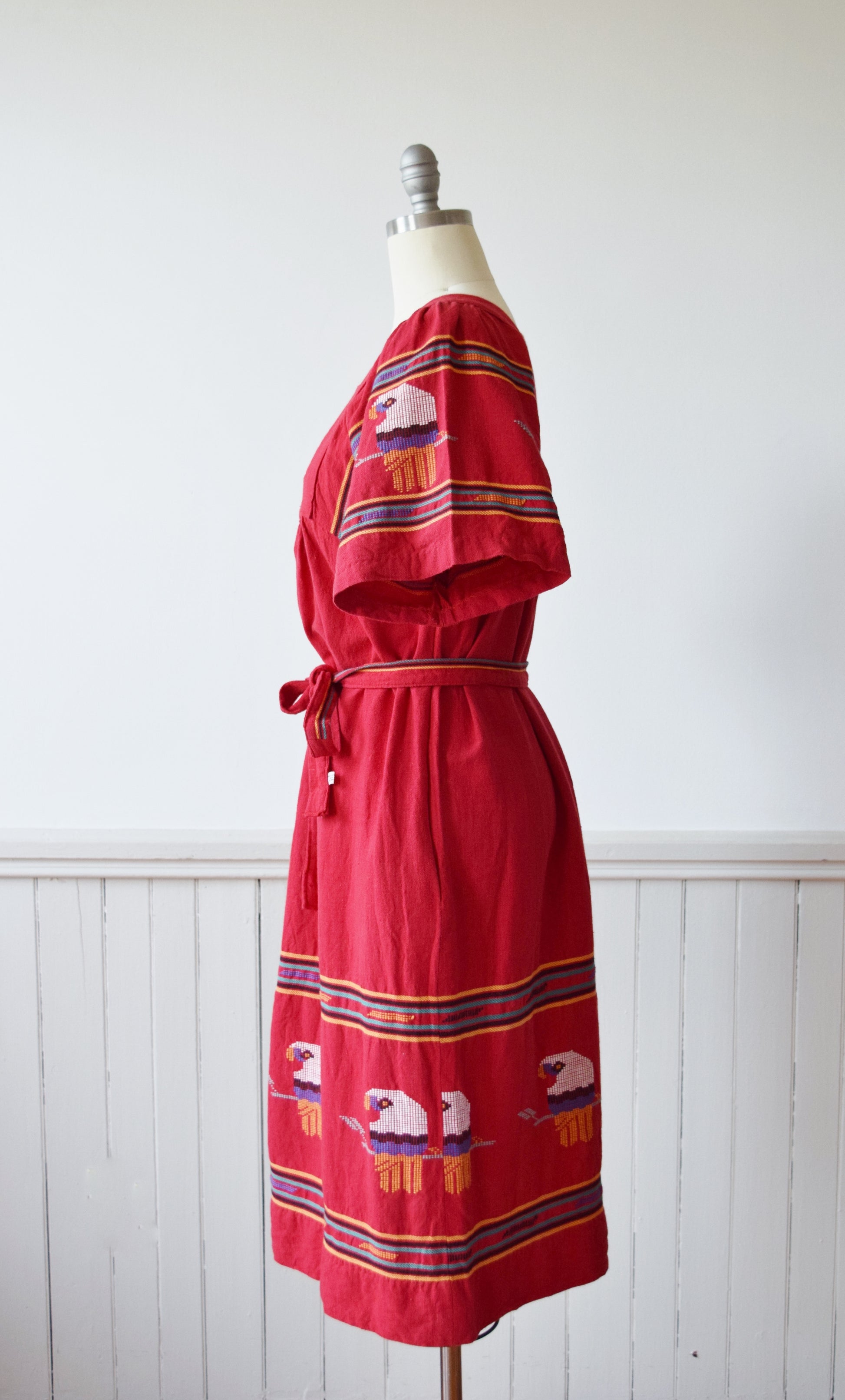 Lightly faded red with parrot motif embroidery. Yoked neckline/bodice, tent cut, wide sleeves. Optional matching belt. Side seam pockets.