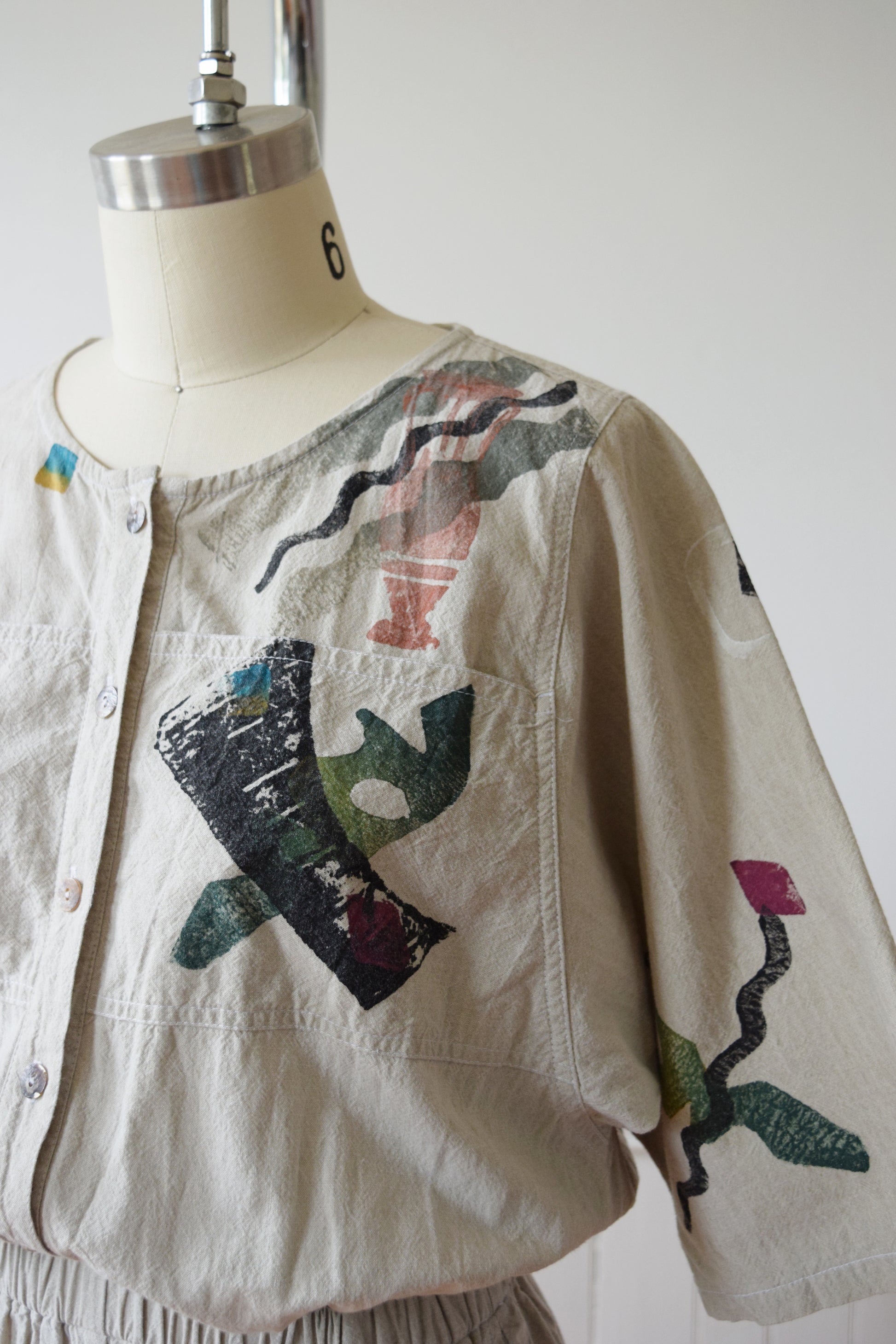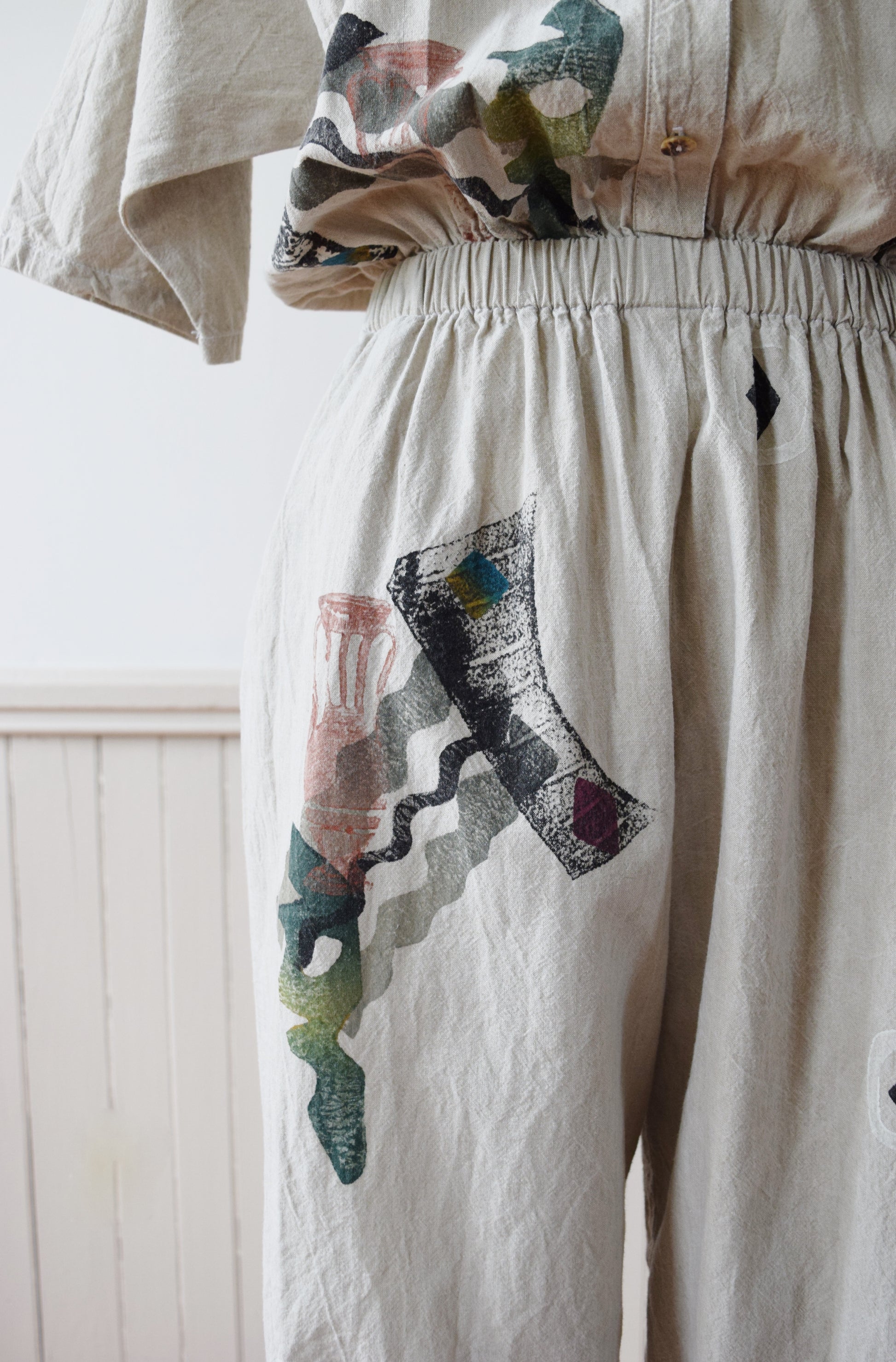 Khaki cotton with all-over hand stamped Greek-influenced abstract designs that include masks, urns, and geometric forms. blouson fit top with relaxed armholes, and breast pockets. the pants heavily gathered at the elastic waist for a relaxed fit through the seat and hips, tapering to hems. With side seam pockets.