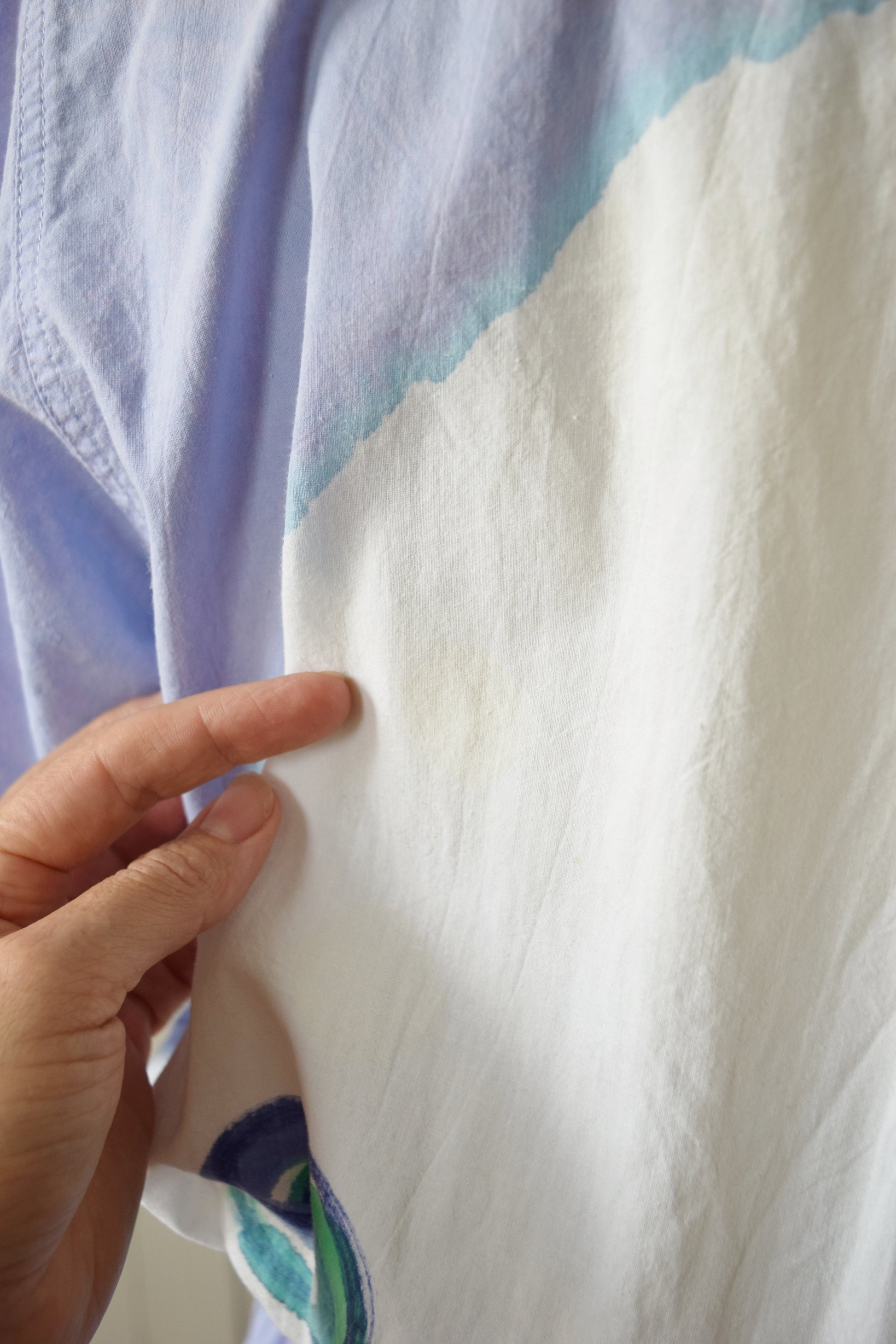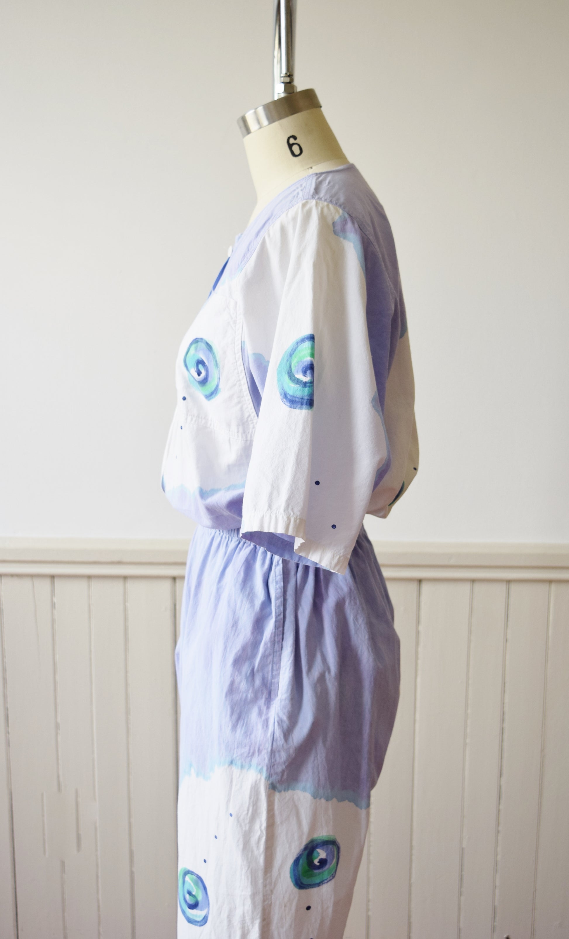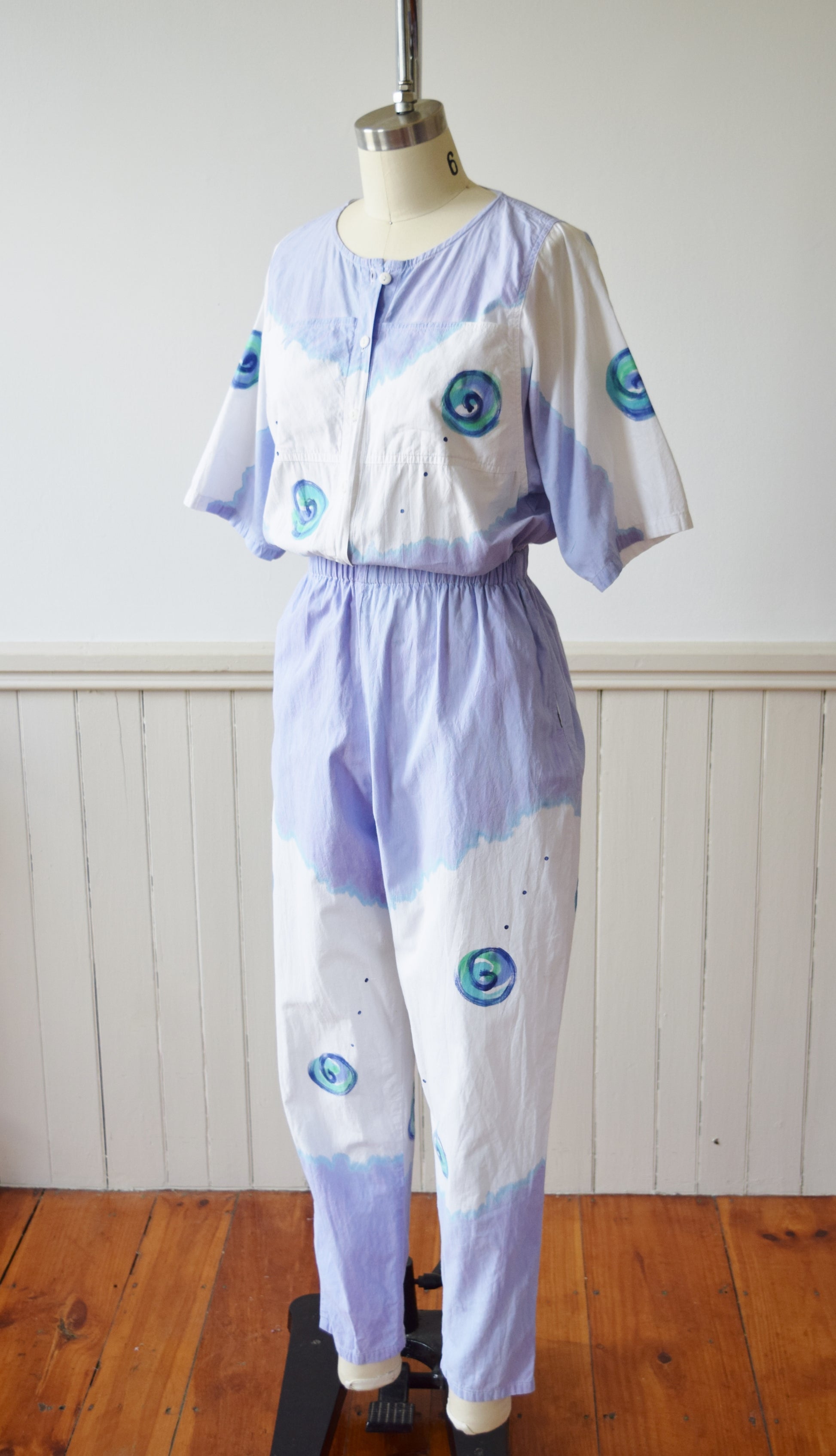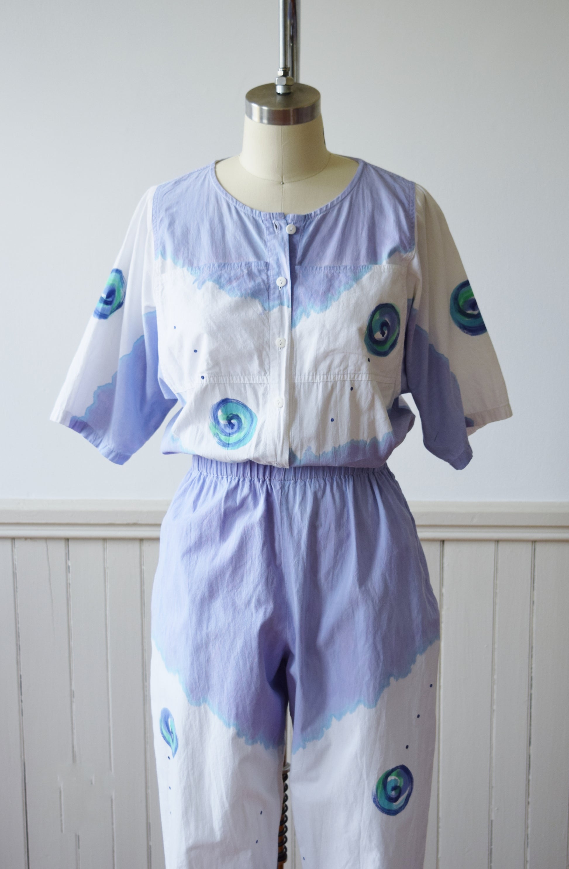 Hand painted design of pools of watercolor-like purple and blue with swirls. Relaxed fit throughout with elastic waist. Breast and side seam pockets.