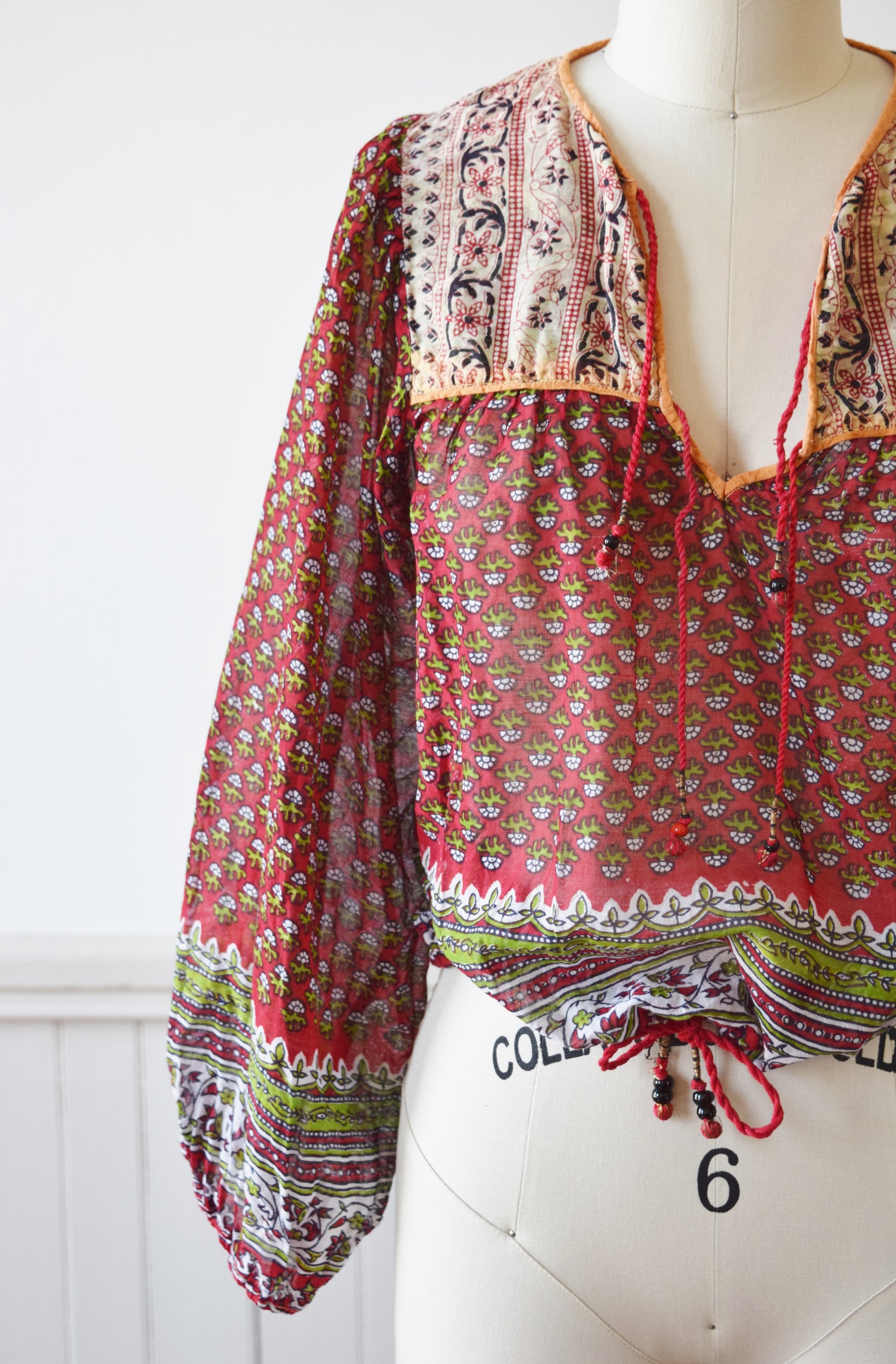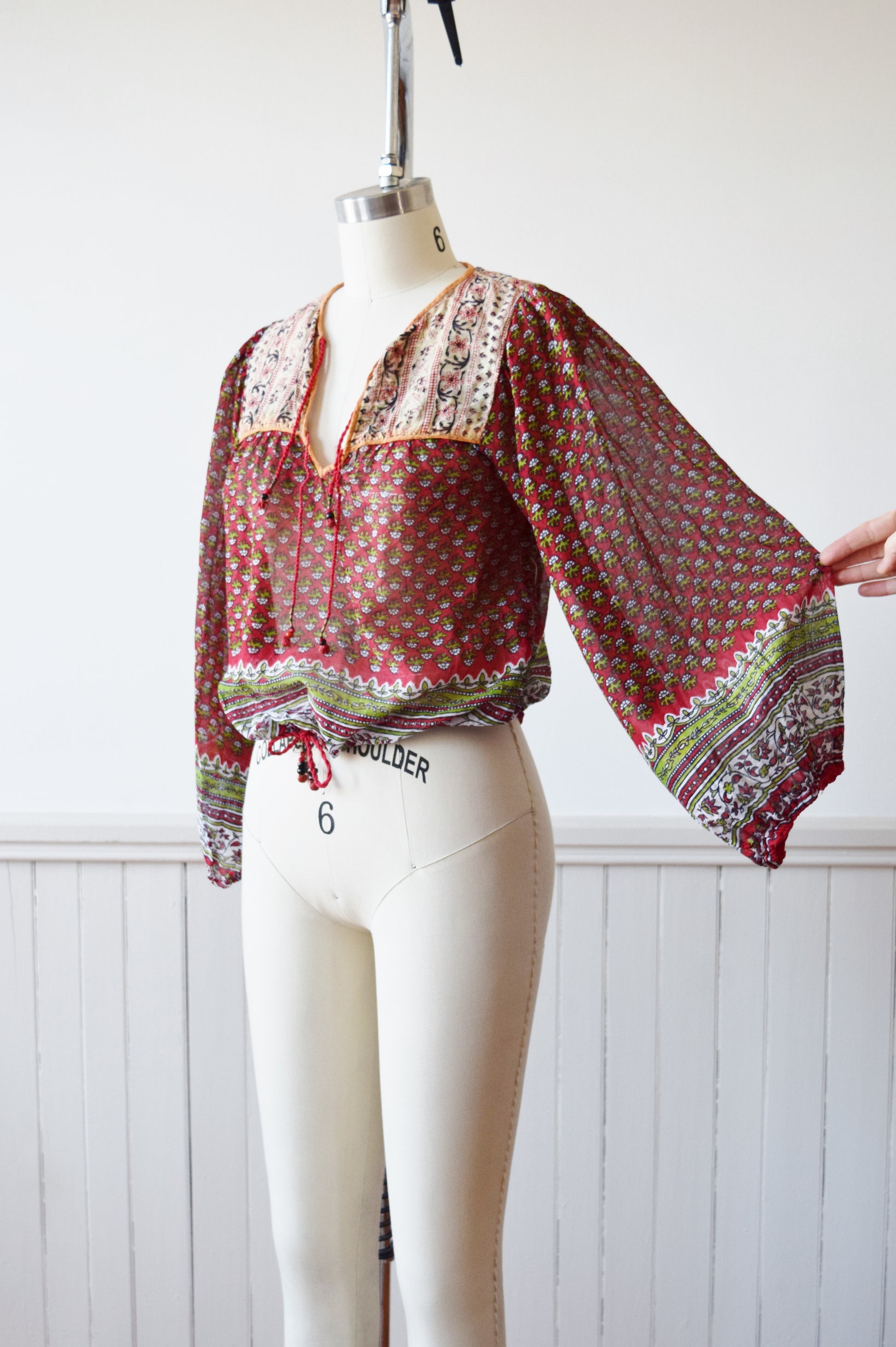 mixed print semi-sheer cotton gauze with yoked shoulders, poet sleeves, and slightly cropped fit that can be cinched at the hem.