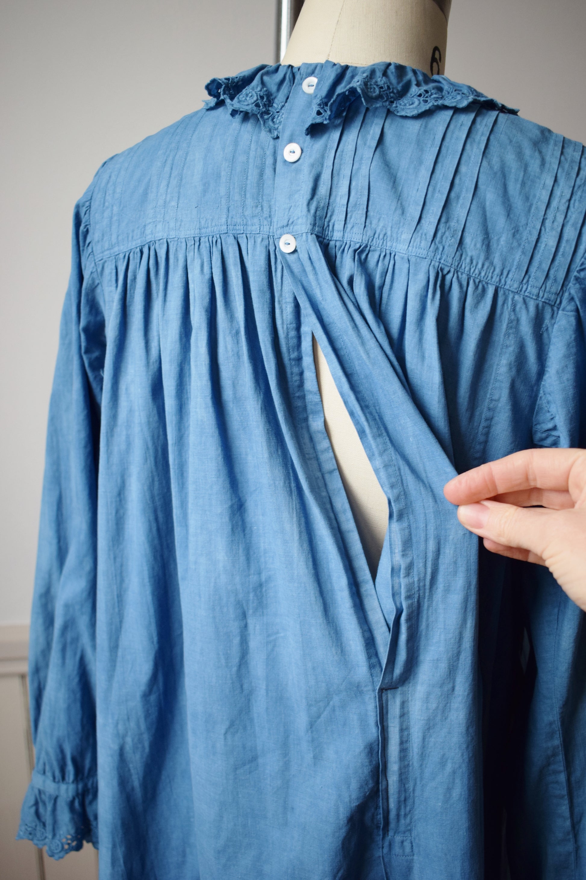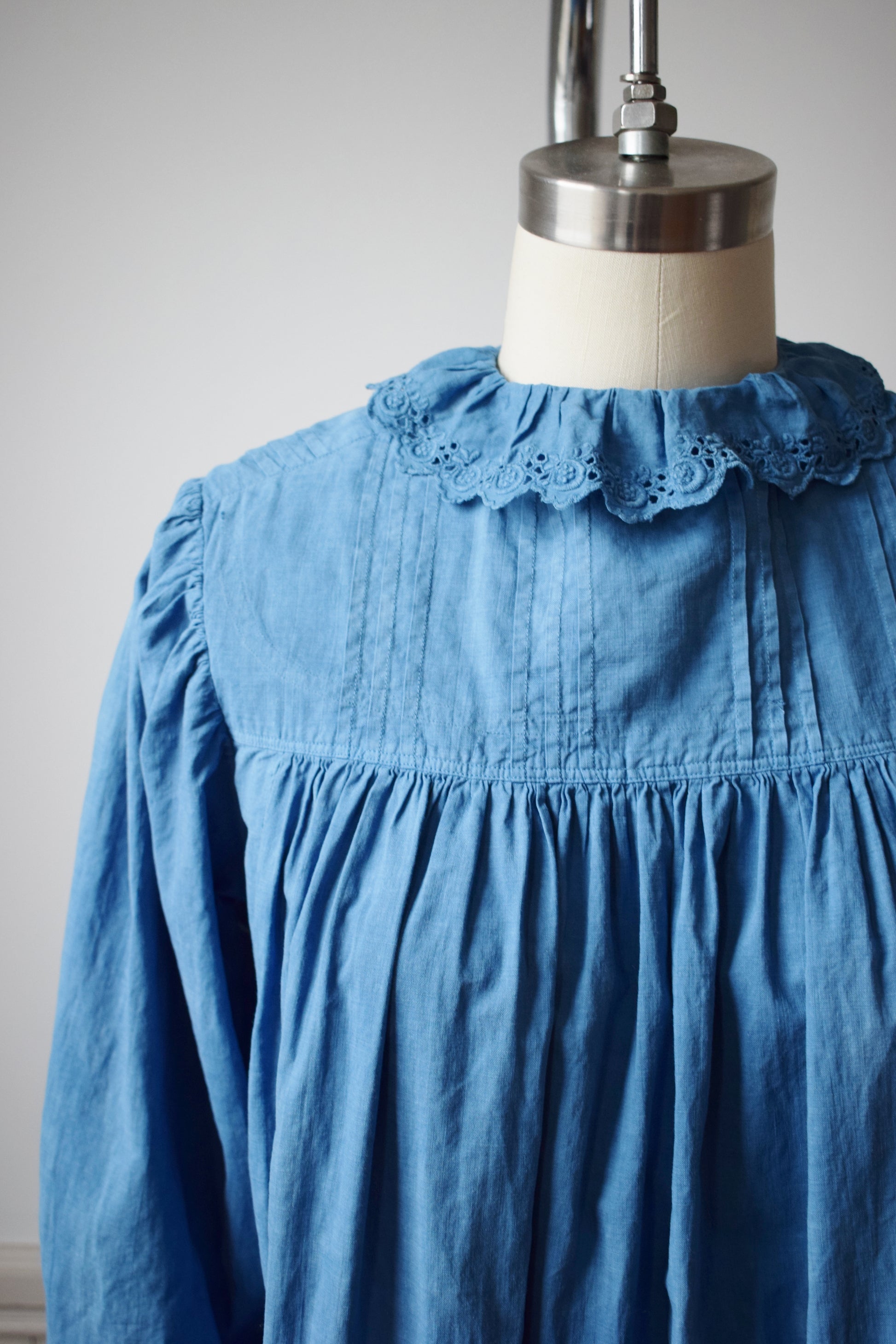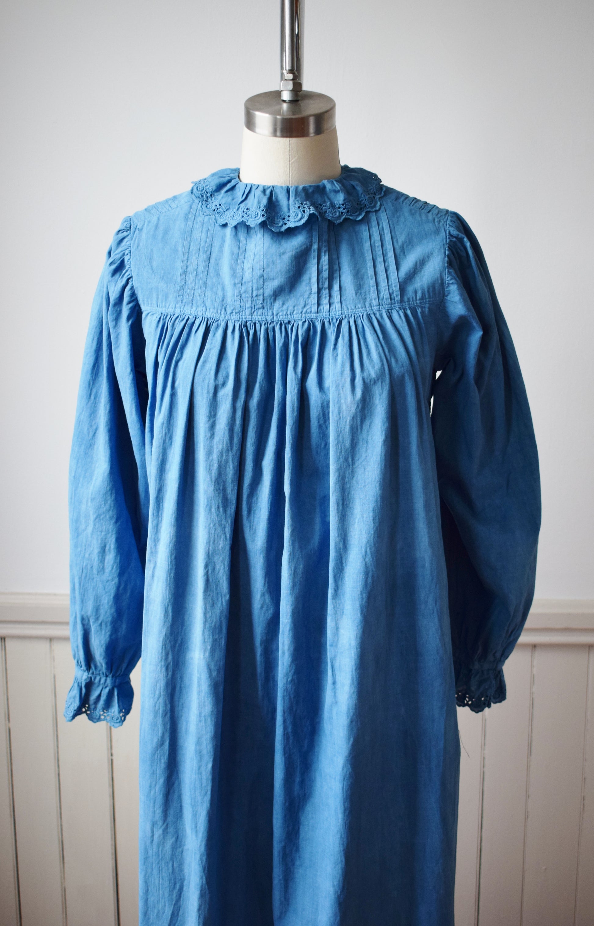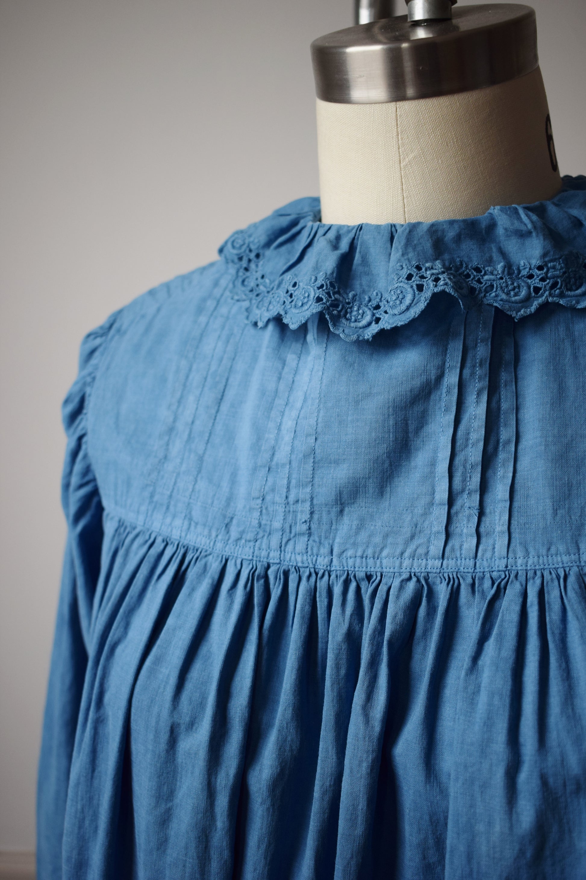 condition: very good. small length of collar was reattached to neckline (not notable when worn). a previous owner opened the wrists somewhat crudely (I'm guessing the original wrists may have been narrow). I left the slits, but sewed down the raw edges to give them a more finished look, see image. there's a line of ghost stitches around the shoulders, I guess possibly a lace or ribbon detail that was removed at some point. expected wear for an everyday garment such as this. carefully rinsed and washed to prevent color loss. Some mottled toning and slight variations to dye, one dark mark as photographed. We recommend washing our indigo dyed pieces on a cold, gentle setting with a natural ph neutral detergent with like colors (gentle hand wash works too!), and air drying out of direct sun to best preserve the natural color.