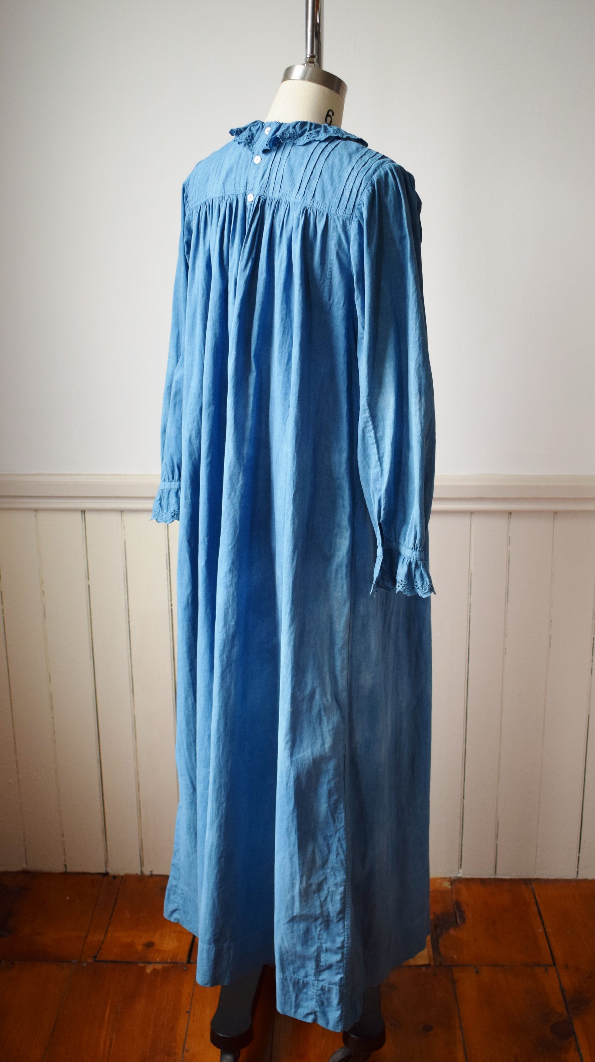 simple + sweet antique cotton nightgown (dress) with pleated and yoked bodice, eyelet ruffle trim at neck and cuffs, and three-button closure with open slit. wear in the back or front.